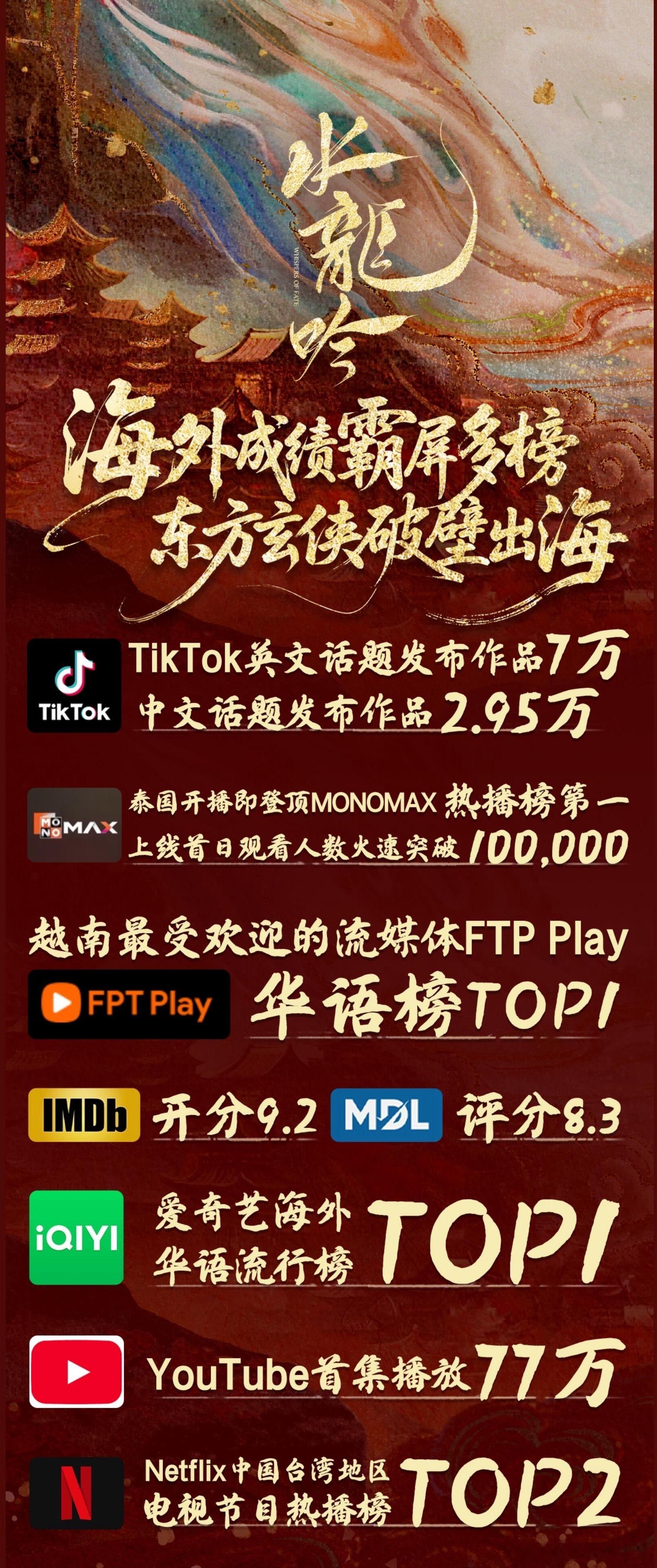 无水军造势,无恶意针对, 不靠营销堆砌,全凭作品说话!罗云熙《水龙吟》海外成绩亮眼,强势登顶多榜榜首,以纯粹东方玄侠之力,成功破壁出海,收获全球瞩目!