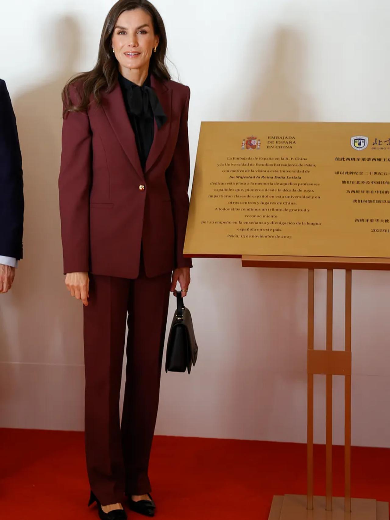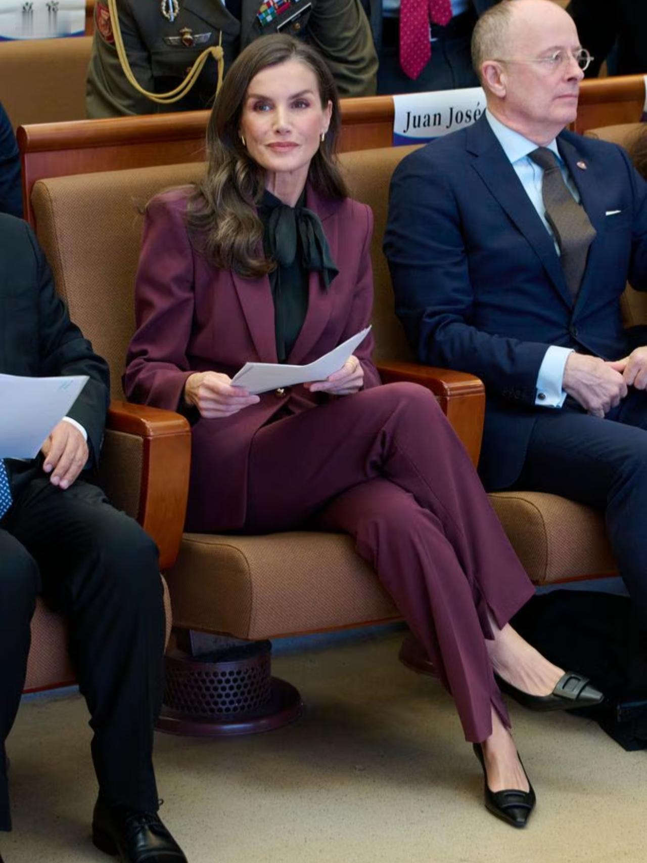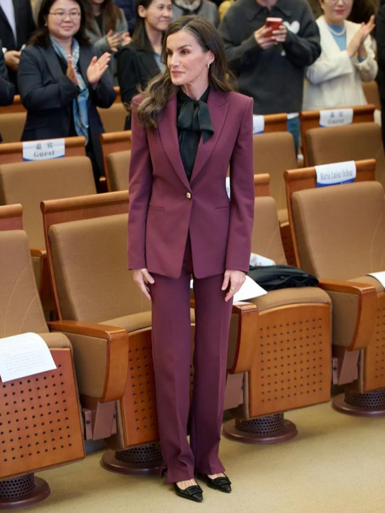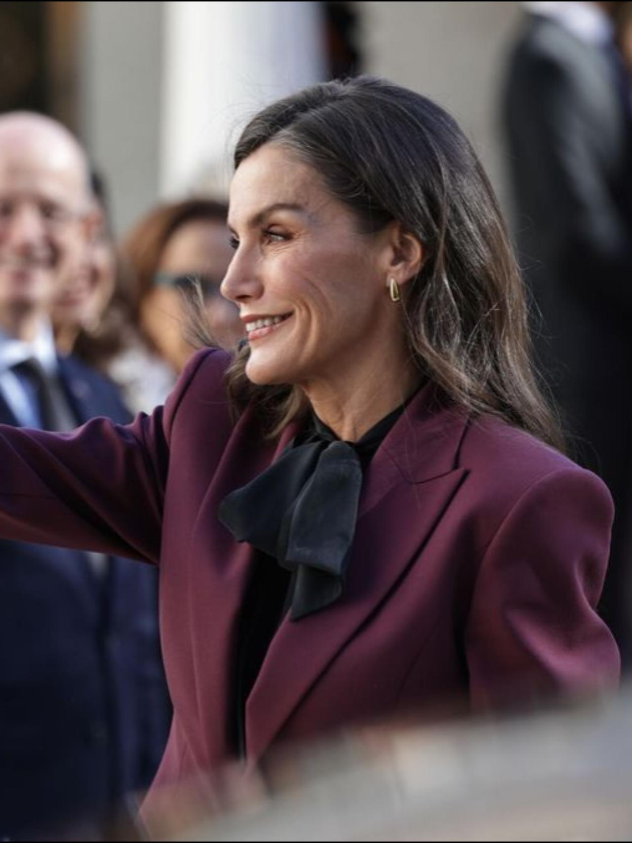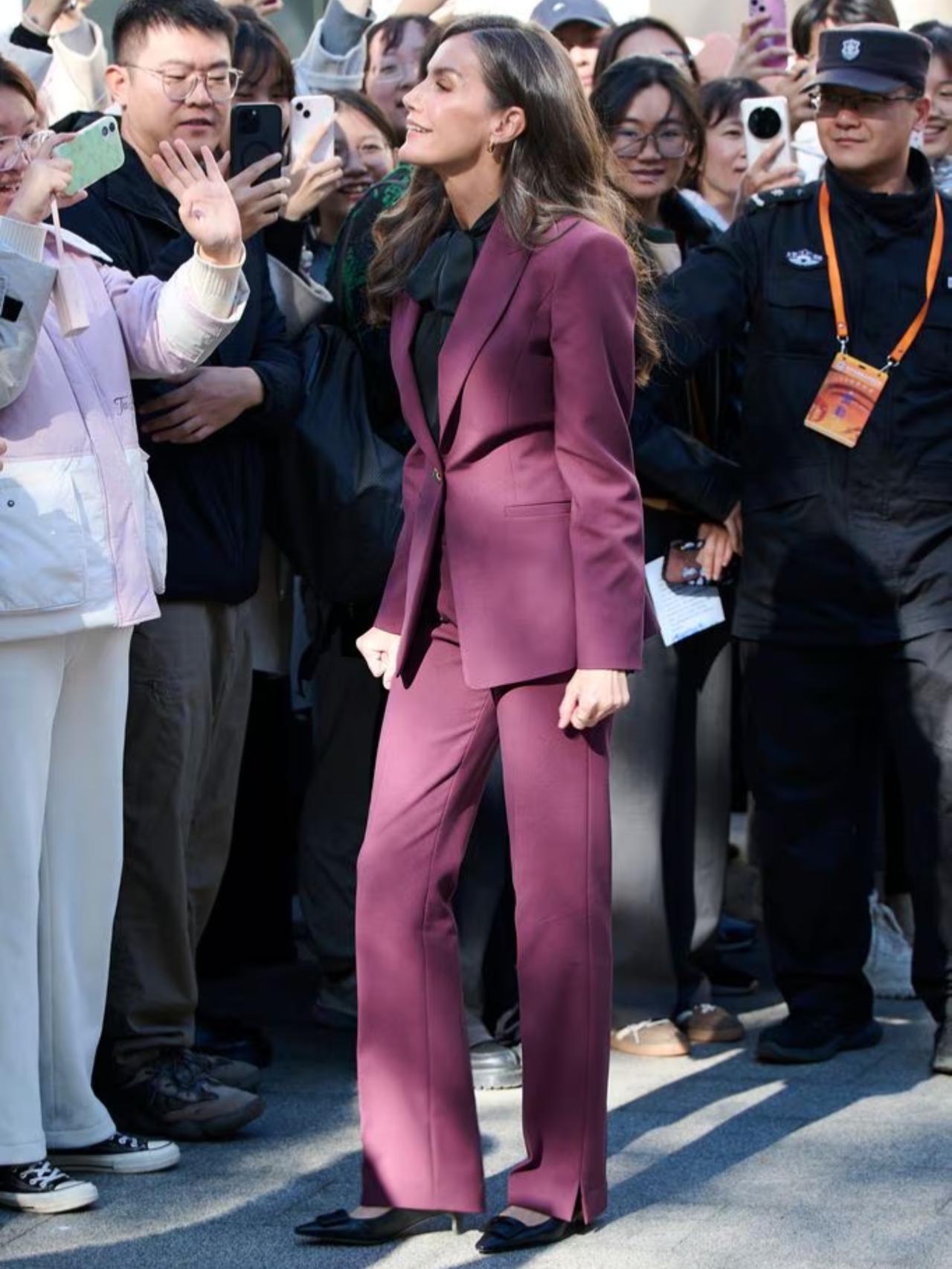 西班牙王后真漂亮,五官360度无死角 莱蒂齐亚王后以精致低调之姿,圆满结束了对中国的国事访问,再度彰显出她将优雅与实用完美融合的非凡能力。此次亮相,她身着一套酒红色套装,内搭黑色蝴蝶结衬衫,脚蹬Magrit高跟鞋,尽显端庄大气。 当天,王后到访北京外国语大学,深切感受到中国学生对西班牙语的炽热热情。莱蒂齐亚王后今天的着装堪称典范,她巧妙依据场合的重要性调整穿搭,始终维持着优雅正式的风格。酒红色夹克剪裁合身,黑色单扣与袖口纽扣相呼应,搭配同色修身长裤,沉稳权威之感扑面而来,完美诠释了王室的优雅风范。