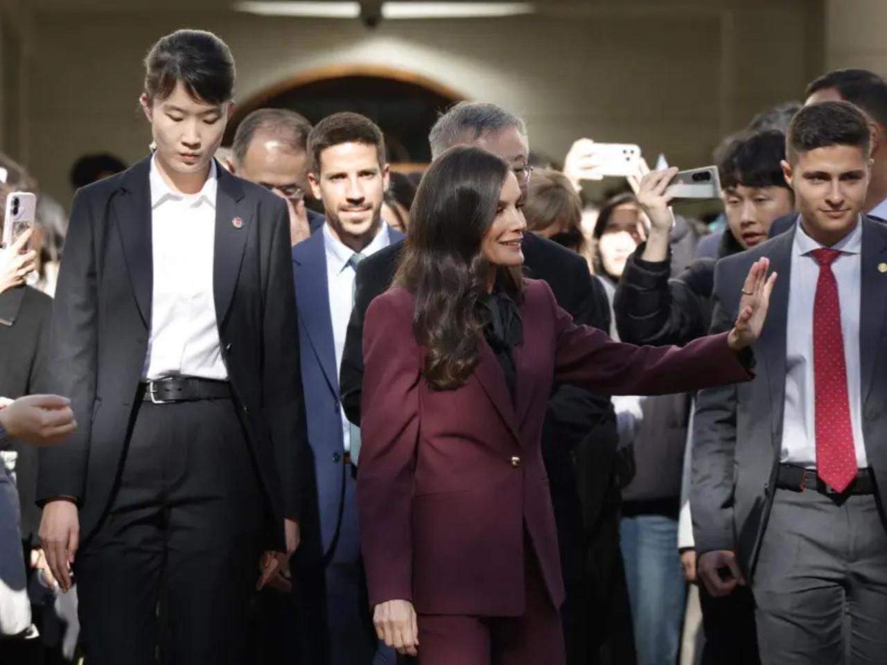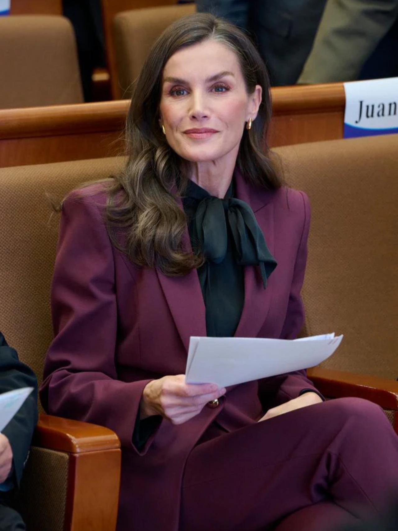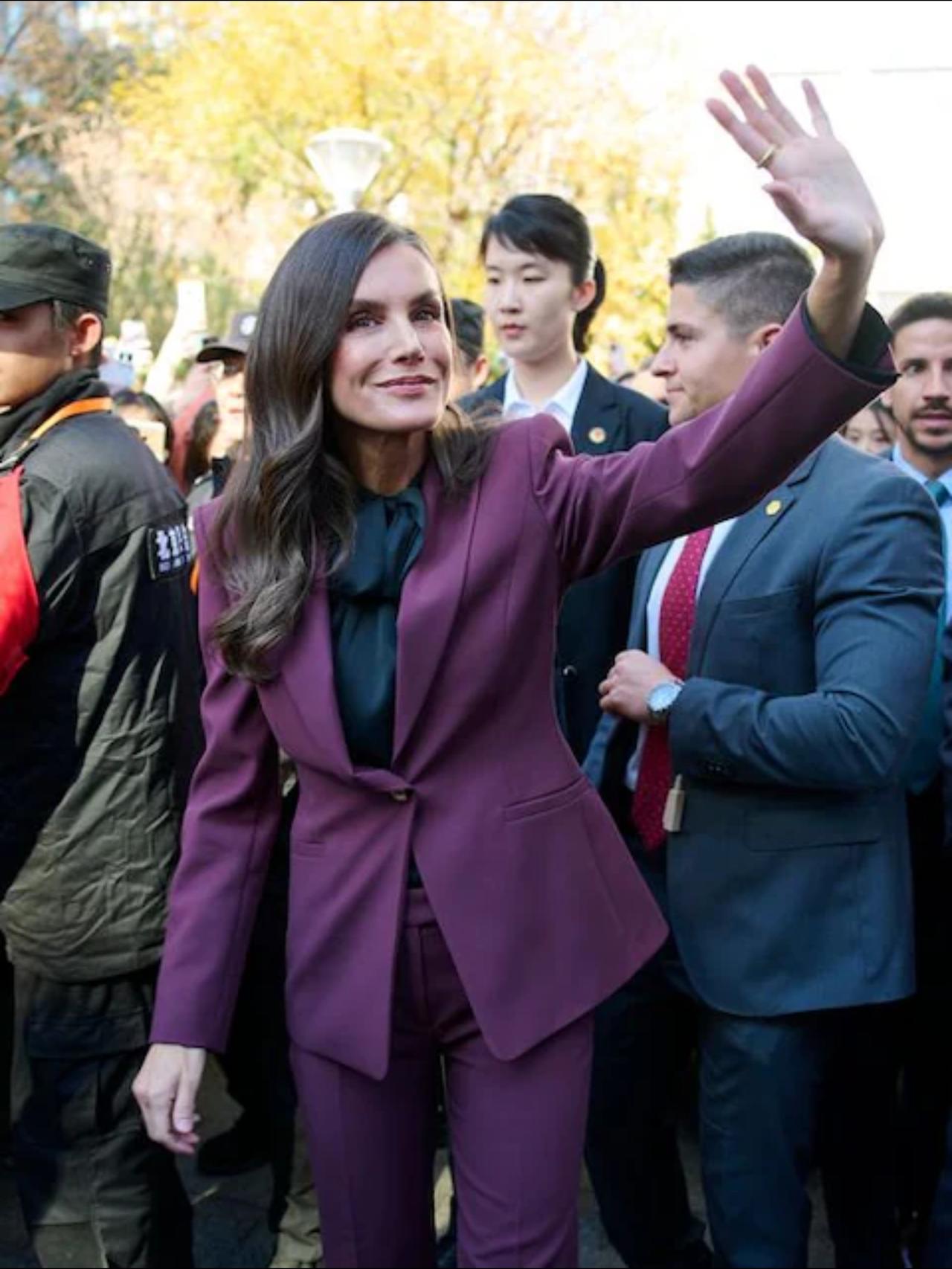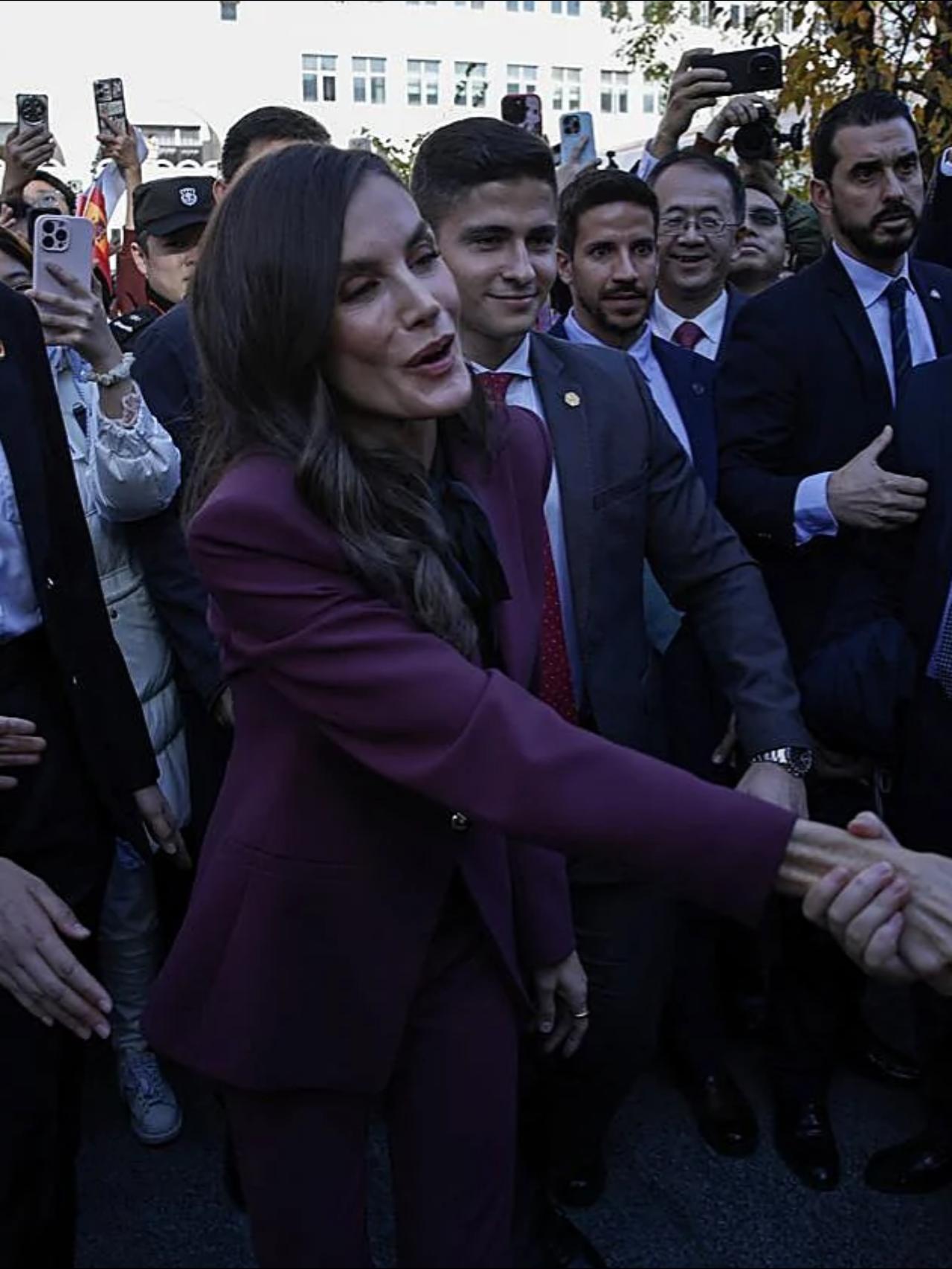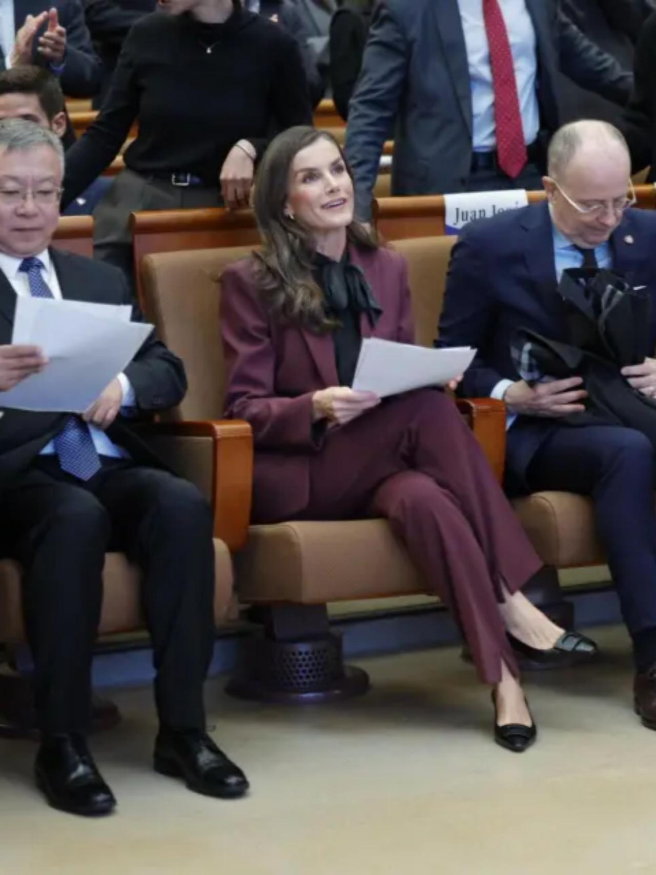 西班牙王后真漂亮,五官360度无死角 莱蒂齐亚王后以精致低调之姿,圆满结束了对中国的国事访问,再度彰显出她将优雅与实用完美融合的非凡能力。此次亮相,她身着一套酒红色套装,内搭黑色蝴蝶结衬衫,脚蹬Magrit高跟鞋,尽显端庄大气。 当天,王后到访北京外国语大学,深切感受到中国学生对西班牙语的炽热热情。莱蒂齐亚王后今天的着装堪称典范,她巧妙依据场合的重要性调整穿搭,始终维持着优雅正式的风格。酒红色夹克剪裁合身,黑色单扣与袖口纽扣相呼应,搭配同色修身长裤,沉稳权威之感扑面而来,完美诠释了王室的优雅风范。