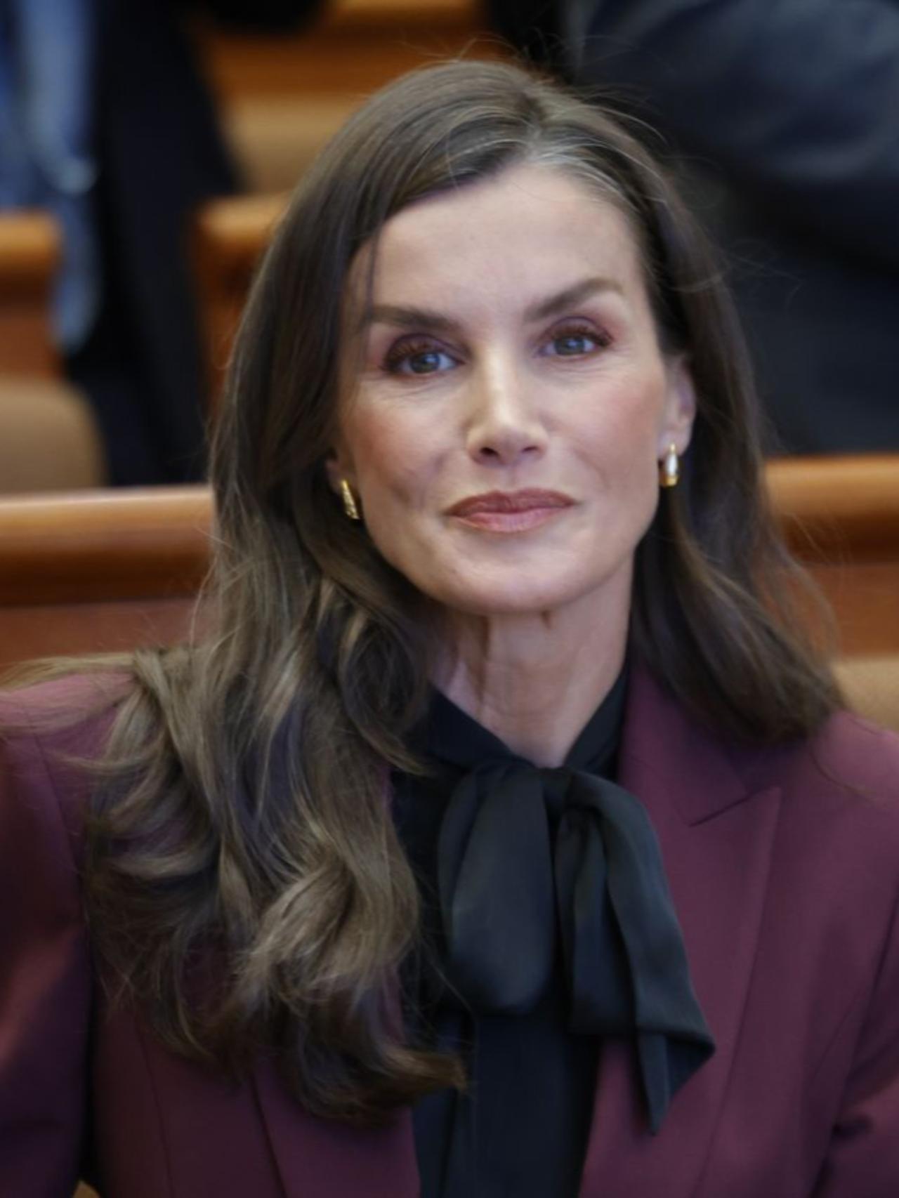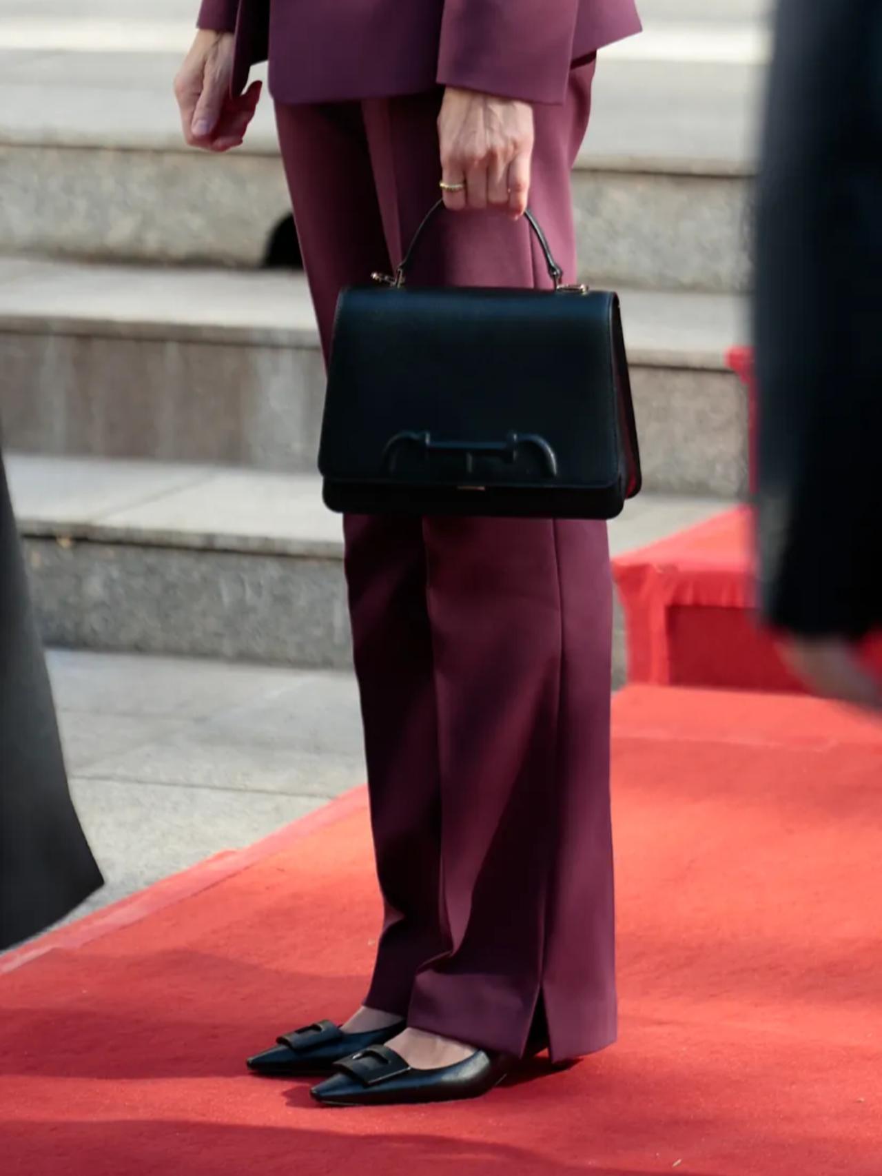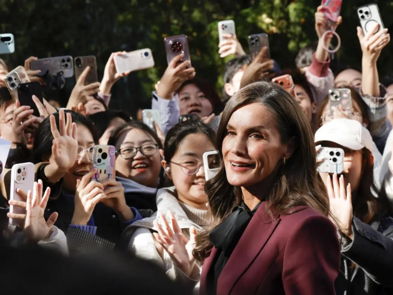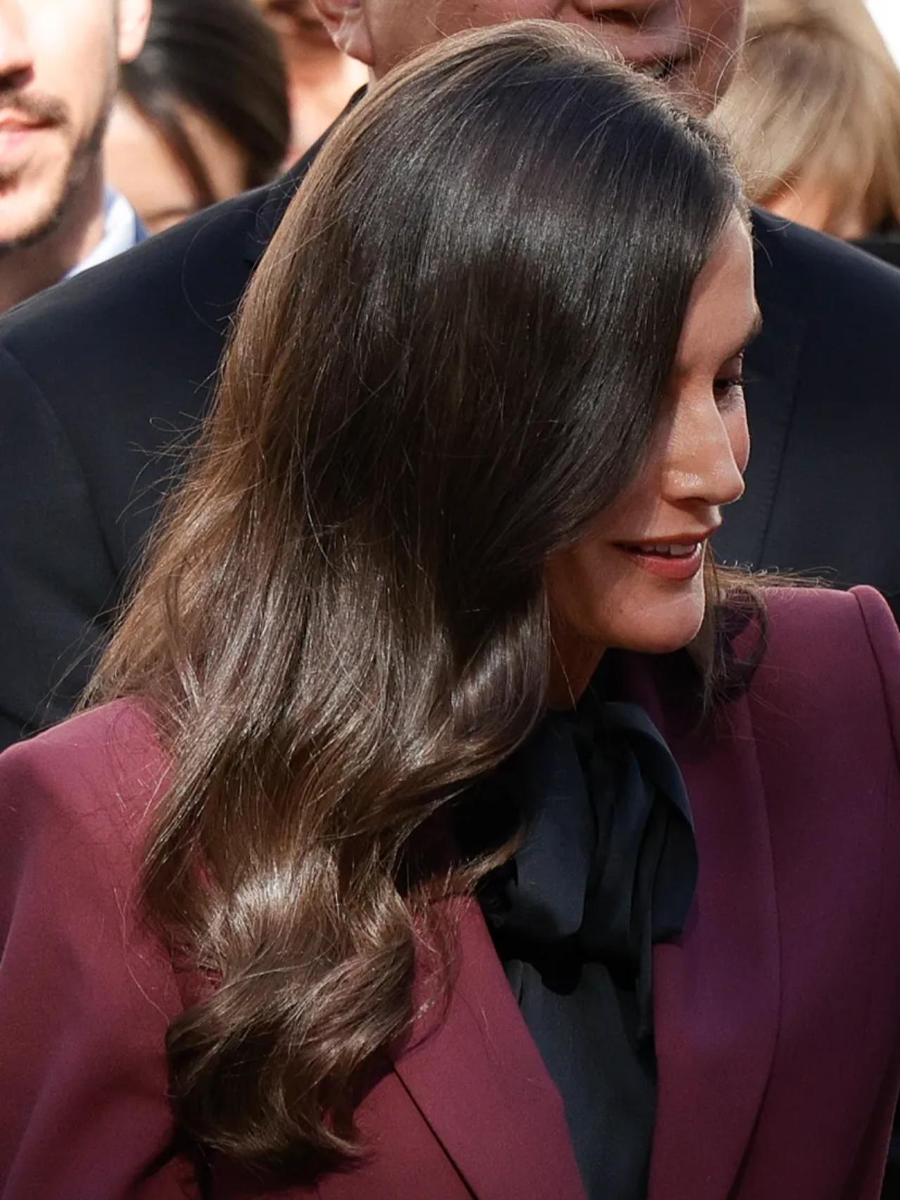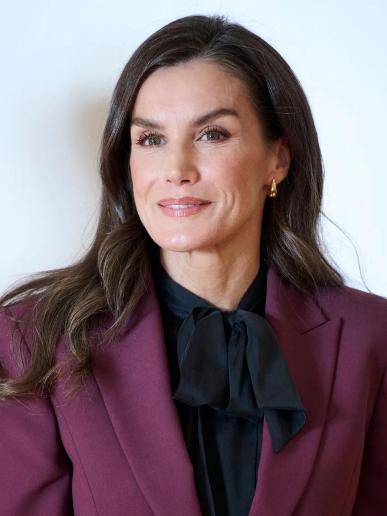 西班牙王后真漂亮,五官360度无死角 莱蒂齐亚王后以精致低调之姿,圆满结束了对中国的国事访问,再度彰显出她将优雅与实用完美融合的非凡能力。此次亮相,她身着一套酒红色套装,内搭黑色蝴蝶结衬衫,脚蹬Magrit高跟鞋,尽显端庄大气。 当天,王后到访北京外国语大学,深切感受到中国学生对西班牙语的炽热热情。莱蒂齐亚王后今天的着装堪称典范,她巧妙依据场合的重要性调整穿搭,始终维持着优雅正式的风格。酒红色夹克剪裁合身,黑色单扣与袖口纽扣相呼应,搭配同色修身长裤,沉稳权威之感扑面而来,完美诠释了王室的优雅风范。