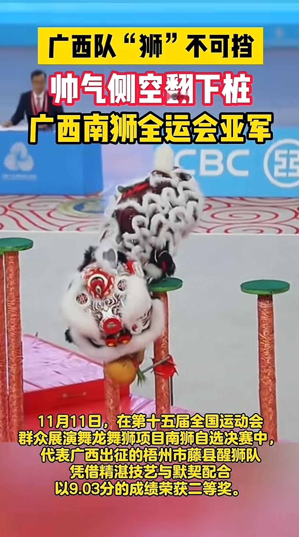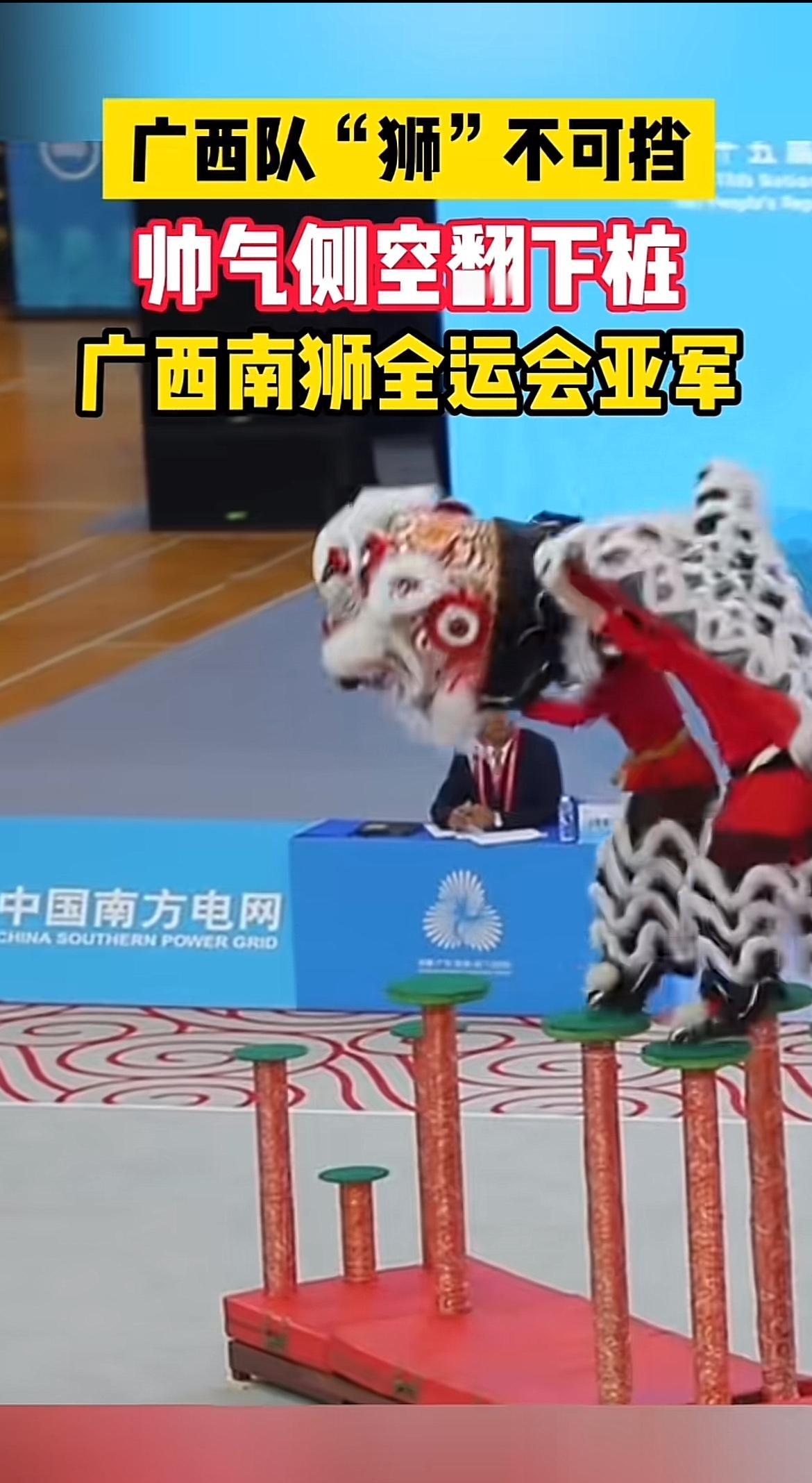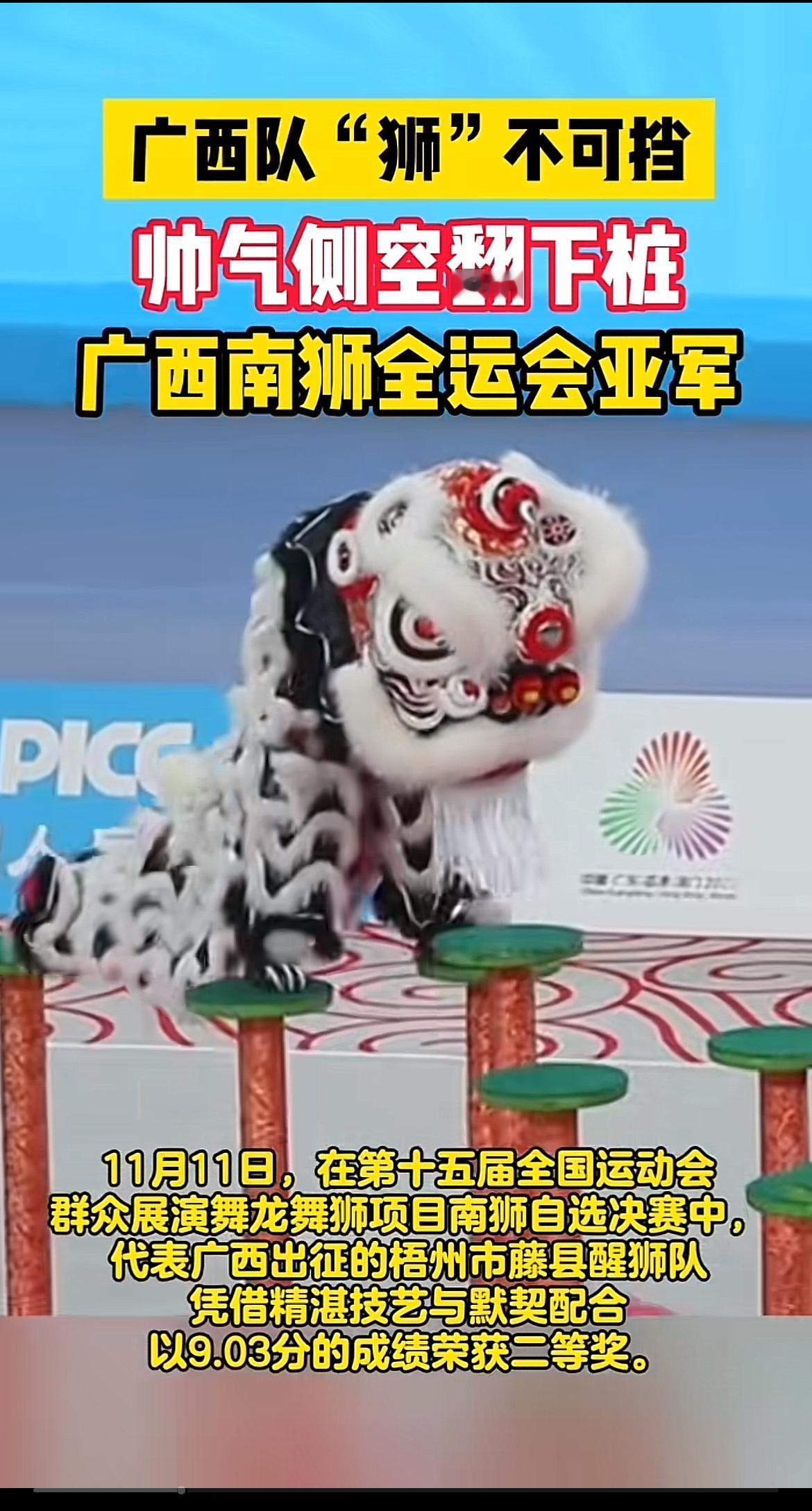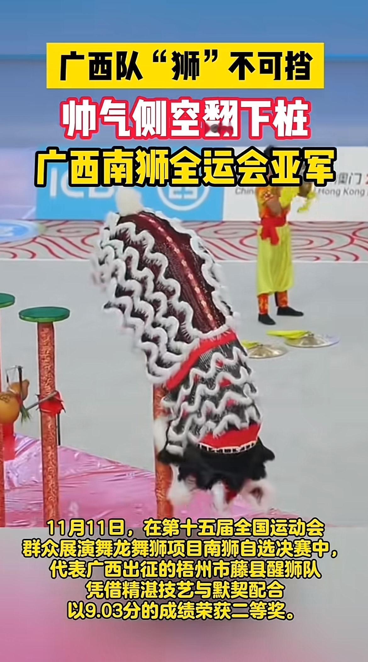 广西队在全运会上简直“狮”不可挡!11月11日,梧州市藤县醒狮队代表广西出征全运会舞龙舞狮项目决赛。他们在全国顶尖强队中脱颖而出,以9.03分拿下亚军。现场,队员脚踏梅花桩,完成精准腾跃、450度转体等高难度动作,既惊险又有美感,赢得观众喝彩和评委认可。 其实这支队伍实力一直很强,今年4月就在广西比赛中双冠加身,获得全运会入场券。备战时还融合现代舞蹈元素,提升观赏性。11月12日,广西代表队在南狮障碍项目又获二等奖,广西南狮太牛啦!
