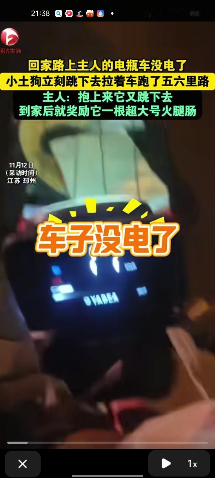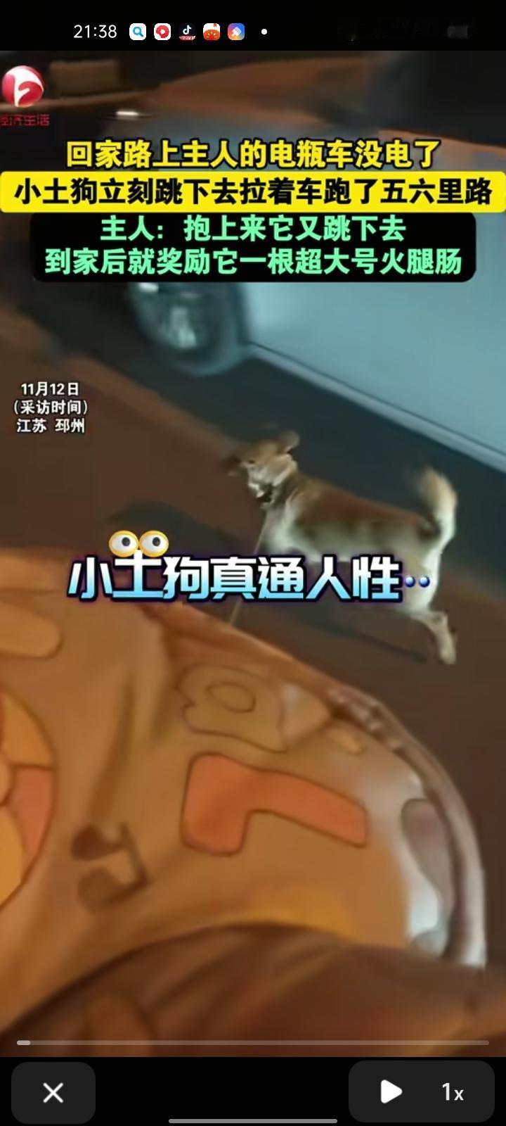 11月11日,徐州邳州市。网友发视频称,回家途中电瓶车没电了,小土狗立即跳下去拉着车跑了五六里路,抱上来它又跳下去 当事人丁先生称,这只小土狗名叫“大宝”,平时比较懒,出门都是呆在电瓶车上不下来,这次却让他很意外也很感动。到家后,就给她买一根超大号火腿肠。