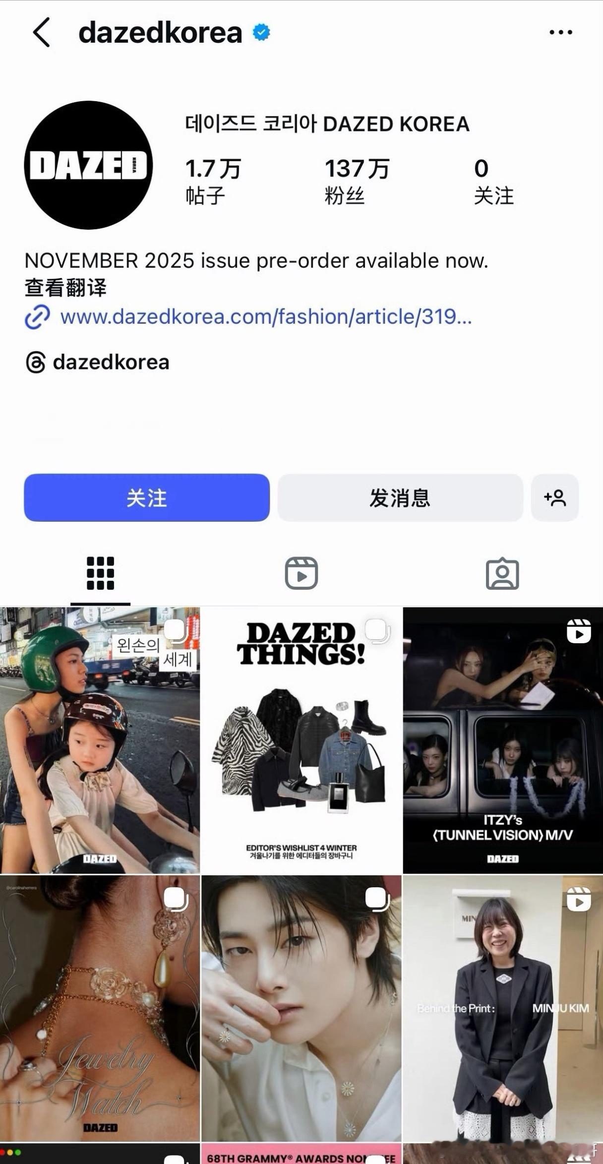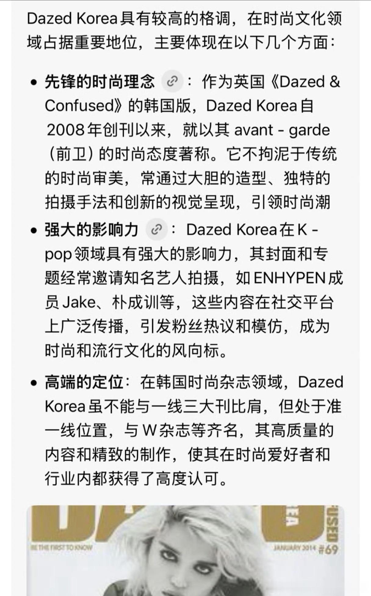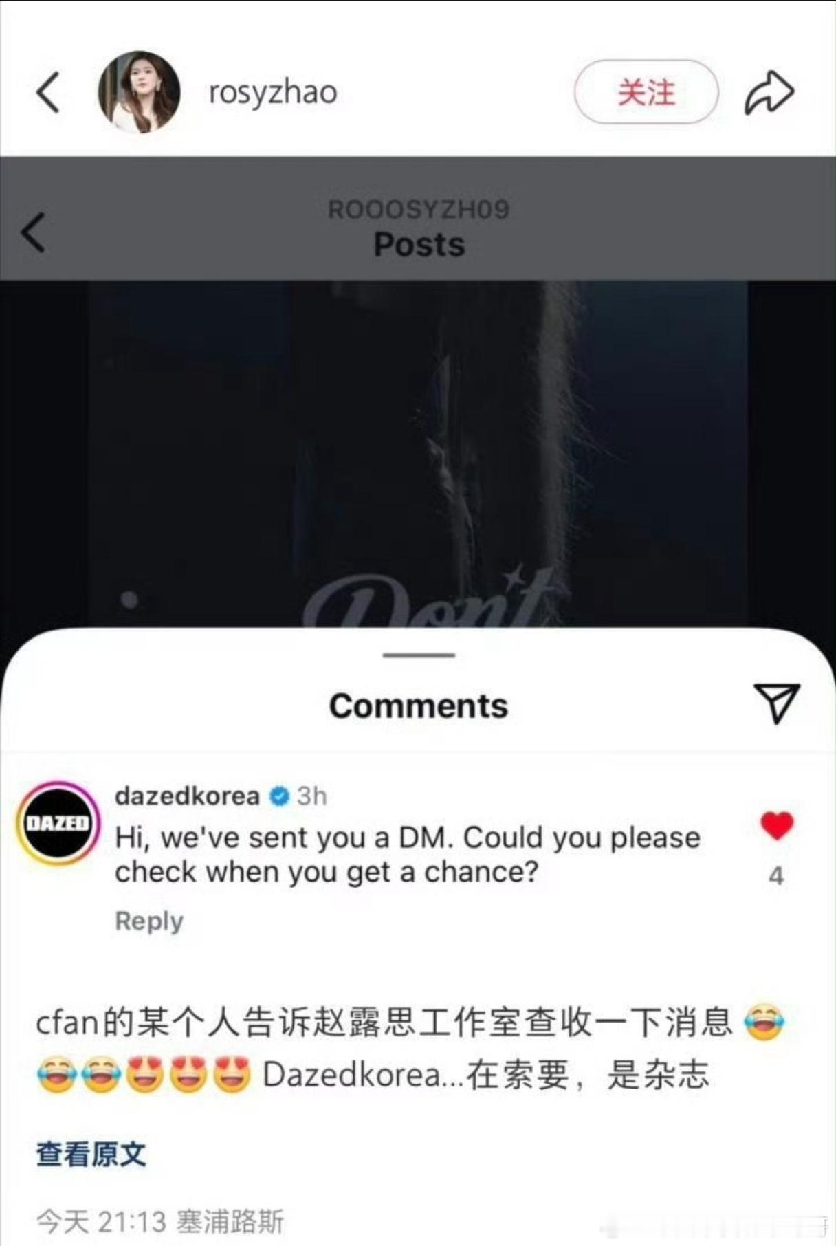 韩国一线与W齐名的杂志《DazedKorea》因为联系不上直接在赵露思ins下