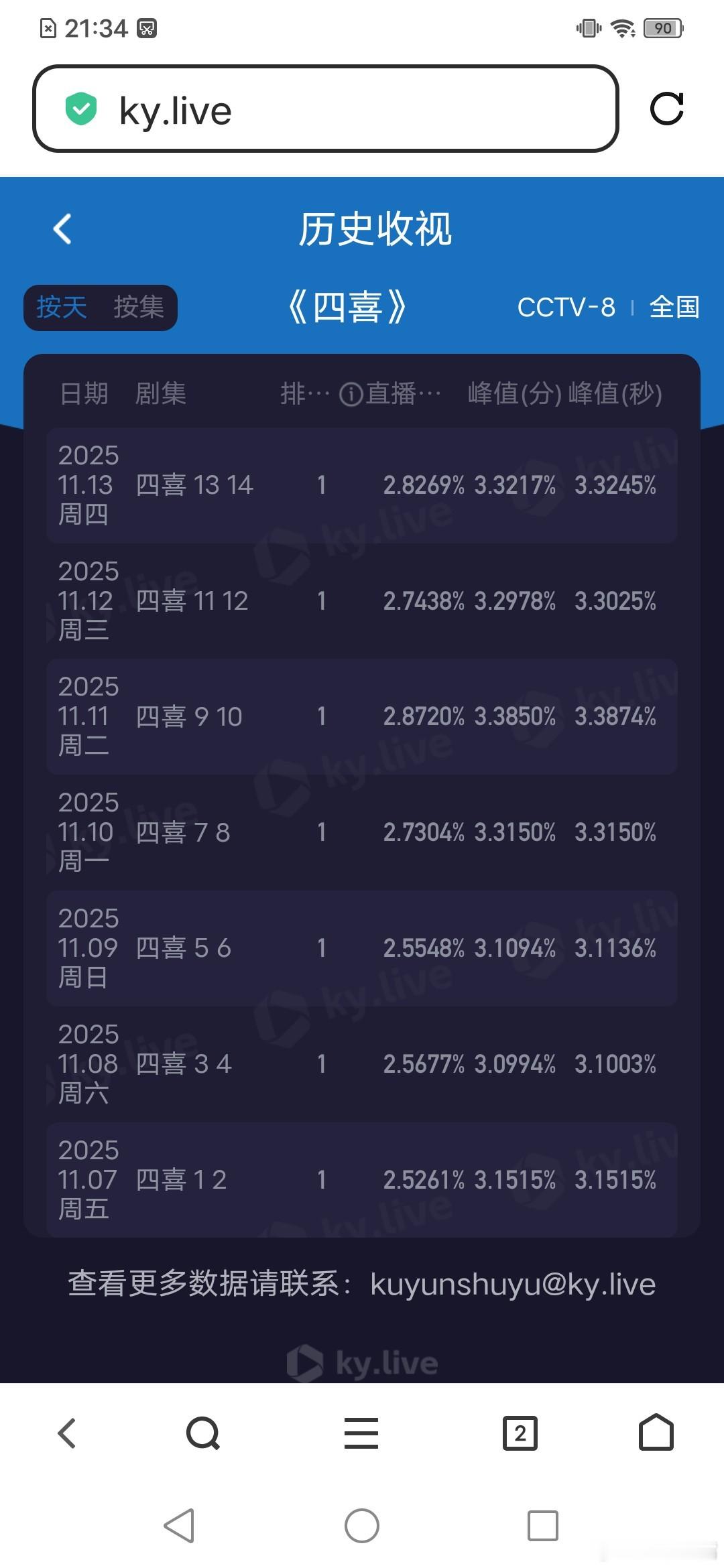 《四喜》今晚酷云收视又涨了!单天平均2.8269,峰值3.3245,均暂列开播以来第二位!今晚cvb估值:2.8269×0.82=2.318
