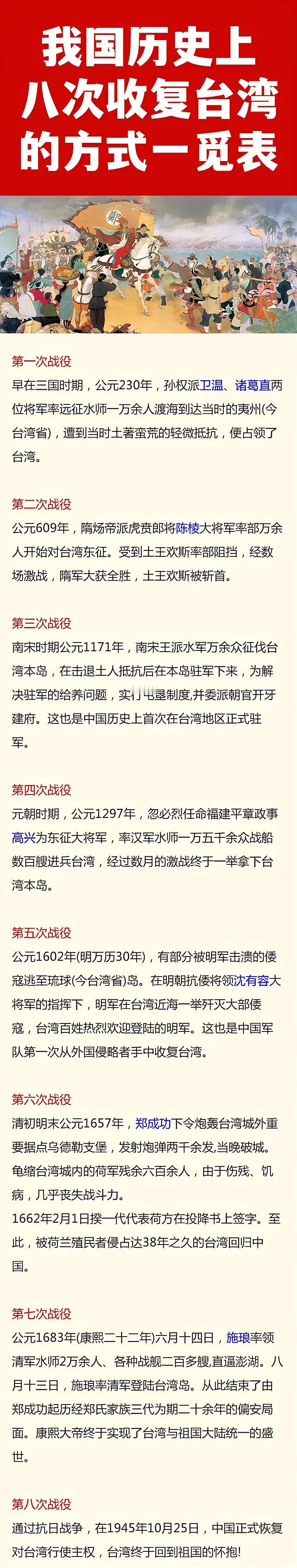 前八次是收复,第九次不是收复台湾,而是解放台湾。 收复和解放是不一样的,收复是从外族人手中拿回来。 就像收复香港是从英国人手中拿回来,收复澳门也同理。 最近,新上台的日本女首相语不惊人死不休。 狂言如果我们对台湾使用武力,准备介入日本自卫队。 我看他们是又想念原子弹的甜美味道了。 这个姓高的,还是更适合去演他们日本的支柱性产业,不适张嘴说话。 第九次,我们一定会解放台湾,不可能被日本小丑的言论所左右。