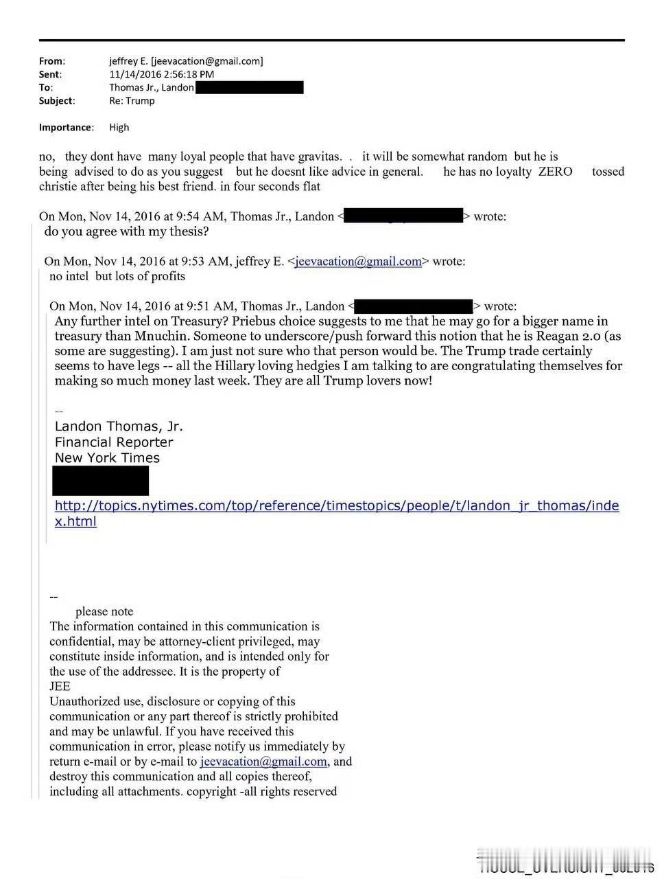 泄露的电子邮件显示,杰弗里・爱泼斯坦在 2016 年大选和特朗普过渡期间,与《纽约时报》财经记者小兰登・托马斯有直接的政治通信往来。 2016 年 2 月 —— 爱泼斯坦与《纽约时报》一位在职记者交流政治分析。 托马斯写道,特朗普 “实际上的不知羞耻对总统候选人来说是一种强大的武器”。 爱泼斯坦回复 “哇哦”,托马斯则说:“你能讲的那些故事……” 2016 年 11 月 —— 爱泼斯坦与同一位《纽约时报》记者讨论内阁人选。 托马斯向爱泼斯坦索要 “关于财政部的情报”,推测特朗普的人事安排,并提到对冲基金 “现在都是特朗普的支持者”。 爱泼斯坦回应称,特朗普 “毫无忠诚度,一点都没有”,而且已经 “在短短四秒内就抛弃了克里斯蒂……” 懂王选择不公开爱泼斯坦文件,看来并非自愿,而是屈从。 #乌克兰停止与俄罗斯谈判##热点解读#
