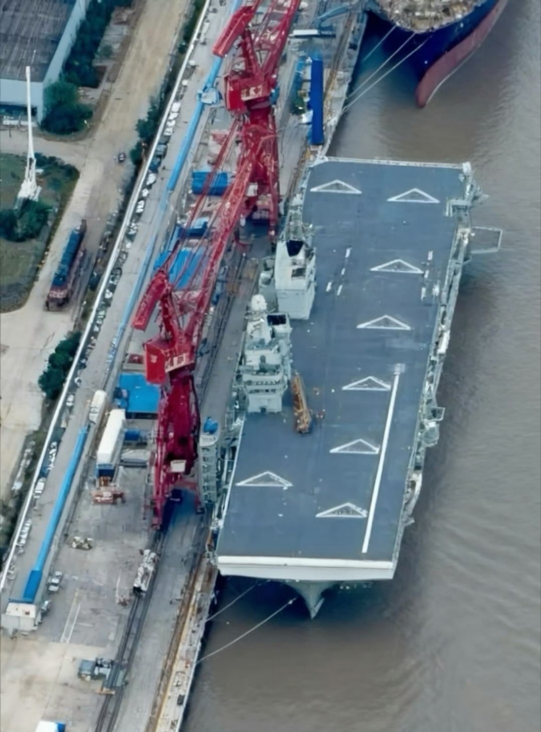 076甲板划线了!总共有8个直升机起飞位,有部分博主认为甲板上的“三角△标志”是给无人机的……其实只是图中的起飞位线没画全,还差个圆圈