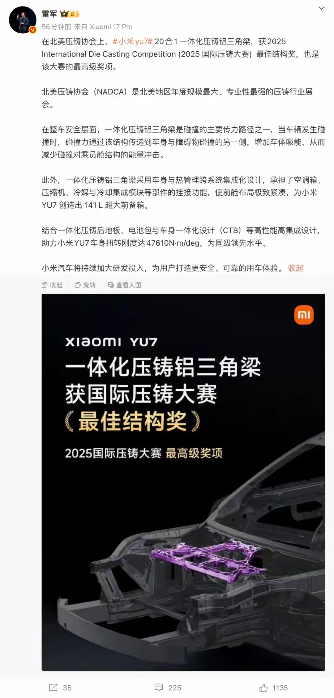 【雷军发布小米获得的奖项,官网查不到咋回事?】 雷军发布了小米YU7获“国际压铸大赛”最高级奖项的消息,但通过豆包AI搜索,在这个奖项主办方“北美压铸协会”的官网上,却查不到,是咋回事?有懂的吗?请指教!