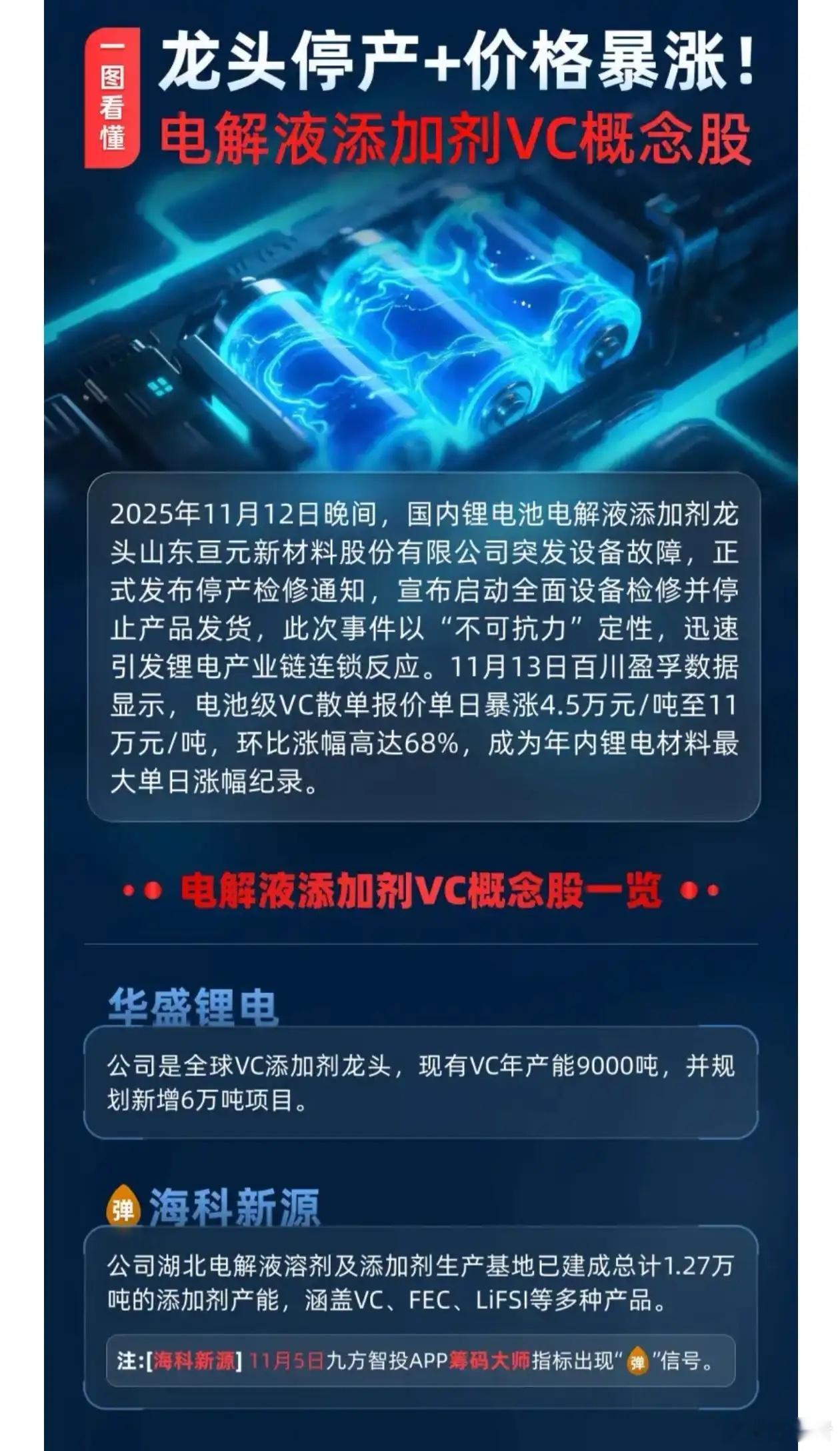 一图看懂《龙头停产+价格暴涨,电解液添加剂 VC 概念股》