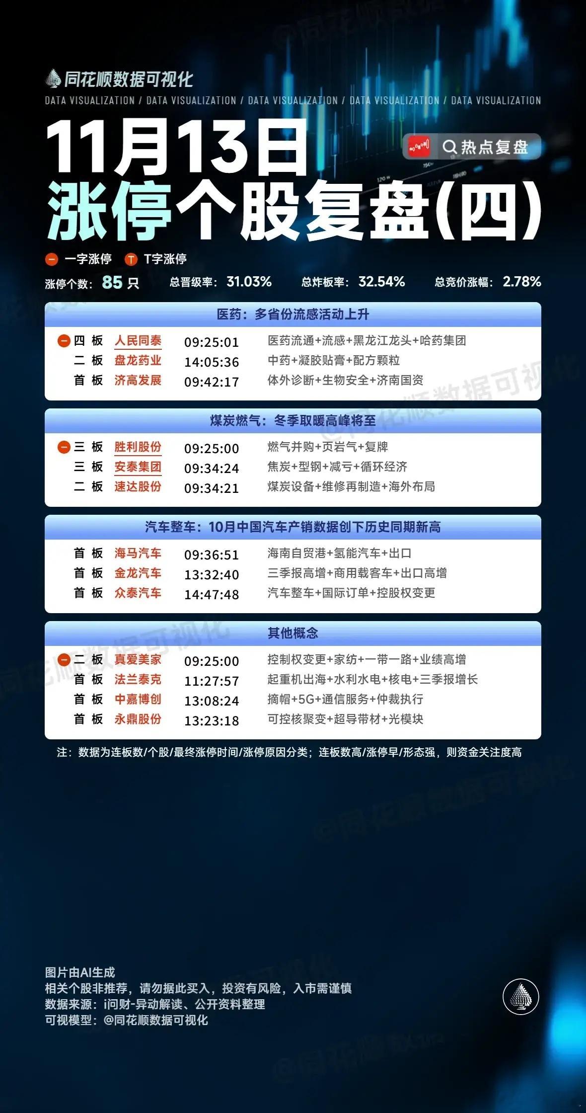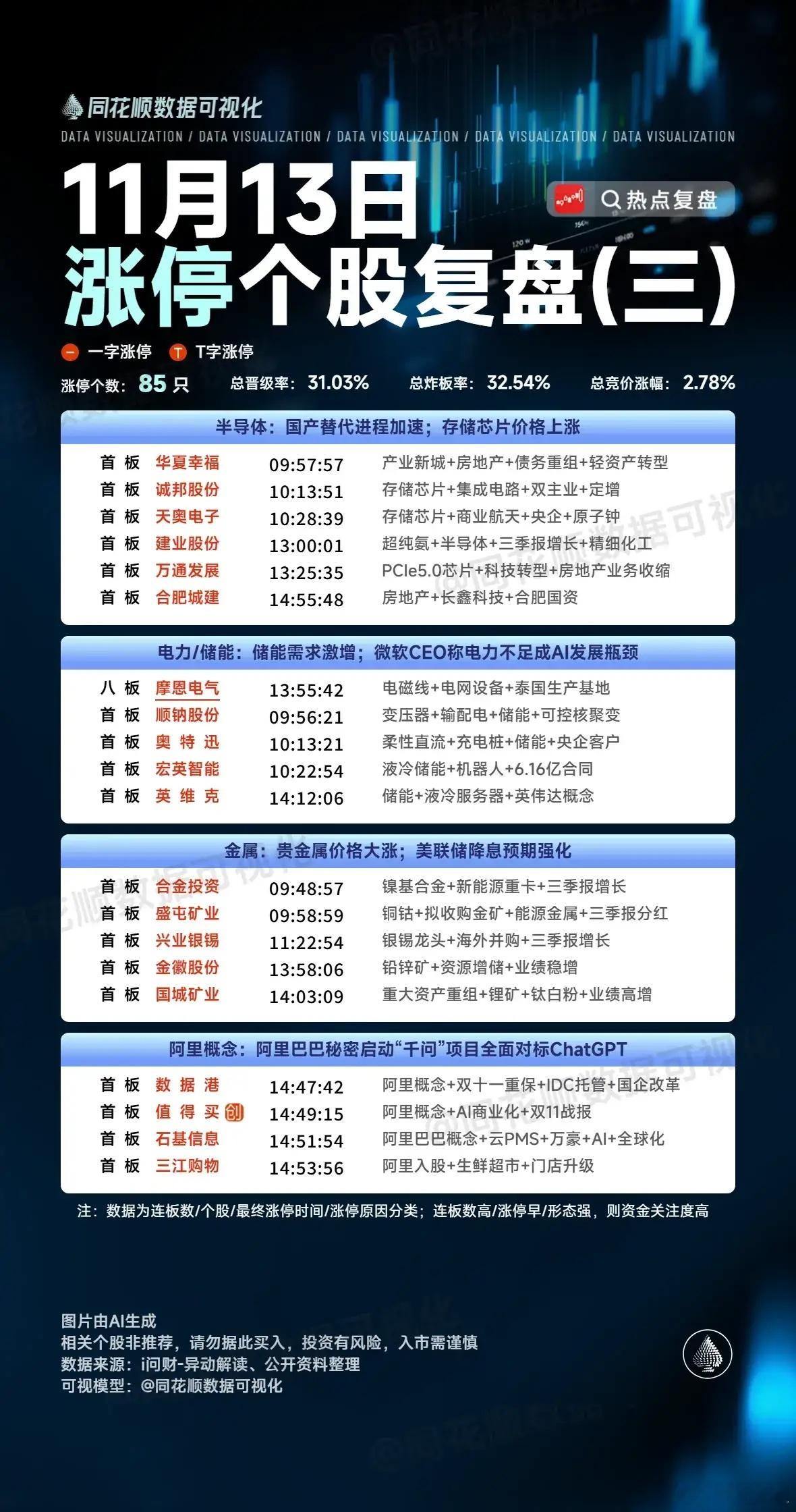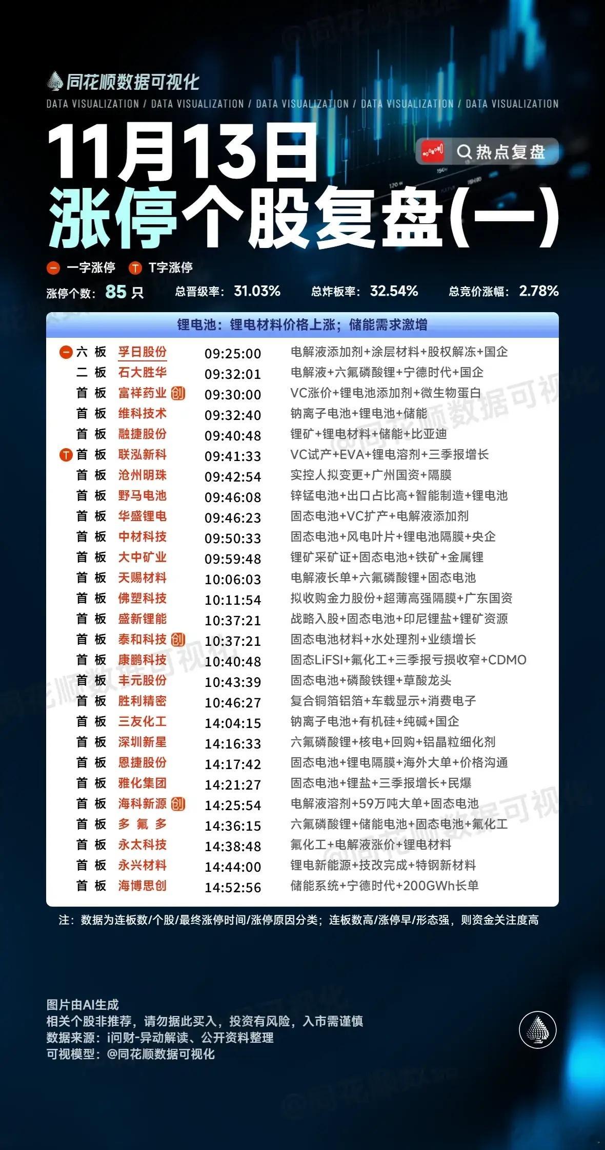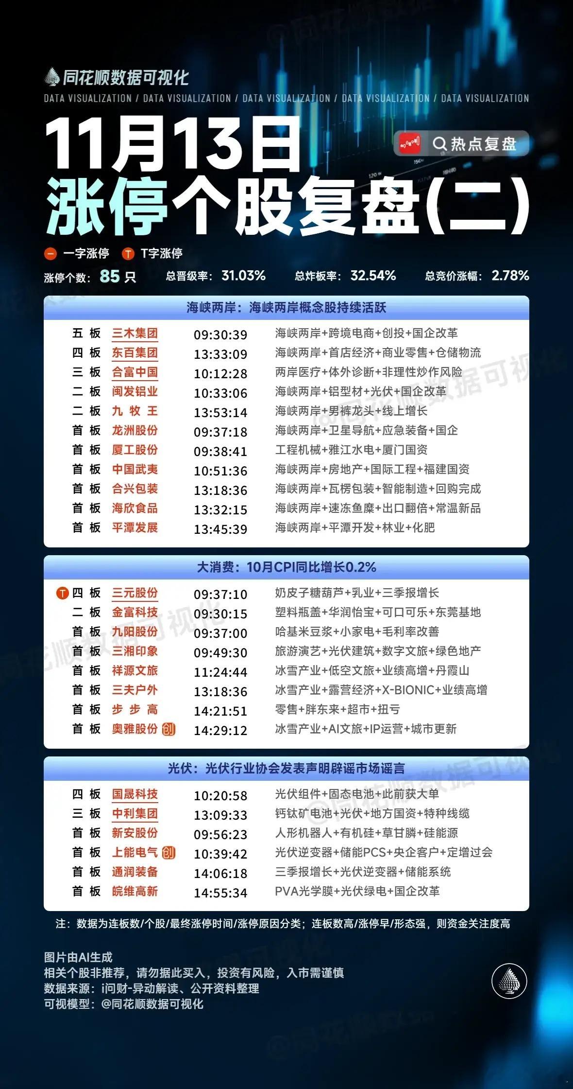 11月13日复盘:平潭发展、合富中国等5股隔日走势展望1. 平潭发展:放量突破助攻跨年龙,隔日溢价有支撑平潭发展早盘竞价偏弱,但仍高于昨日低点8.67元,叠加合富中国竞价正反馈,开盘后跟随拉升翻红,随后延续近期回落套路。不过今日海峡概念具备板块效应,临近11点资金强势介入封板,因属于突破型涨停,获利盘集中兑现导致回封时抛压过大回落;午后伴随市场情绪高潮,资金再次发力封板,虽有反复但最终封死,走出放量突破强势形态。盘后龙虎榜显示,买盘以东方财富席位为主,仅桑田路1家游资入榜,卖盘同样多为东财席位,典型的市场合力做多格局。此前因标的明牌+流通盘扩大,资金更倾向于选择易持续拉升的合富中国,而今日平潭的突破涨停,实则起到助攻合富冲击跨年龙的作用,二者形成伴生关系。展望隔日,该股至少能获得冲高溢价,但能否持续走强,核心取决于合富中国能否进一步强化市场预期。2. 合富中国:缩量连板冲击跨年妖,资金锁仓意图明确合富中国的持续走强,离不开三木集团、同泰股份的连续超强助攻,这两只个股的强势表现为其提供了充足的情绪支撑。近期三连板走势呈现相似特征:竞价符合预期后,资金强承接上板,今日大幅高开后拉升过程中抛压极小,虽板上有少量砸盘但力度有限,早盘即彻底封死涨停,走出缩量连板形态。从走势来看,合富中国已明确向跨年妖股发起冲击,断板后连续涨停的表现,凸显资金合力做多的强烈意图,连续3个涨停过程中抛压始终不大,龙虎榜虽呈现散户合力特征,但核心逻辑是多路资金默契锁仓、惜筹。今日早盘封板后多次撤单承接,本质是骗筹走势,叠加短线情绪向好、午后平潭发展涨停助攻,隔日持续强势概率极高。除非交易所出台强制措施,否则该股后续炒作延续性较强,而竞价表现将直接反映资金态度。3. 多氟多:良性换手突破首板,趋势上行概率大受利好消息刺激,孚日股份早盘超预期一字涨停,带动多氟多走强。该股昨日尾盘拉红后回落,今日竞价低开2个点后迅速强势拉升,高位横盘至午后,伴随市场情绪高涨完成封板,走出超强突破首板。盘后龙虎榜显示,新闸路、北京西直门等游资大幅买入,买盘还包括深股通、机构及量化资金,卖盘以机构和量化做T为主,属于良性换手榜单。多氟多此前以机构主导为主,在氟化工板块高潮背景下,游资接力符合预期,且该股在板块内辨识度极高。尽管当前位置连板难度较大,但趋势上行是大概率事件;今日氟化工方向全面高潮,隔日至少前排标的具备持续性,作为板块辨识度前排,多氟多的冲高溢价有充分保障,但若板块热度退潮,其连板可能性极低。4. 天赐材料:突破首板获游资助攻,博弈趋势中军机会作为前固态电池龙头,天赐材料早盘高开后迅速被资金拉升上板,封板质量强劲,走出突破首板形态。盘后龙虎榜显示,华林北京分公司、国投朱雀、徐晓等游资大幅买入,买盘还涵盖深股通及机构,卖盘多为前期潜伏盘兑现离场。这一榜单背后,是部分游资避开氟化工近期妖股、选择另起主线做多天赐材料的逻辑。在板块情绪高潮背景下,该股隔日至少具备博弈溢价的空间;但考虑到其流通盘偏大,连板概率较低,且可转债溢价率偏低也会抑制股价上涨。不过相较于多氟多,天赐材料近期处于相对低位,若板块情绪维持,不排除资金将其打造成趋势龙头,能否稳住趋势、走出持续性,是其能否成为板块中军的关键看点。5. 永太科技:弱转强反包但分歧较大,隔日预期有限永太科技今日竞价高开近4个点,表现远超天际股份,弱转强特征显著。开盘后冲高,但因连续高换手导致资金不愿主动封板,以高位横盘放量为主;午后虽有资金尝试封板,但与昨日炸板类似,很快因强分歧下杀,后续伴随大盘破前高后跳水进一步回落,尾盘随大盘回暖尝试回封但仍遭炸板分歧,最终在多氟多封死涨停后跟随回封,走出放量反包形态。盘后龙虎榜显示,多个游资席位入场接力,但买二滨海二路为长期潜伏盘做T,卖盘则以机构席位为主。该股此前由机构主导,如今游资接力导致机构大幅卖出,榜单质量难言优质;叠加今日涨停过程反复、属于“烂板”,隔日预期相对较低。不过若氟化工板块持续强势,仍有望获得冲高机会,但想要再次延续强势走势,难度较大。