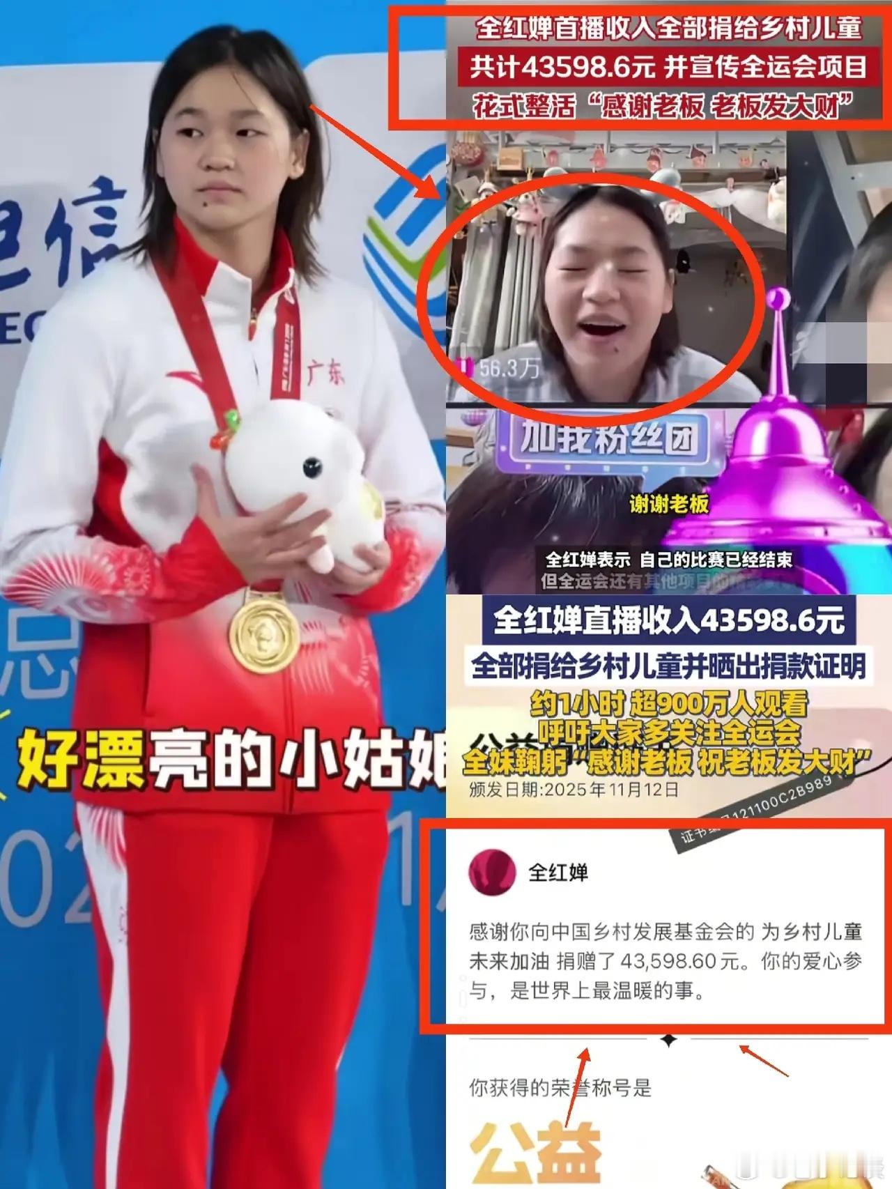 我有个预感全红婵粉丝要变了不是变得不喜欢,而是全红婵昨晚的行为不得不让更多人更加喜欢!“全妹”直播观看人数高达960万,在线观看人数达80万,那满屏的飞机火箭加大炮,让人叹为观止,那场面相当炸裂,果真不简单呐;全红婵也身贫困家庭走出来的,本以为直播收到这么多打赏可能会被人做文章,不曾想全红婵的思想境界高度,非常人难以企及;直播完所得全部打赏共43598.6元,全红婵全部做了慈善捐给乡村儿童,不愧是为国争光的“天才少女”;个人认为全红婵值得所有人学习,慷慨捐赠是亿万人民学习楷模,比起现在某些网红打PK每天赚很多钱,只顾吃喝玩乐简直是没有可比性;婵宝也是贫困家庭走出来的,对于穷人家的孩子来说,一路凭借自己不懈努力来回馈社会是最值得点赞的!大家觉得呢?