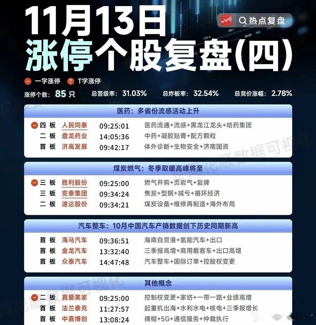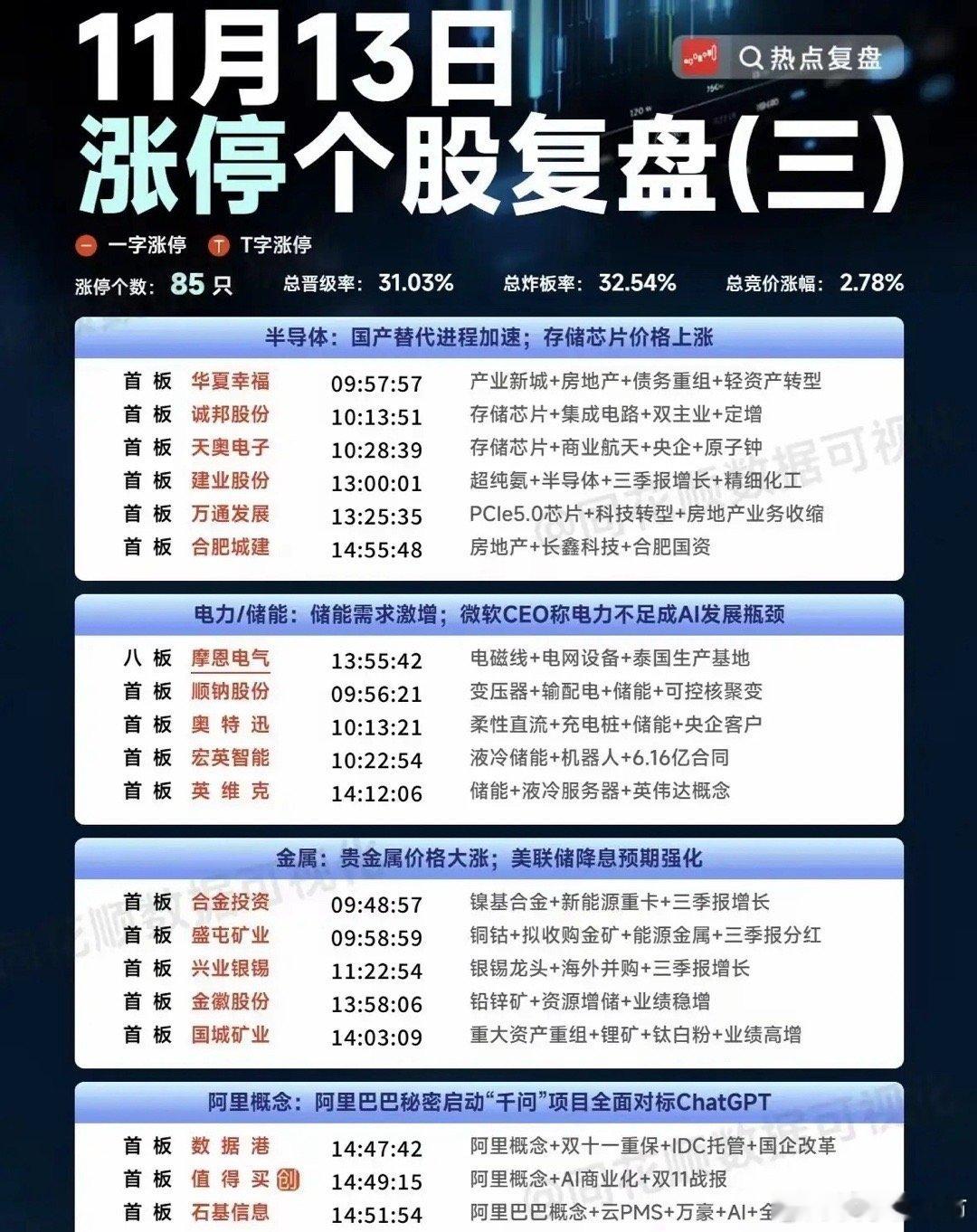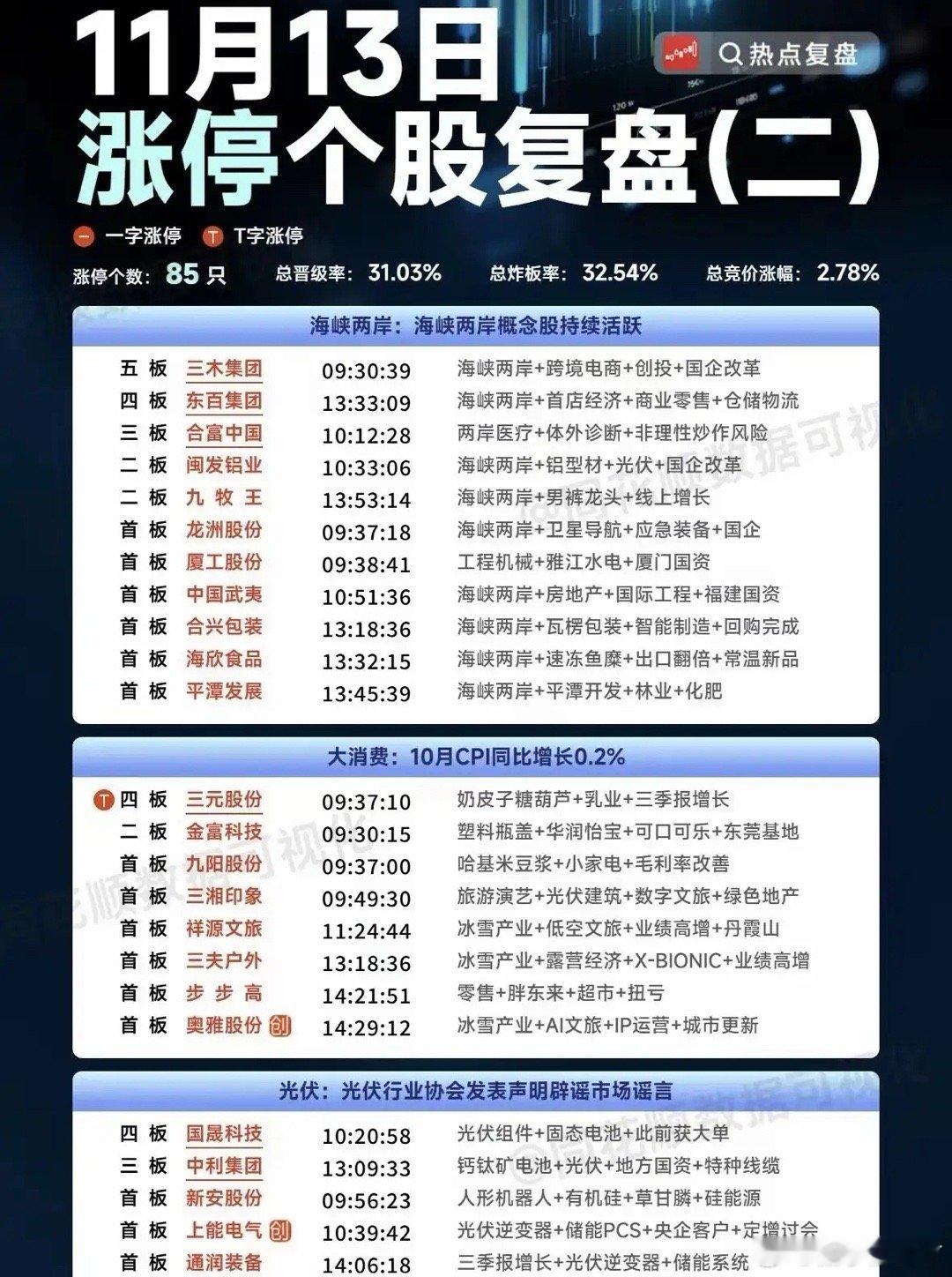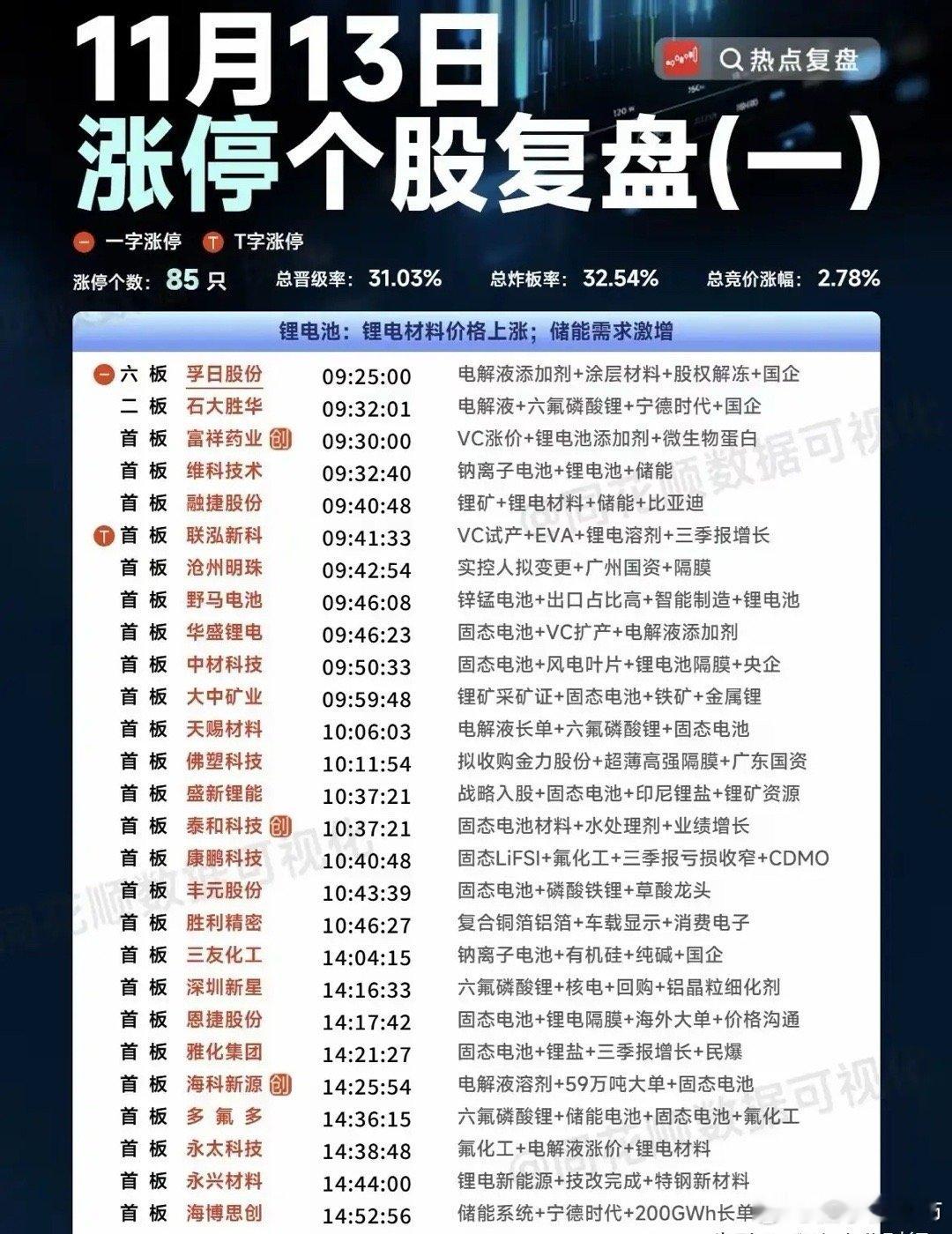 “11月13日涨停个股复盘”,以下是对当天A股市场涨停情况的总结:一、整体市场数据(适用于11月13日所有涨停个股复盘)- 当日涨停个股总数:85只- 总晋级率:31.03%- 总炸板率:32.54%- 总竞价涨幅:2.78%二、主要板块涨停个股情况1. 锂电池板块锂电池板块因锂电材料价格上涨和储能需求激增成为热点,多个股票涨停,按涨停顺序列举部分代表性个股:- 六板:孚日股份(电解液添加剂+涂层材料+股权解冻+国企)- 二板:石大胜华(电解液+六氟磷酸锂+宁德时代+国企)- 首板包括:富祥药业(VC涨价+锂电池添加剂)、维科技术(钠离子电池+储能)、融捷股份(锂矿+储能+比亚迪)、联泓新科(VC试产+锂电溶剂)、沧州明珠(广州国资+隔膜)、野马电池(锌锰电池+出口)、华盛锂电(固态电池+电解液添加剂)、中材科技(固态电池+风电叶片+央企)、大中矿业(锂矿+固态电池)、天赐材料(电解液长单+固态电池)、佛塑科技(拟收购隔膜企业+广东国资)、泰和科技(固态电池材料)、康鹏科技(固态LiFSI+氟化工)、丰元股份(固态电池+磷酸铁锂)、胜利精密(复合铜箔+消费电子)、三友化工(钠离子电池+有机硅)、深圳新星(六氟磷酸锂+核电)、恩捷股份(锂电隔膜+海外大单)、雅化集团(锂盐+民爆)、海科新源(电解液溶剂+固态电池)、多氟多(六氟磷酸锂+储能+氟化工)、永太科技(氟化工+电解液)、永兴材料(锂电新能源+特钢)、海博思创(储能系统+宁德时代)。2. 海峡两岸与大消费、光伏板块- 海峡两岸概念持续活跃,相关个股如: - 五板:三木集团(海峡两岸+跨境电商+国企改革) - 四板:东百集团(海峡两岸+商业零售+仓储物流) - 三板:合富中国(两岸医疗)、二板:闽发铝业(海峡两岸+铝型材)、九牧王(海峡两岸+男裤品牌) - 首板:龙洲股份(海峡两岸+卫星导航)、厦工股份(厦门国资)、中国武夷(海峡两岸+房地产)、合兴包装、海欣食品、平潭发展(平潭开发)等。- 大消费板块受10月CPI数据影响: - 四板:三元股份(乳业+三季报增长) - 二板:金富科技(塑料瓶盖+可口可乐) - 首板:九阳股份、三湘印象、祥源文旅(冰雪产业)、三夫户外、步步高(零售+扭亏)、奥雅股份(AI文旅)等。- 光伏板块: - 四板:国晟科技(光伏组件+固态电池) - 三板:中利集团(钙钛矿电池+地方国资) - 首板:新安股份(有机硅+硅能源)、上能电气(光伏逆变器+储能)、通润装备(光伏逆变器+储能系统)等。3. 半导体、电力/储能与金属板块- 半导体板块因国产替代及存储芯片涨价: - 首板:华夏幸福(产业新城+房地产转型)、诚邦股份(存储芯片)、天奥电子(存储芯片+央企)、建业股份(半导体+精细化工)、万通发展(PCIe5.0芯片)、合肥城建(长鑫科技+国资)等。- 电力/储能板块因储能需求激增及AI电力瓶颈话题: - 八板:摩恩电气 - 首板:顺钠股份(变压器+储能)、奥特迅(充电桩+储能)、宏英智能(液冷储能)、英维克(储能+液冷服务器)等。- 金属板块受贵金属及美联储降息预期影响: - 首板:合金投资、盛屯矿业、兴业银锡、金徽股份、国城矿业、铜钴相关、银锡龙头、铅锌矿资源股等。4. 医药、煤炭燃气、汽车整车及其他概念- 医药板块因多省份流感活动上升: - 四板:人民同泰(医药流通+流感+黑龙江龙头) - 二板:盘龙药业(中药+凝胶贴膏)、首板:济高发展(体外诊断+国资)等。- 煤炭燃气板块因冬季取暖高峰: - 三板:胜利股份(燃气并购+页岩气)、安泰集团(焦炭+循环经济) - 二板:速达股份(煤炭设备+海外布局)等。- 汽车整车板块因10月中国汽车产销创新高: - 首板:海马汽车(氢能汽车+海南自贸港)、金龙汽车(商用客车+出口)、众泰汽车(控股权变更) - 二板:真爱美家(家纺+一带一路)、首板:法兰泰克(起重机出海)、中嘉博创(5G+通信)等。- 其他概念:还包括如阿里巴巴概念(数据港、值得买、石基信息)、以及一些未明确归类但涉及热门题材的个股。三、总结11月13日A股市场涨停个股共计85只,市场情绪较为活跃,晋级率为31.03%,炸板率32.54%,显示一定的博弈热度。主要热点集中于锂电池、半导体、海峡两岸、大消费、光伏、医药、汽车整车、金属及电力储能等多个板块,其中锂电池和半导体因行业基本面(如材料涨价、国产替代)受到资金重点关注,海峡两岸概念则受益于区域经济和政策预期,大消费与医药板块受消费数据和季节性因素驱动,整体呈现多点开花的局面。