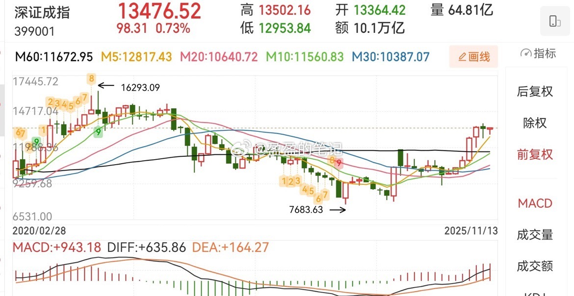 股市中期走势分析:上证指数失真没有分析必要,相对来说深证指数走势比较真实。从深证指数周线图来看,目前是横盘走势,这种横盘调整走势代替了下跌回调,预计还有4-6周震荡后开始选择方向。从月线图来看,距离5月线(13400点)距离有点远,目前在12800点,5月线每月上涨600点,那么在横盘情况下到了12月份指数会到达13400点附近,即12月份会回踩到5月均线,那么从月线结构来看最迟1月份指数将开启新一轮上涨。2026年上证指数突破5100点应该没有问题,那么上方空间大约还有25%。如果最近两个月你的账户亏损了,大概率是追涨杀跌了,如果持股不动,90%概率不会亏钱。牛市该怎样操作?持股不动即可,牛市有个特点:被套股票一般不会超过一个月即可解套,即使短期被套10%-20%,一般来说一个月左右都能解套,两周的下跌只需两根阳线就能回本,因此不用担心被长期套住。最不理智的操作是:被套了几天或者几周开始割肉,再去追趋势比较好的股票,然后再次被套,循环割肉,那么你的亏损会非常大。只要翻看最近割肉的股票是不是用不了多久都会解套?记住一点,现在是牛市不是熊市,当你恐慌的时候告诉自己牛市还在,牛市不套人,稳住心态用不了几日都会回本甚至盈利。还要记住一点:如果不想被深套一定设置防守线跌破防守线清仓,回到防守线买入因为牛市什么时候结束谁都不知道否则真到了那天你会亏的很惨很惨。