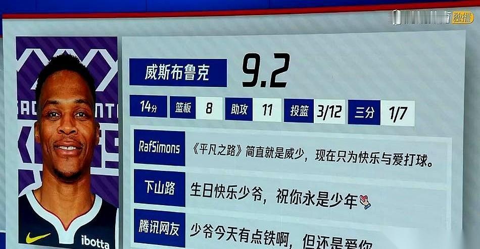 12投3中,搁谁身上不得被喷到关评论? 结果你猜怎么着,腾讯网友给他打了9.2分。 离了个大谱。 但你再一看,生日夜啊哥们儿,手感凉得像冰柜,硬是给你拼下来个准三双,14分8板11助。 再看看被提到首发的那位,施罗德,上场溜达一圈,0分0助3失误,好家伙,数据栏干净得像张白纸,就是多了几滴脏东西。 这么一对比,这9.2分,给高了吗? 一点都不高。 这打的不是分,是人心。 我就纳闷了,教练到底在想啥?非要去动那个首发。本来替补阵容磨合得多好,威少在二阵容里就是那台发动机,轰隆隆带着大家往前冲。 现在呢? 首发不得劲,替补也没劲。 两头不讨好。 说白了,球迷的眼睛是雪亮的。 大家看的不是你投篮有多准,是你那股劲儿还在不在。是你摔倒了,是爬起来拍拍屁股接着抢,还是躺在那儿等裁判。 威少今天就是,手感再铁,那颗想赢的心是滚烫的。 那个9.2分,打的不是数据,是对一个老兵还在拼命的尊重。