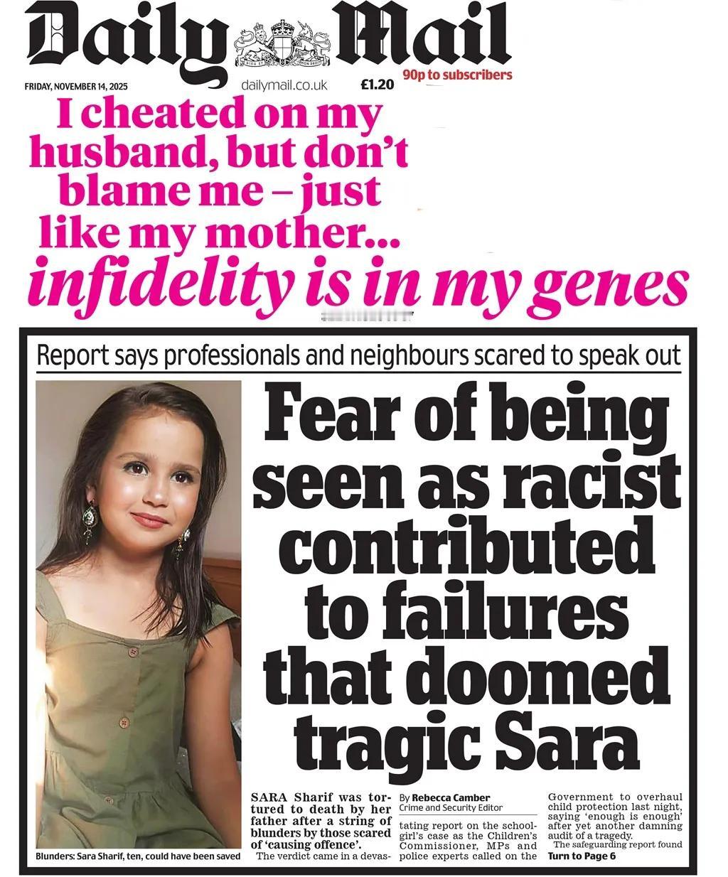 《每日邮报》头版报道了一份关于与2023年被父亲和继母谋杀的萨拉·谢里夫接触过的当局的调查报告。 2023年8月发生于英国萨里郡沃金市的一起儿童虐待致死案,10岁女童萨拉·谢里夫被发现死于家中,尸检显示其遭受长期虐待,包括脊椎11处骨折、脑外伤、烫伤和咬痕等。案件涉及其父亲乌尔凡·谢里夫、继母贝纳什·巴图尔及叔叔费萨尔·马利克三人,均被指控虐待致死,但三人否认指控并互相推诿责任。