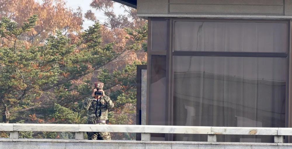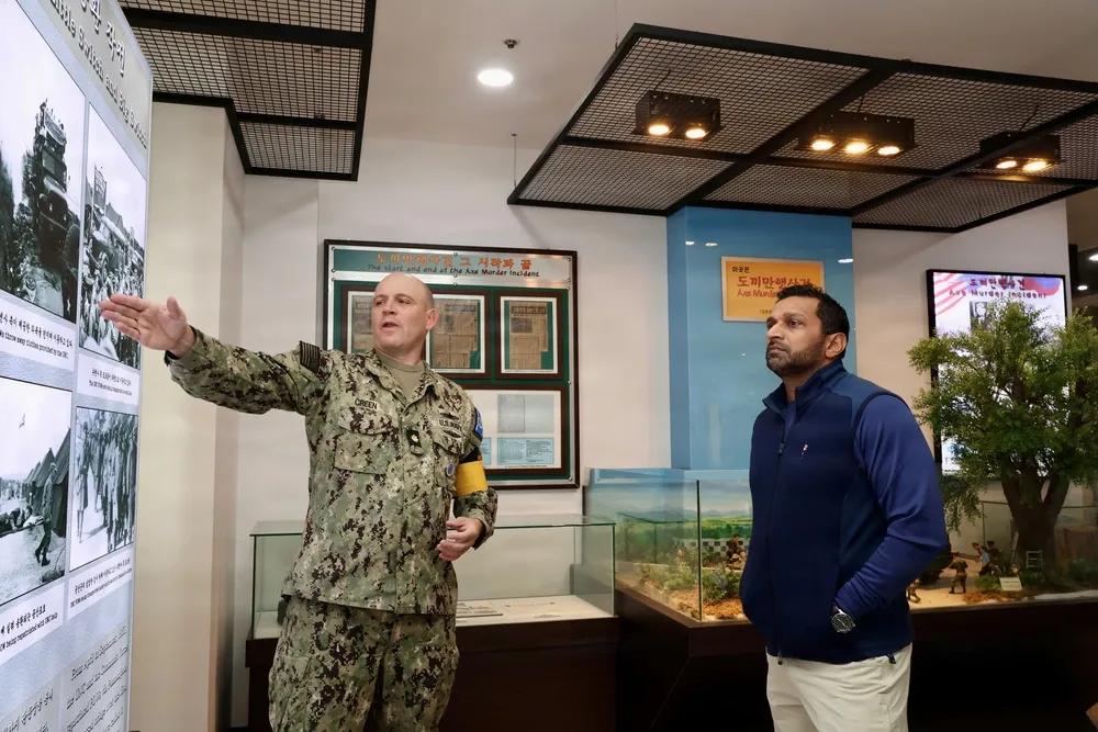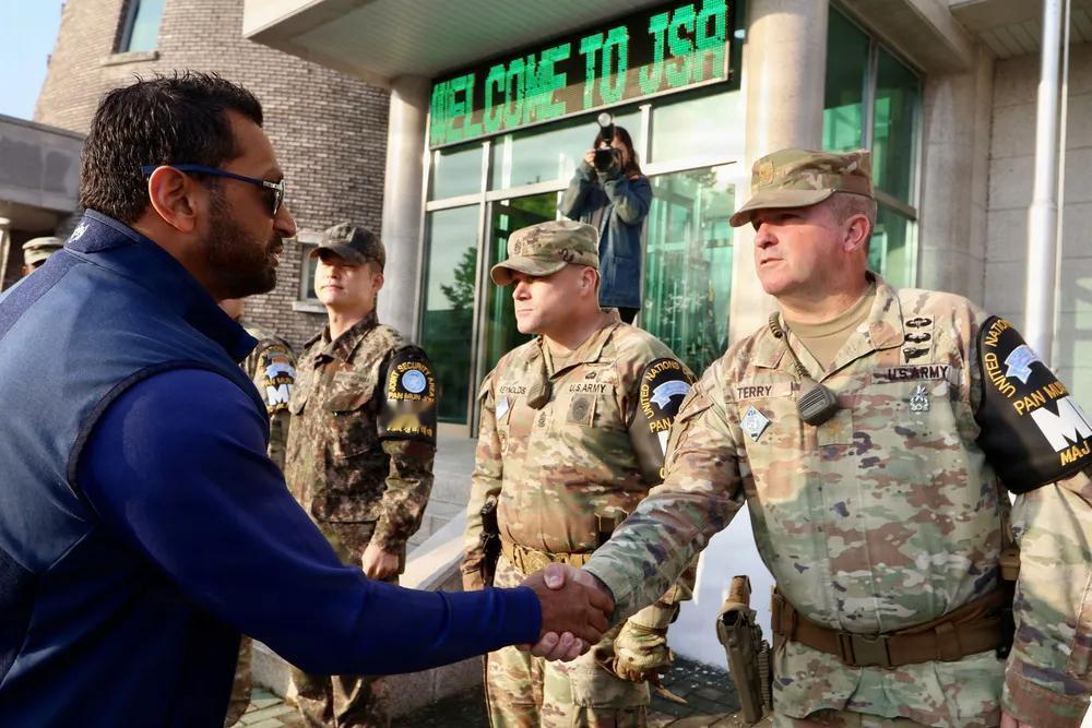 11月7日,美国联邦调查局局长卡什·帕特尔的亚洲之行到访韩国,他和美国驻韩国弗雷德里克·克里斯特少将(中)于访问朝鲜半岛非军事区的联合安全区域。“会议行”的蓝色小屋是进行持续停战谈判的对话场所。