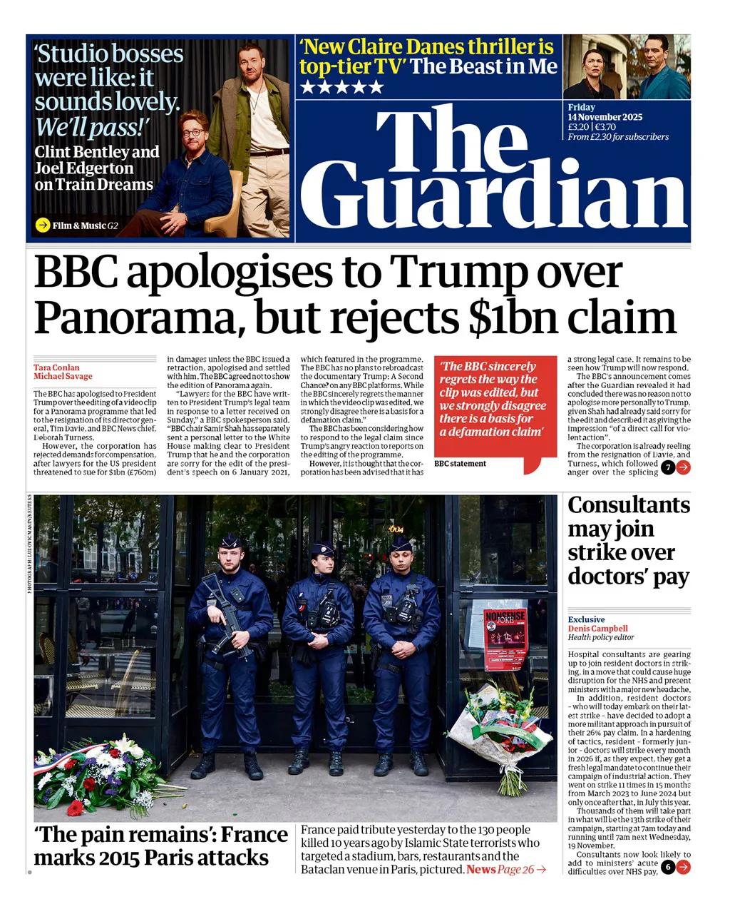 《卫报》报道了英国广播公司就2021年总统唐纳德·特朗普在《全景》节目中的演讲“编辑”向特朗普道歉的消息。 特朗普的律师要求10亿美元(7.58亿英镑)的赔偿,但该广播公司拒绝支付。