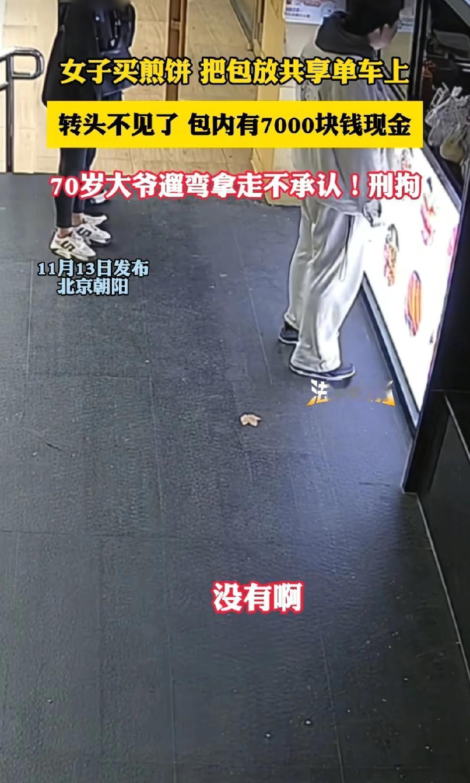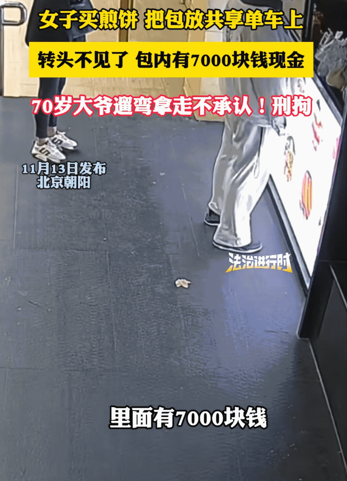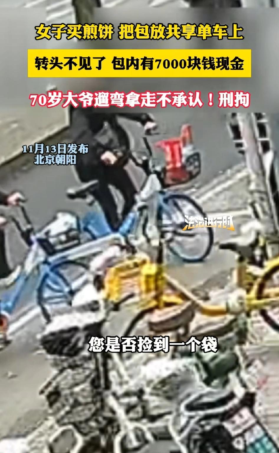 “有监控还不承认!”北京朝阳一女子买煎饼时,结果转头放在共享单车上的7000元现金不见了。 不得不说这个女子也太大意了吧!把装有7000元现金的包放在共享单车上就去买煎饼了。结果被路过的遛弯大爷拿了去。 民警通过周围监控找到大爷,问大爷“您是不是捡到一个袋,那里面有7000块钱啊?”大爷说:“没有啊!” 又问大爷:“那包里有两个梨,还有一个洗漱包”大爷紧接着回答“真没有钱包。” 大爷拿走了,还不承认。此事引起网友热议,有网友说:“袋里有这么多钱,买煎饼怎么敢不拿着一起去啊?” 还有网友说:“自己都说露馅了,叔叔问的是有没有7000块钱,大爷说里面真没有钱包。” 也有网友说:“我电动车上也是放的袋子 ,里面是充电器跟雨衣,上了个夜班 早上下班就没了,后来再也没放过。” 就算你不承认,也逃不过因为现在哪哪都有监控 ,不如主动承认错误,将拿走的包还回来 。不然还要面对相应的处罚。 关键,如果身边人知道了,真的是有点儿颜面扫地 。 你遇到过这样的事情吗 ? 冬日生活打卡季 (信息来源:法制进行时)