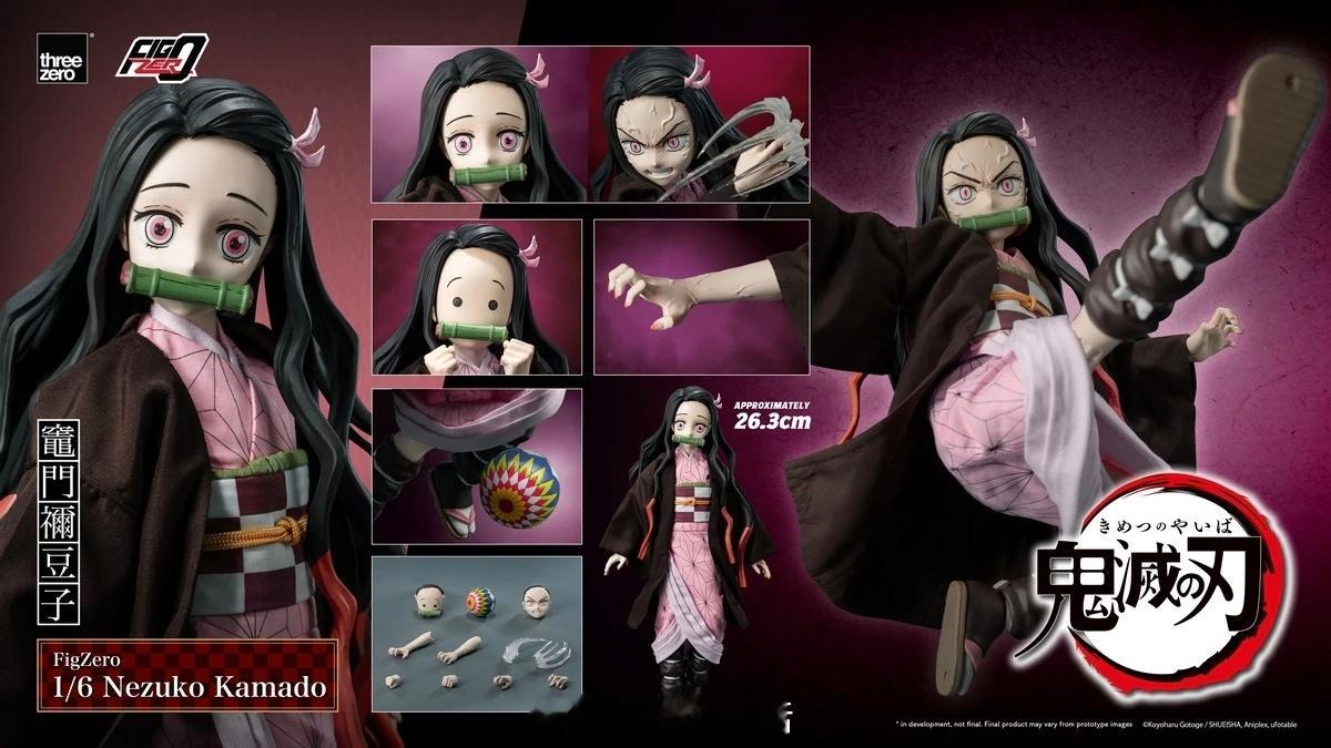 有趣的二次元周边。鬼灭之刃Threezero 1/6 鬼灭之刃 FigZero 灶门祢豆子。 1/6 灶门祢豆子收藏级可动人偶约26.3厘米高(10.4英寸),全身具有约34个可动关节。祢豆子身穿以threezero精湛的布料工艺所制成的和服,精致的粉色和服并配有腰带、带扬及带缔;和服外套有深啡色羽织并搭配脚绊、足袋及草鞋,还原动画中经典的形象外观。