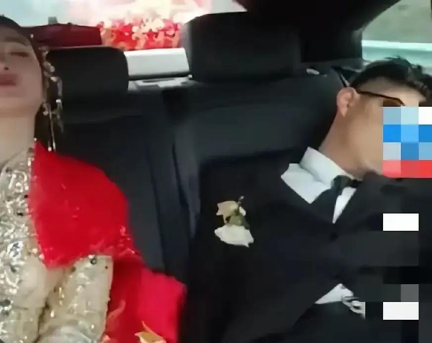 南京一对新人刚把新娘接上车,五分钟不到就头靠头睡死过去,西装歪了,头纱还翘着,亲