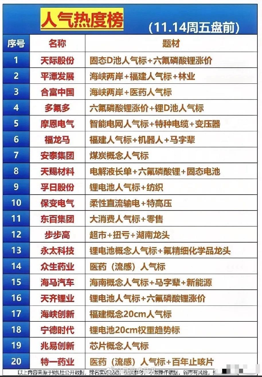 11.14周五盘前人气榜:锂电成绝对主线!20只热门标的(含情绪标签+多题材共振)全梳理11月14日周五盘前,市场人气聚焦明确:锂电赛道(六氟磷酸锂涨价、固态电池) 稳居核心主线,叠加海峡两岸/福建、海南等区域概念,医药(流感)、大消费、智能电网、芯片等细分方向同步发酵。人气标的多呈现“赛道催化+细分属性”双重特征,部分还带有“马字辈”等情绪标签,精准契合当下市场热度偏好。盘前20大人气标的解析1. 天际股份:固态电池+六氟磷酸锂涨价双逻辑共振,六氟磷酸锂业务营收占比极高,是锂电方向人气核心,稳居榜单首位。2. 平潭发展:海峡两岸+福建区域概念核心,叠加林业板块属性,依托平潭独特区域优势,成为区域题材人气标杆。3. 合富中国:海峡两岸概念与医药赛道双重绑定,借区域热度与医药板块联动,成为跨赛道人气标的。4. 多氟多:六氟磷酸锂传统龙头,技术成熟且产能雄厚,叠加锂盐涨价与锂电赛道催化,双重属性奠定热度基础。5. 摩恩电气:智能电网核心人气标,业务覆盖特种电缆、变压器,赛道需求预期升温带动其关注度飙升。6. 福龙马:福建概念+机器人题材+“马字辈”情绪标签,多题材共振,成为区域与新兴赛道结合的热门标的。7. 安泰集团:煤炭概念人气代表,近期板块情绪回暖,凭借赛道关注度回升跻身热度榜。8. 天赐材料:电解液+六氟磷酸锂双龙头,手握长单保障业绩,叠加固态电池布局,是锂电赛道核心人气标的。9. 孚日股份:纺织主业叠加锂电池业务布局,借锂电赛道热度实现跨界吸睛,成为赛道边缘人气标的。10. 保变电气:特高压赛道人气核心,覆盖柔性直流输电业务,政策与需求预期双重驱动其市场热度。11. 东百集团:大消费零售方向人气标,受益板块关注度回升,成为消费赛道短期热门标的。12. 步步高:湖南零售龙头,超市主业叠加扭亏预期,借大消费热度与区域属性跻身人气榜。13. 永太科技:氟精细化学品龙头,横向拓展锂电池材料业务,细分龙头属性+赛道概念双重加分。14. 众生药业:医药(流感)人气核心,聚焦流感相关需求,疫情催化下成为医药方向关注度焦点。15. 海马汽车:海南概念+“马字辈”标签+新能源汽车布局,多题材叠加,成为区域与新能源跨界热门。16. 天齐锂业:锂资源龙头,关联锂电赛道且受益六氟磷酸锂涨价产业链传导,是赛道权重类人气标的。17. 海峡创新:福建区域概念+创业板20cm弹性属性,凭借高波动潜力成为区域题材人气标的。18. 宁德时代:锂电池龙头权重股,创业板20cm趋势标的,作为赛道核心,走势对板块有较强带动作用。19. 兆易创新:芯片概念人气代表,依托行业核心地位,借板块关注度回升跻身热度榜。20. 特一药业:医药(流感)人气标的,拥有“百年止咳片”特色产品,关联流感需求,叠加疫情热度吸睛。总结盘前人气榜清晰呈现市场短期偏好:锂电赛道(六氟磷酸锂、固态电池)是绝对核心,区域概念、医药(流感)、大消费等方向同步分流资金;热门标的多为“细分龙头+赛道催化”或“多题材共振+情绪标签”组合。需注意,人气榜具有实时波动性,热度更多反映短期市场情绪,投资需结合企业基本面、业务关联度与市场节奏理性决策,避免盲目追高。本文涉及资讯、数据均来自网络公共信息,仅供参考,不构成任何投资建议!