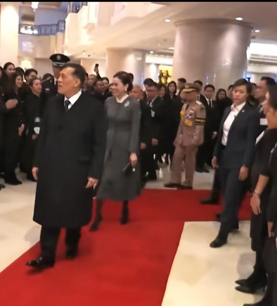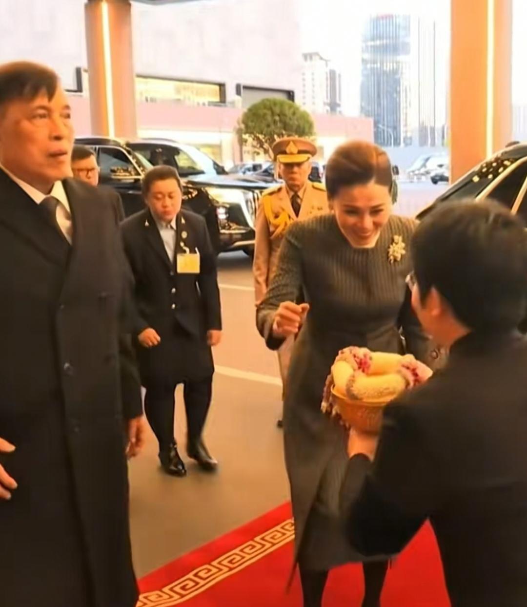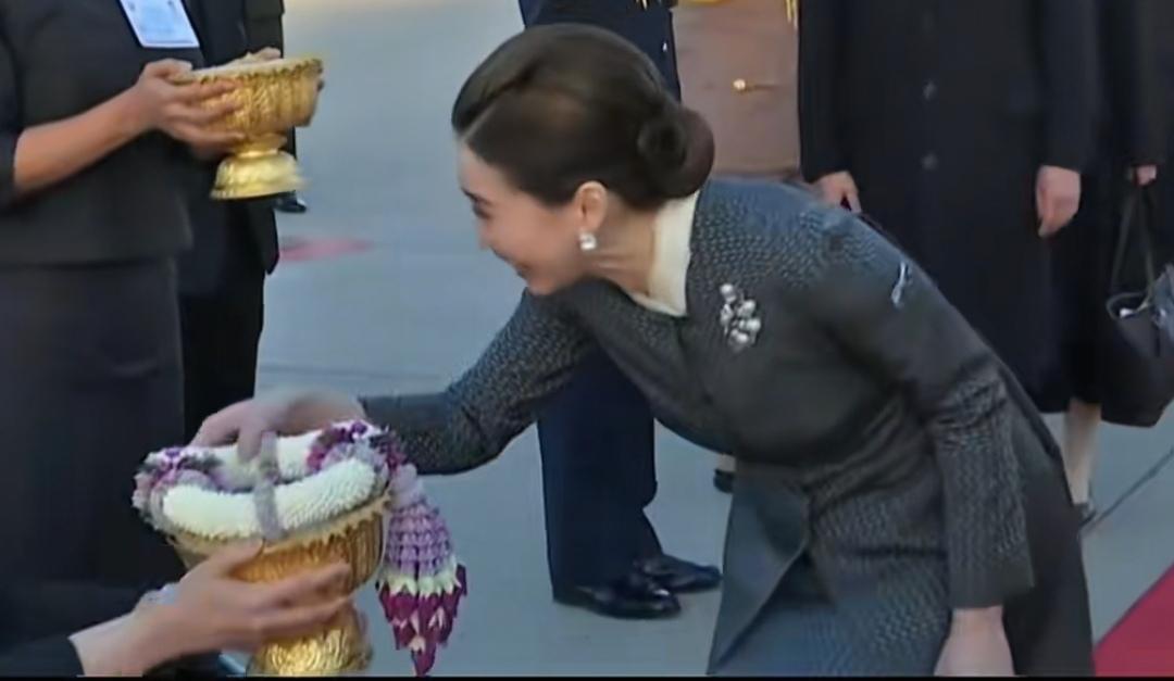 11月13日,泰王后苏提达陪同国王来中国了,不得不说,她的优雅形象让人印象深刻。 泰国王室的礼仪即便在中国仍然比较浓重,抵达北京机场下机前,飞机上的男工作人员行下跪礼。苏提达紧跟在国王身后走下飞机舷梯,泰国驻中国大使馆工作人员用金色盆子端着花团送给了国王和苏提达,苏提达半蹲着接受了。 到达下榻宾馆后,宾馆铺着红毯迎接,有工作人员金色缸子捧着花团送给苏提达,宾馆内铺设了红毯,两边工作人员夹道欢迎,欢迎场面特别浓重,国王身边安排了穿着礼宾服的男安保工作人员,苏提达的身边也安排了穿西装的高个女安保工作人员。