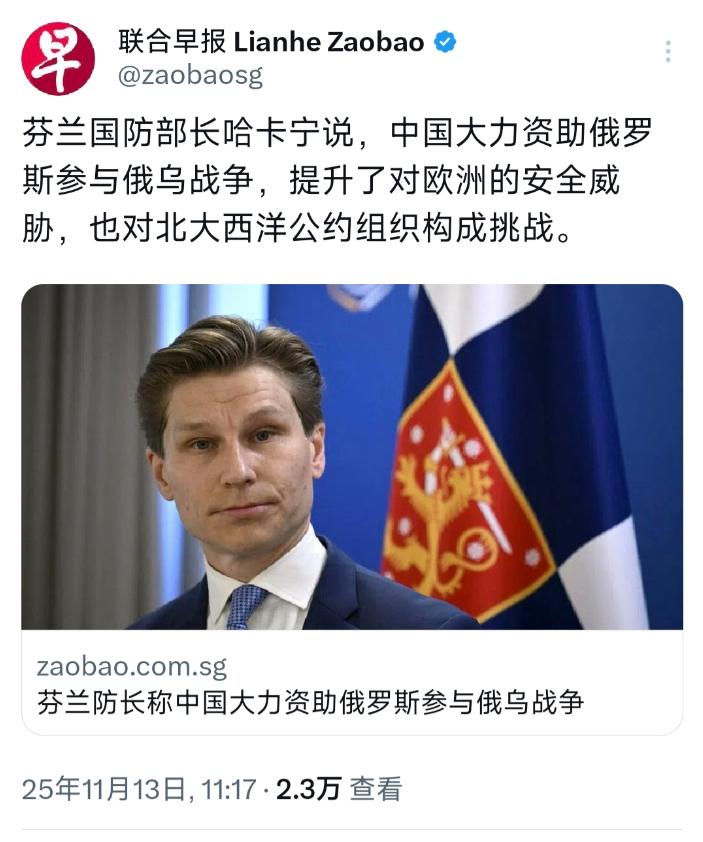 外媒11月13日报道:“芬兰国防部长哈卡宁说,中国大力资助俄罗斯参与俄乌战争,提升了对欧洲的安全威胁,也对北大西洋公约组织构成挑战。” 最简单的道理摆在这里,要是中国真像他说的那样“大力资助”,凭中国的工业实力和造东西、运东西的本事,俄军早该拿着足够的装备占绝对优势了,这场仗哪儿能拖到现在?战场上僵持不下的局面,本身就是抽在这个谎言上最响的一耳光。 明眼人一看就明白,芬兰这是刚穿上北约的“外衣”,就急着给新圈子表忠心。它今年才正式加入北约,十月底还刚牵头搞了北约六千多人的多兵种演习,忙着接入北约的指挥和情报网络。这时候跳出来抹黑中国,说白了就是想踩着中国刷存在感,把自己的战略焦虑往中国身上推。 可外交场合说话不是喊口号,得讲真凭实据。中国在俄乌冲突里的态度,三年来就没变过—,直站在和平这边,从来没给任何一方送过武器,反而总在忙着劝双方停火、坐下来谈判。从习近平主席提出“四个应该”“三点思考”的原则主张,到发布有12条具体内容的《关于政治解决乌克兰危机的中国立场》文件,全都是在为停火止战找办法。 咱们的欧亚事务特别代表李辉,来来回回跑了四轮穿梭外交,俄罗斯、乌克兰还有欧洲好几个国家都跑遍了,就是想协调各方坐下来好好谈。上个月中国还和巴西一起,拉着“全球南方”不少国家搞了个“和平之友”小组会议,专门呼吁战场别向外扩散、战事别再升级。这些实实在在推动和平的事,比芬兰空口白牙的抹黑有分量多了。 更别说中国一直没断过给乌克兰送人道主义援助,吃的、治病的药、医疗设备,从来没落下过,就是怕普通老百姓遭罪。再看看那些喊着“中国威胁”的北约国家,一边给乌克兰送武器拱火,一边倒打一耙说中国不对,这双重标准也太明显了。 哈卡宁说中国“增加了安全威胁”,不如回头看看北约自己。芬兰加入后,北约的军事力量直接伸到了俄罗斯边境,这种不断往东、往北扩张的行为,本身就是在加剧地区紧张。现在不想着怎么推动和平,反而把中国当替罪羊,暴露的全是外交上的短视,还有西方对俄乌僵局没辙的无能,自己解决不了问题,就找个外人甩锅。 要知道,打仗没有赢家,只有和平才不会有人输。中国从来不会像北约那样搞小圈子对抗,更不会干涉别的国家内部的事。芬兰要是真为欧洲安全着想,就该多听听劝和促谈的声音,别跟着瞎喊口号。毕竟靠抹黑中国刷存在感,既换不来真安全,最后还得砸了自己的外交信誉。