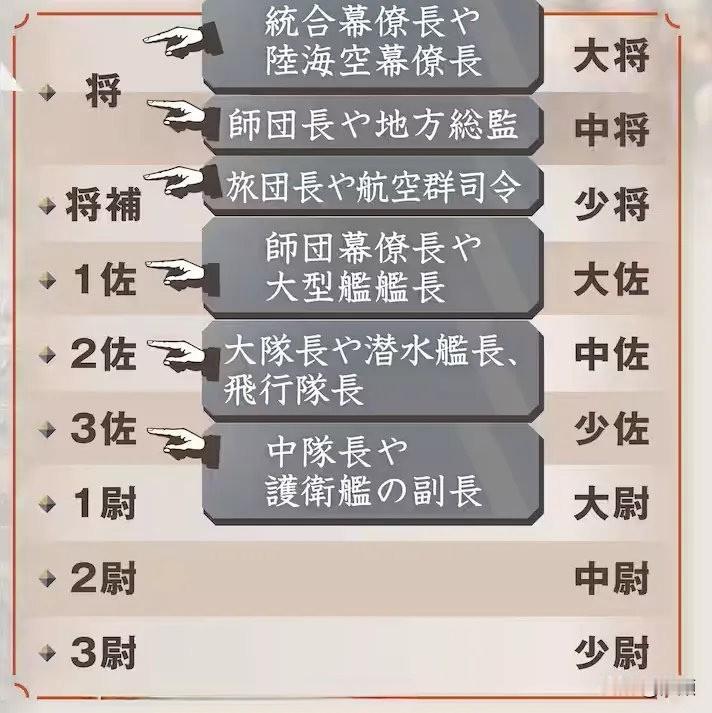 日本“大佐”要回来了!搞事早苗要恢复旧日本军队的军衔。 此次修改不只是军衔,还涉及兵种称谓。军衔方面,现行自卫队17个军阶将大幅复刻旧日军体系,比如“1佐”改称“大佐”、“1尉”恢复为“大尉”,统合幕僚长等将领拟改称“大将”,“曹长”“1曹”等下级军衔也会对应改为“上级曹长”“曹长”等;兵种方面,“普通科”“特科”“设施科”将分别改回“步兵科”“炮兵科”“工兵科”。二战后日本自卫队采用数字辅助的军衔体系,本是为淡化军事色彩、践行“专守防卫”原则,如今恢复旧军衔,实则是其推进自卫队“军队化”、突破战后军事束缚的重要动作,其背后还暗含右翼势力推动“脱战后体制”的深层考量。