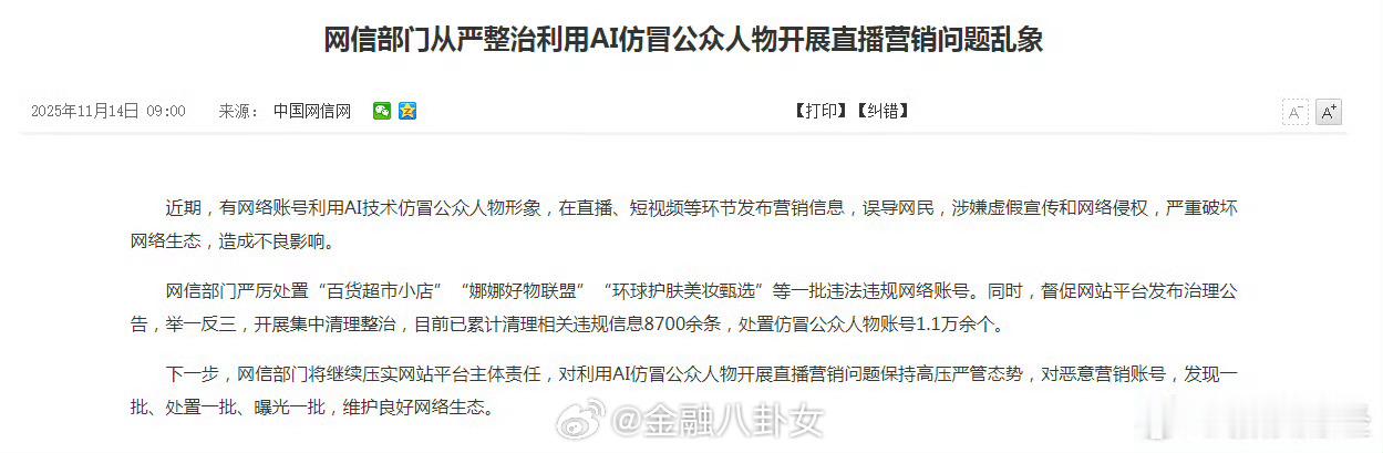 网信部门从严整治利用AI仿冒公众人物开展直播营销问题乱象