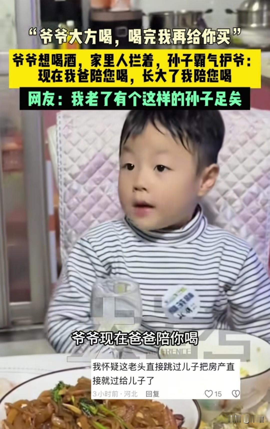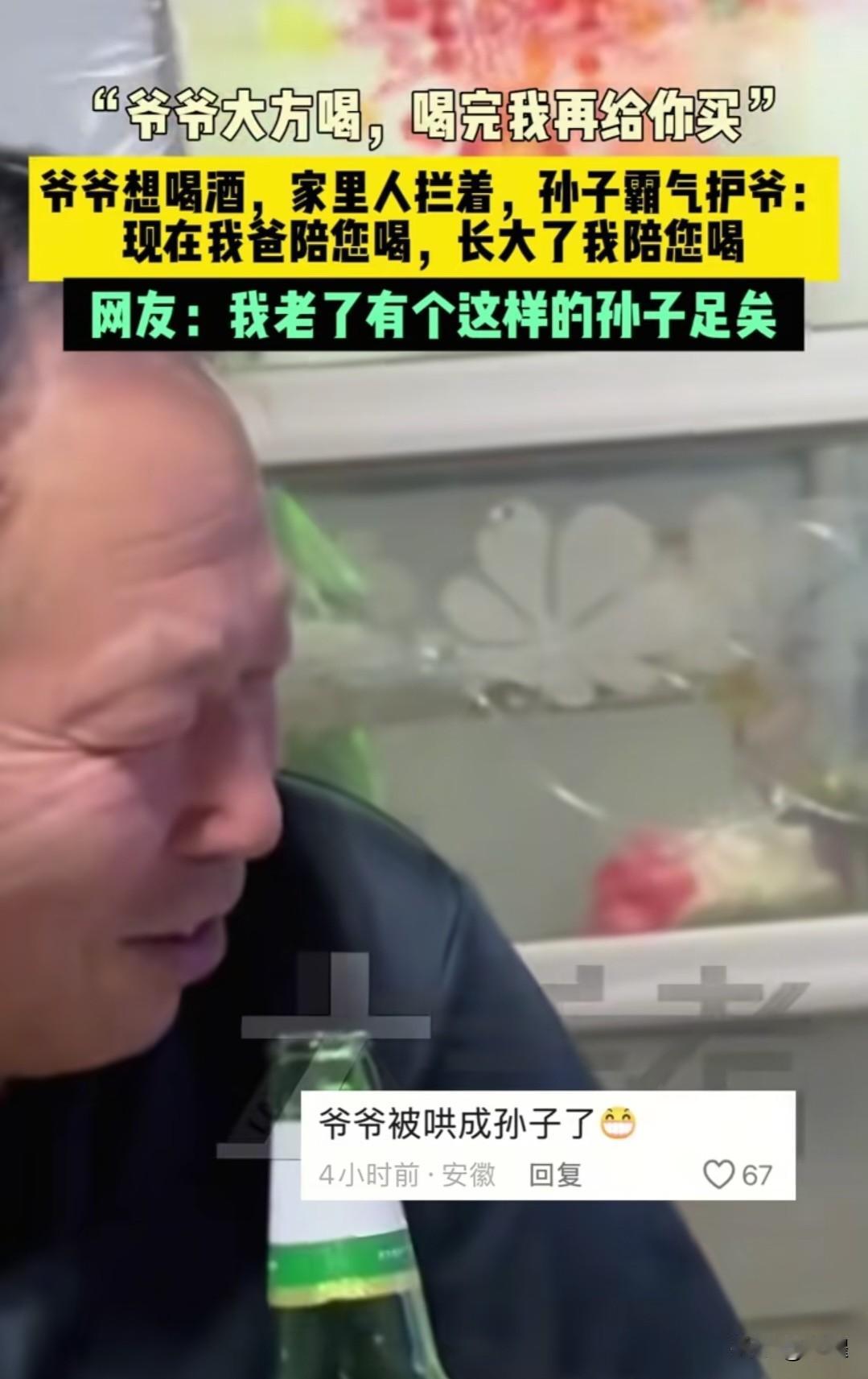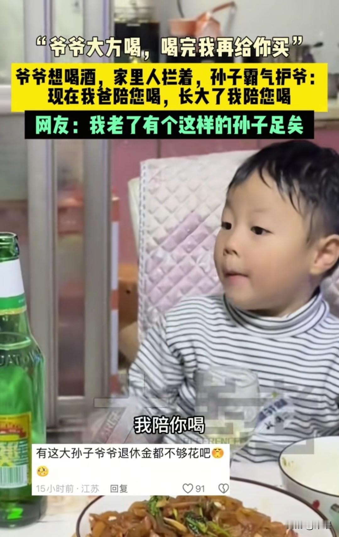“让他喝” 小孩哥发话了 “爷爷大方喝,喝完了我再给你买。现在我爸陪你喝,等长大了我陪你喝,别喝晕乎了就行。” 家里人拦着不让喝酒,是关心爷爷的身体。 小孩哥霸气护爷,是把爷爷当成了宠着的人。 爷爷都笑开了花。 小孩子没说啥大道理,用最直接的话,说着最暖的关心。 不用讲对错,就顺着心意来。 不管对错,先站在你这边。 孝顺是孝和顺。 他不懂养生的道理,却懂爷爷的情绪。 最好的隔代亲,也该是双向奔赴的爱[比心] 小孩哥感悟 小孩哥名场面 小孩哥爆金句 小孩哥头像 14岁小孩哥 网红小孩哥 小孩哥上幼儿园 小孩哥唱歌 爷孙