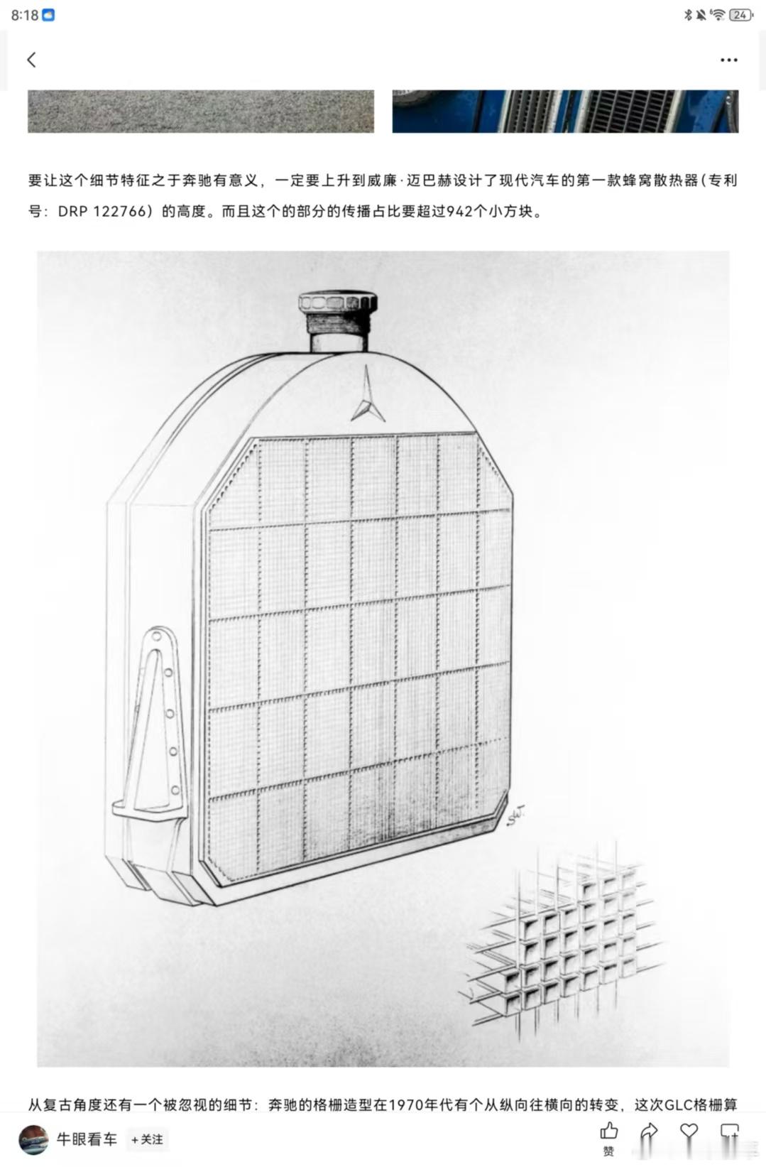 我上次说要让奔驰目前的复古格栅(GLC上的)这个细节特征之于奔驰有意义,一定要上升到威廉·迈巴赫设计了现代汽车的第一款蜂窝散热器(专利号:DRP122766)的高度。绝对不能停留在60年代。刚刚纪念 Mercedes 35的新闻稿这个链接就非常紧实了,60年代乃至之前之后的风格都是插曲。