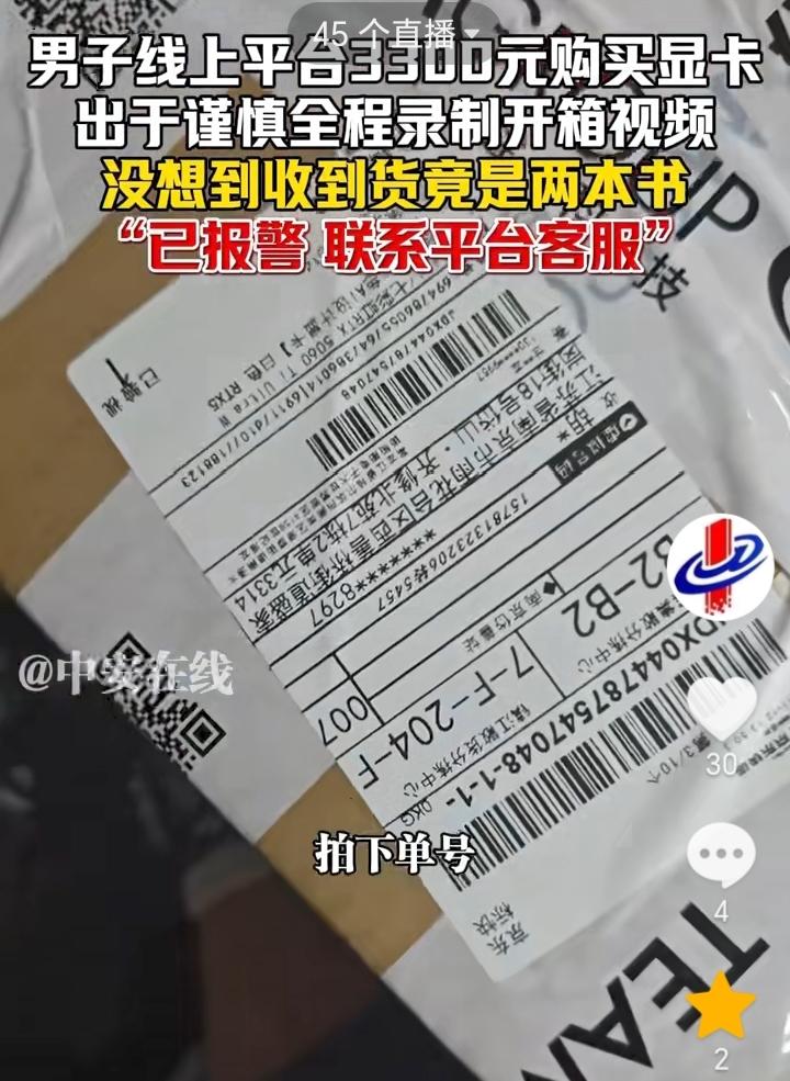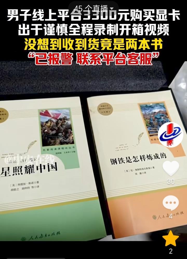 万万没想到!江苏,一男子花费3293.83元在网上购买显卡,收到快递后男子为了谨慎期间全程录制开箱视频,在确定收货单号是本人的后男子开始拆箱,结果让人没想到的是拆开后里面不是显卡而是两本书,一本是《红星照耀中国》,一本是《钢铁是怎样炼成的》,男子直呼“这么黑啊!”,发现被骗后男子已经报了警并联系了平台客服。 多亏全程拍摄不然可能就解释不清了,可能商家也没有想到会有人警惕性这么高,拆快递还录制视频。 花费三千多元买的显卡,结果里面放了两本书,两本书合起来也才值几十元,这是让人万万没有想到的,不得不说这商家确实太黑了。 做生意讲究的就是一个诚信,像这种买显卡结果发的却是书,这样的商家就是在“玩火自焚”。 买贵重物品打开包装的时候还是要谨慎最好还是全程拍视频,避免万一被骗后没有证据说不清。
