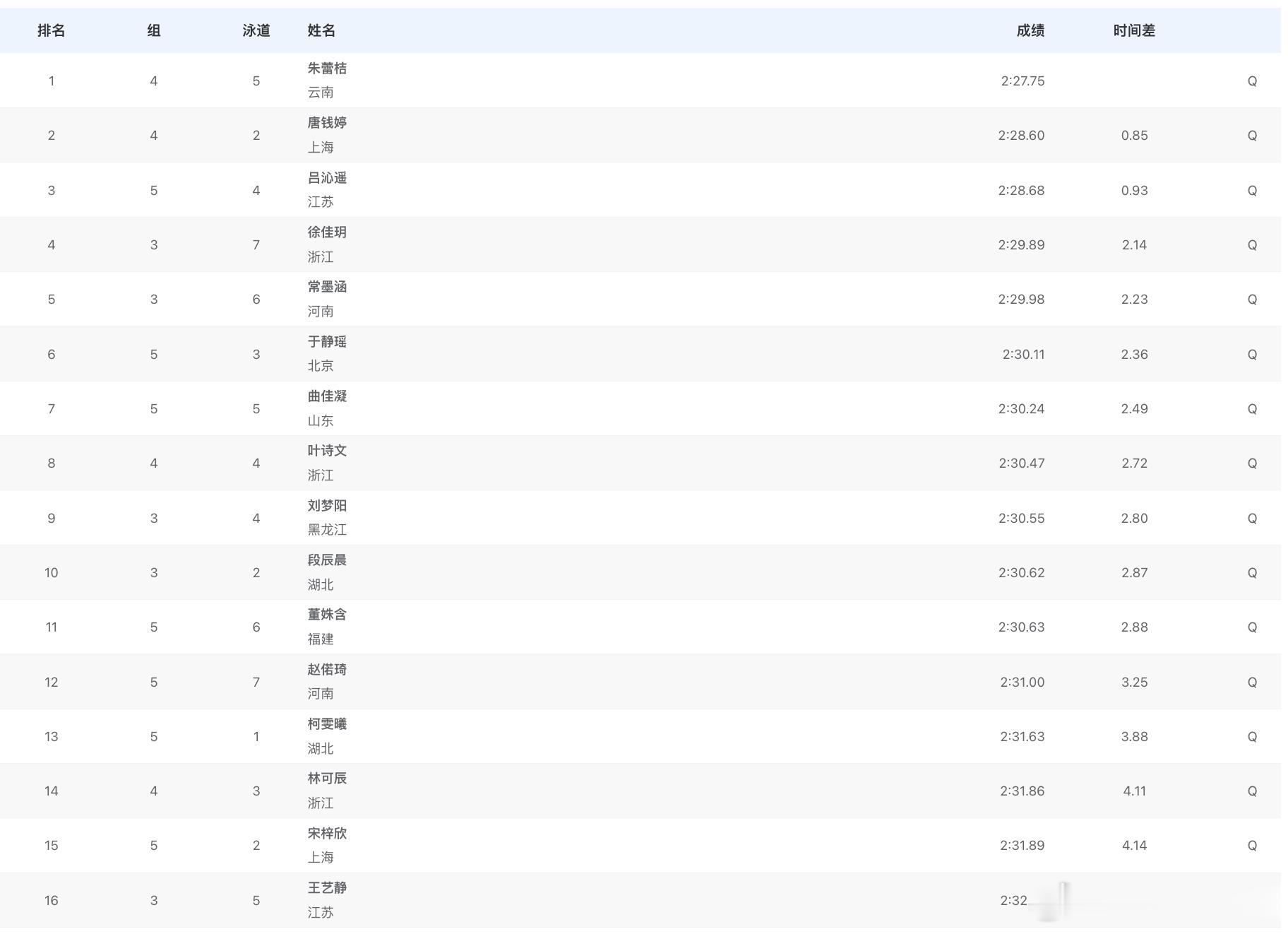 女子200米蛙泳预赛成绩朱蕾桔 2:27.75唐钱婷 2:28.60吕沁遥 2:28.68徐佳玥 2:29.89常墨涵 2:29.98于静瑶 2:30.11曲佳凝 2:30.24叶诗文 2:30.47刘梦阳 2:30.55 段辰晨 2:30.62董姝含 2:30.63 赵偌琦 2:31.00柯雯曦 2:31.63林可辰 2:31.86宋梓欣 2:31.89王艺静 2:32.16