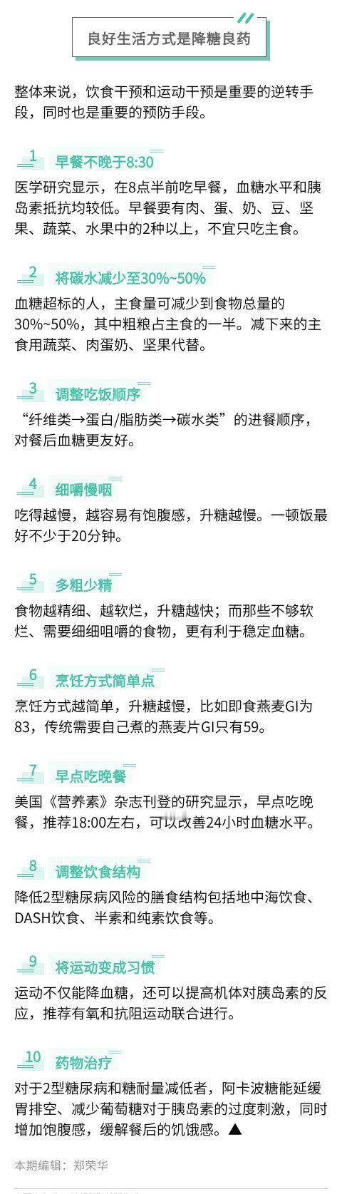 【血糖超标有多大概率变糖尿病】有人拿到体检报告时,可能会庆幸:血糖虽然超出正常值,但没有诊断为糖尿病。此时,这部分人已经处在糖尿病前期(糖前期),距糖尿病仅一步之遥。糖尿病前期是指处于正常血糖和糖尿病之间的一种中间状态,即血糖值高于健康人,但尚未达到糖尿病的诊断标准,血糖高了,是有机会逆转的。在糖前期进行生活干预,一半人可以绕开糖尿病;另一半人群即使患上糖尿病,也可以减少30%左右的心血管事件。饮食干预和运动干预是重要的逆转手段,同时也是重要的预防手段。饮食干预和运动干预是重要的逆转手段,同时也是重要的预防手段,戳图学习↓(生命时报)
