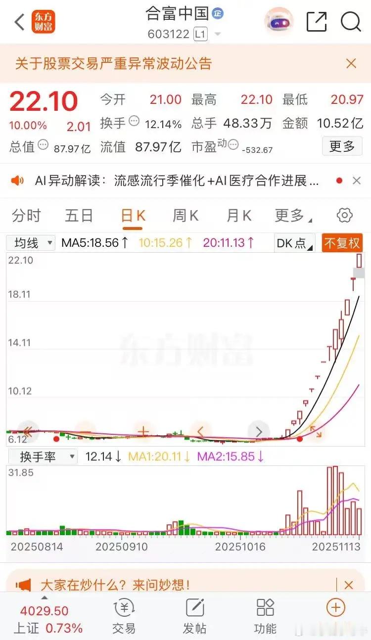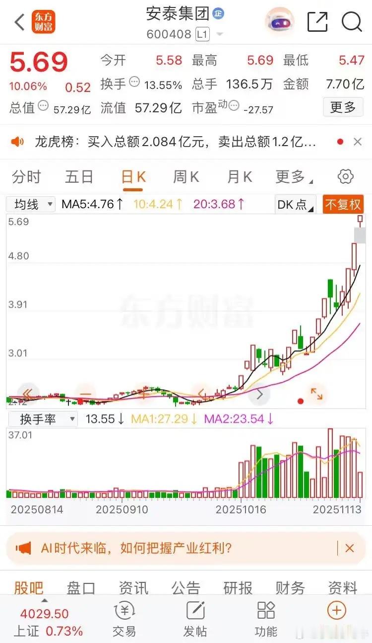 三足鼎立安泰集团,合富中国,平潭发展。安泰集团涨停板收盘报收5.69元每股,成交金额7.70亿元,缩量涨停板,21天12个涨停板。一个字强。平潭发展涨停板收盘报收9.89元每股,成交金额58.92亿元,创出近期新高,20天12个涨停板,两个字,很强。合富中国涨停板收盘报收22.10元每股。成交金额10.52亿元,13天12个涨停板,三个字,非常强,不愧是跨年妖股。沪指指数也已经创十年新高,把握节奏