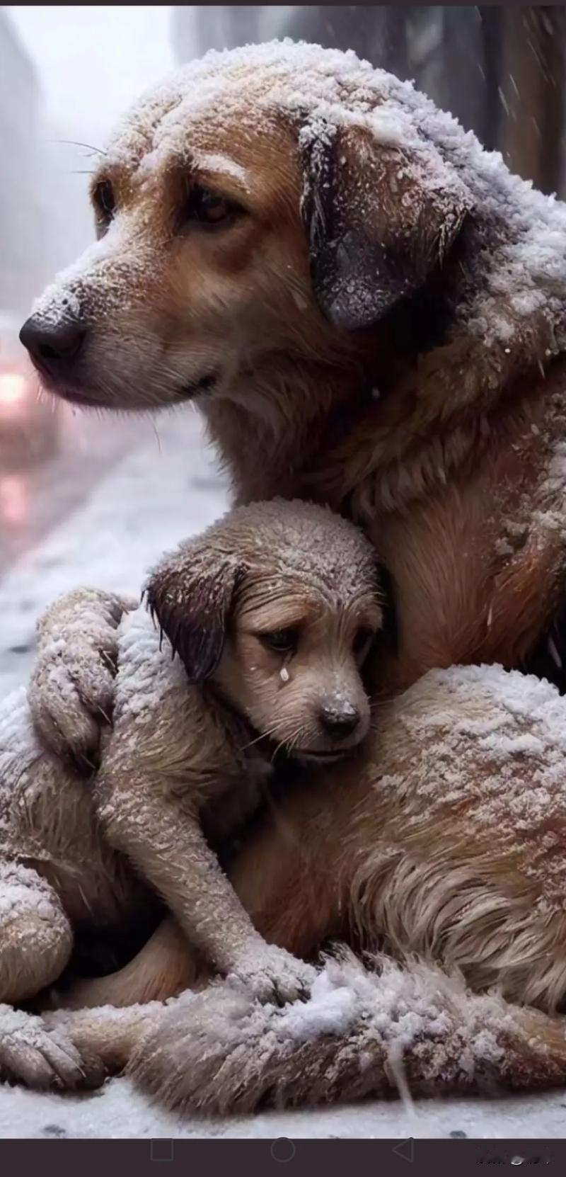 泪目了!这天一位小姐姐朋友家玩,由于下了一夜的雪,到处都是银装素裹白雪皑皑非常漂亮,她走在雪地,特别开心!可当她走到一条小路上的时候,看到非常可怜的一幕,一只流浪狗妈妈满身是雪却用身体为孩子挡住风雪地侵袭。 它紧紧地搂住孩子的身体,不停地的瑟瑟发抖,而狗宝宝的眼角还残留着泪花。这一幕令小姐姐非常同情它们的遭遇,这么冷的天气,连个遮风挡雨的地方都没有,于是她就决定收养它们。小姐姐先把它们带去宠物医院检查并打了疫苗,之后就带回家去收养了。相信在她的照顾下,狗狗母子也会越来越好的。
