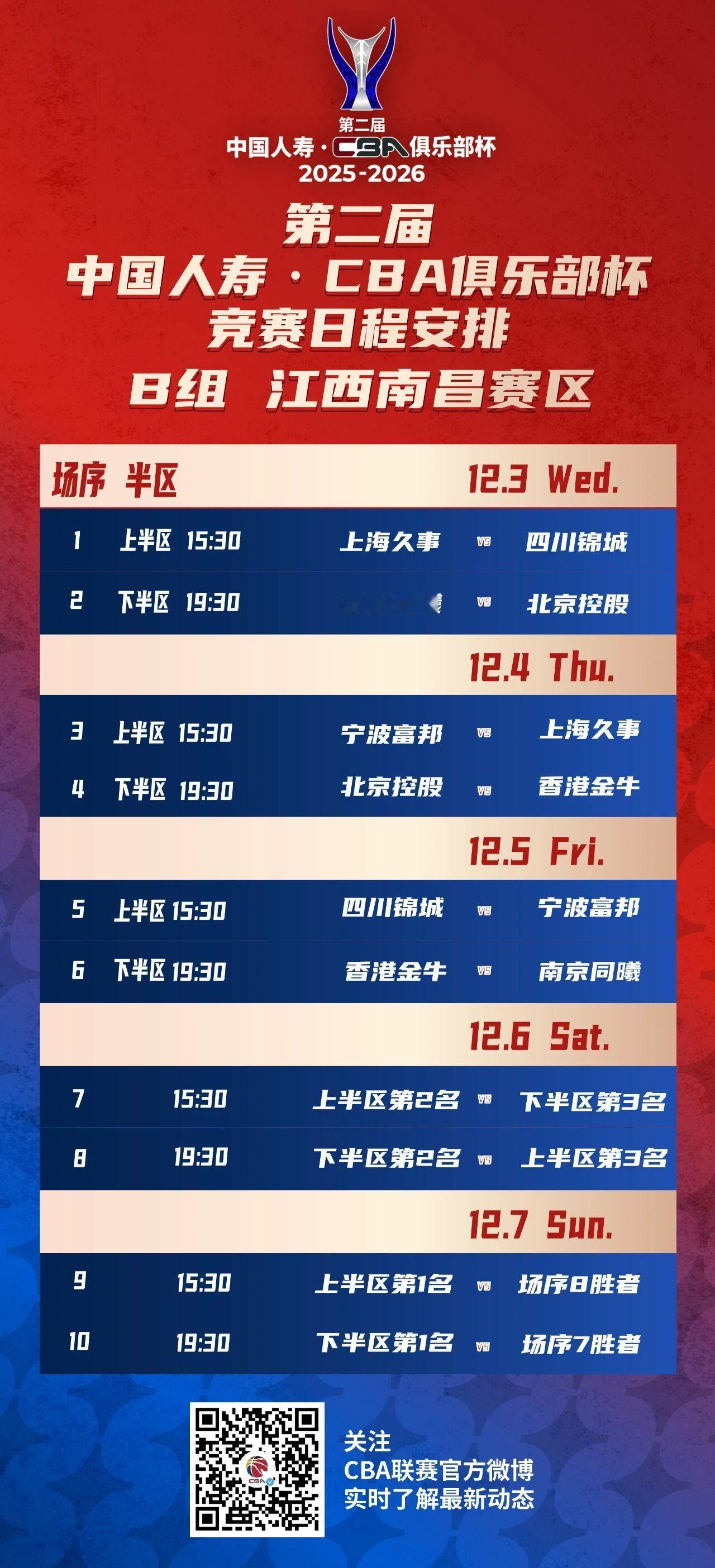 CBA俱乐部杯赛小组赛赛程出炉辽宁队所在武汉赛区12月3号晚上八点开打上海队所在南昌赛区12月3号下午三点半开打