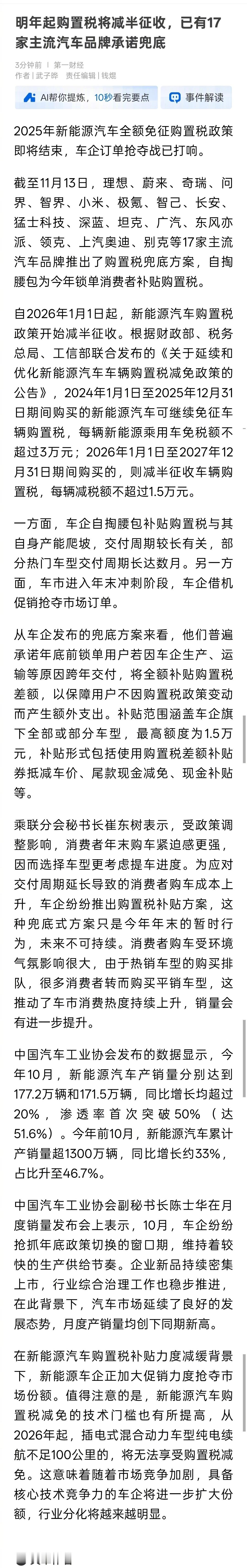 【】2025年新能源汽车全额免征购置税政策即将结束,车企订单抢夺战已打响。截至11月13日,理想、蔚来、奇瑞、问界、智界、小米、极氪、智己、长安、猛士科技、深蓝、坦克、广汽、东风亦派、领克、上汽奥迪、别克等17家主流汽车品牌推出了购置税兜底方案,自掏腰包为今年锁单消费者补贴购置税。自2026年1月1日起,新能源汽车购置税政策开始减半征收。根据财政部、税务总局、工信部联合发布的《关于延续和优化新能源汽车车辆购置税减免政策的公告》,2024年1月1日至2025年12月31日期间购买的新能源汽车可继续免征车辆购置税,每辆新能源乘用车免税额不超过3万元;2026年1月1日至2027年12月31日期间购买的,则减半征收车辆购置税,每辆减税额不超过1.5万元。