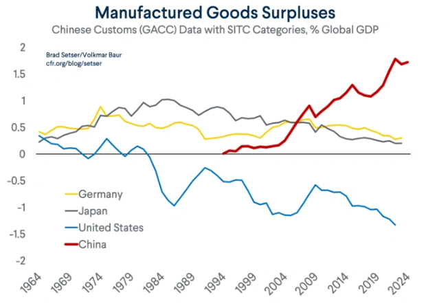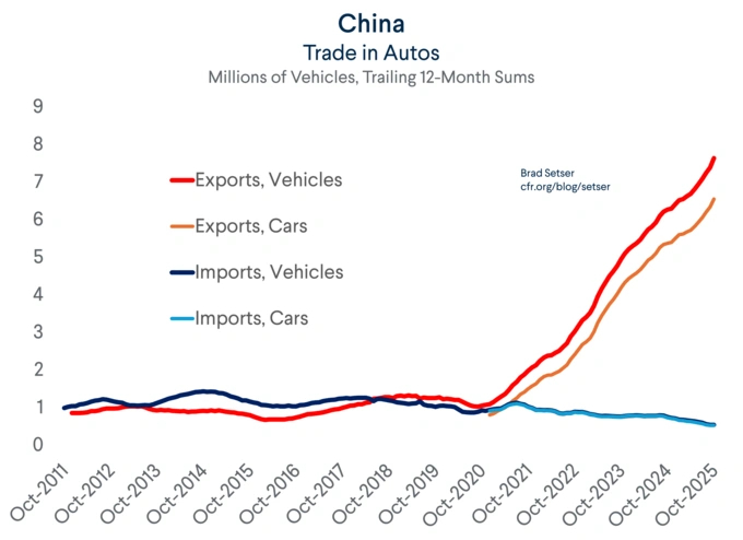 制成品顺差超2万亿美元,一些领域大幅增加顺差的潜力还很大,未来贸易顺差仍将大幅增长1. 快到年底了,中国全年货物贸易顺差应该会是约1.2万亿美元,基本确定了。前10月顺差是9648.2亿美元历史新高,同比增长22.1%。这个数据让中外经济学家极为关注,引发了震惊。更可怕的是,这个数值看上去止不住,还会大增。2. 图一是中美德日的“制成品顺差占世界GDP的比例”,日本德国制成品顺差在巅峰期约占全球GDP的1%,但那时全球GDP数值不高,美国1980年代以前曾经是制造业顺差。现在中国占比在冲击2%,数值已经超过2万亿美元了。注意这是制成品顺差,也就是制造业商品出口减去进口。中国总顺差是1.2万亿低于2万亿,因为有些项目逆差非常大,如原材料逆差。但是,这些大的逆差项,可能会因为中国的制造业进步,大幅减少、转为顺差。3. 一个例子是汽车,如图二,中国曾经是大逆差。2014年汽车逆差达到481亿美元的历史峰值,汽车进口558亿美元。2022年首次实现69亿美元顺差,2024年顺差飙升至782亿美元。2025年中国汽车出口将超过600万辆(加上商用车是700多万辆),占中国以外汽车销量的十分之一,而2026年预计超过800万辆。比亚迪2025年出口将增长约130%,冲击100万辆,有的全球汽车业报告预计,光比亚迪将发展到一年出口500万辆,超过日本所有车企出口。汽车业的贸易顺差还将继续飙升。4. 另一个大逆差项是原油。2025年前9月进口4.23亿吨,同比增2.6%,全年预计5.6亿吨,还没达峰。因油价下降,2025全年进口金额约2000亿美元,同比降约12%,逆差减少。形成对冲的是光伏风电新能源,业界正评估影响,对原油已有明显的替代效应。油价下跌与新能源崛起关系不小,中国甚至需要增加原油进口数量,托住价格(要考虑贸易伙伴的维持)。根据规划与中长期预期,2030年前原油进口预计稳定在5.1-5.3亿吨/年,进口依存度降至70%左右;如碳中和加速推进,2040年进口量降至2.5亿吨,对外依存度55%;2050-2060年深度脱碳,原油进口降至1-2亿吨,用于化工原料而非燃料。而新能源相关出口必然要大增,对冲的结果,能源相关的逆差将不断大幅减小,甚至变为顺差,中国依靠高科技,成为广义能源出口大国。5. 类似的是铁矿石进口,2024年进口12.37亿吨1322亿美元,逆差也不小。但已经开始有下降趋势了,城市化高潮已过,粗钢产量逐渐下降。还有100亿吨存量钢铁,可以用废钢替代铁矿石,搞电炉钢。2030年铁矿石进口量可能降至9亿吨,2050年降至5亿吨。其实钢铁出口优势很大,不少国家需要钢铁发展经济,自己生产不如进口。2024年出口钢铁1.11亿吨836亿美元,已经减少了不少钢铁行业逆差。6. 逆差变顺差最有潜力的,应该是芯片领域。2021年中国芯片进口4325.5亿美元、出口1537.9亿美元,逆差2788亿美元历史最高。2025年进口额预计3600-3800亿美元,出口1700-1800亿美元,逆差约1900亿美元,较2021年峰值明显缩窄。这与全球芯片业的剧烈变化有关,但主要动力是芯片国产化大力推进,目前还不算太成功,一个制造业商品逆差居然和原油差不多,只是有进展了。芯片制造业发展需要的时间很长,2035年能进出口平衡就是乐观预期了,之后转成大额顺差。也许转顺差需要更多时间,但趋势是明确的,逆差会不断减少。7. 综合评估,几乎没什么大的逆差项会扩大,而逆差大减、转顺差的大领域会有几个。再加上原本就大顺差的领域继续增长,总体顺差可以肯定仍会大幅增长。这对世界经济模式会有根本性的影响,全球多国可能会以中国制成品为经济基础,而且慢慢习惯了,不胡思乱想了。