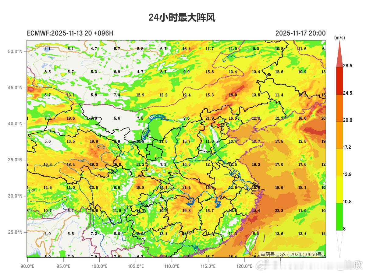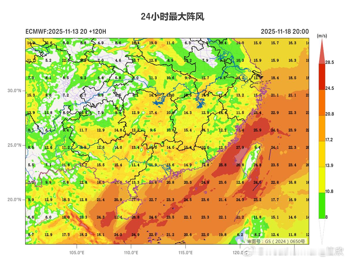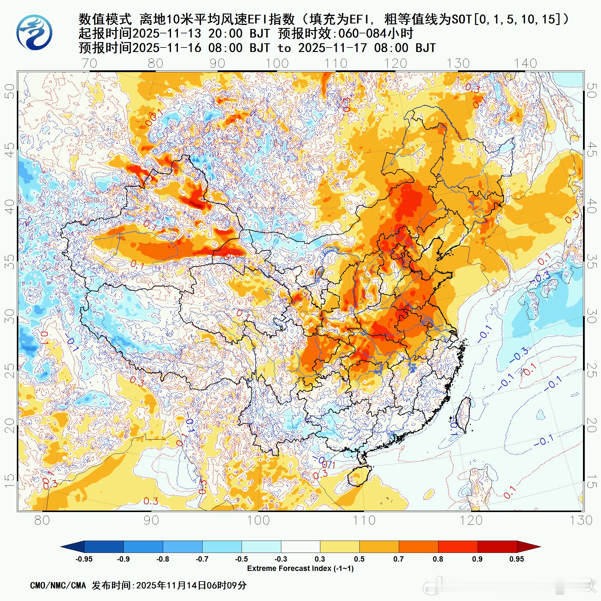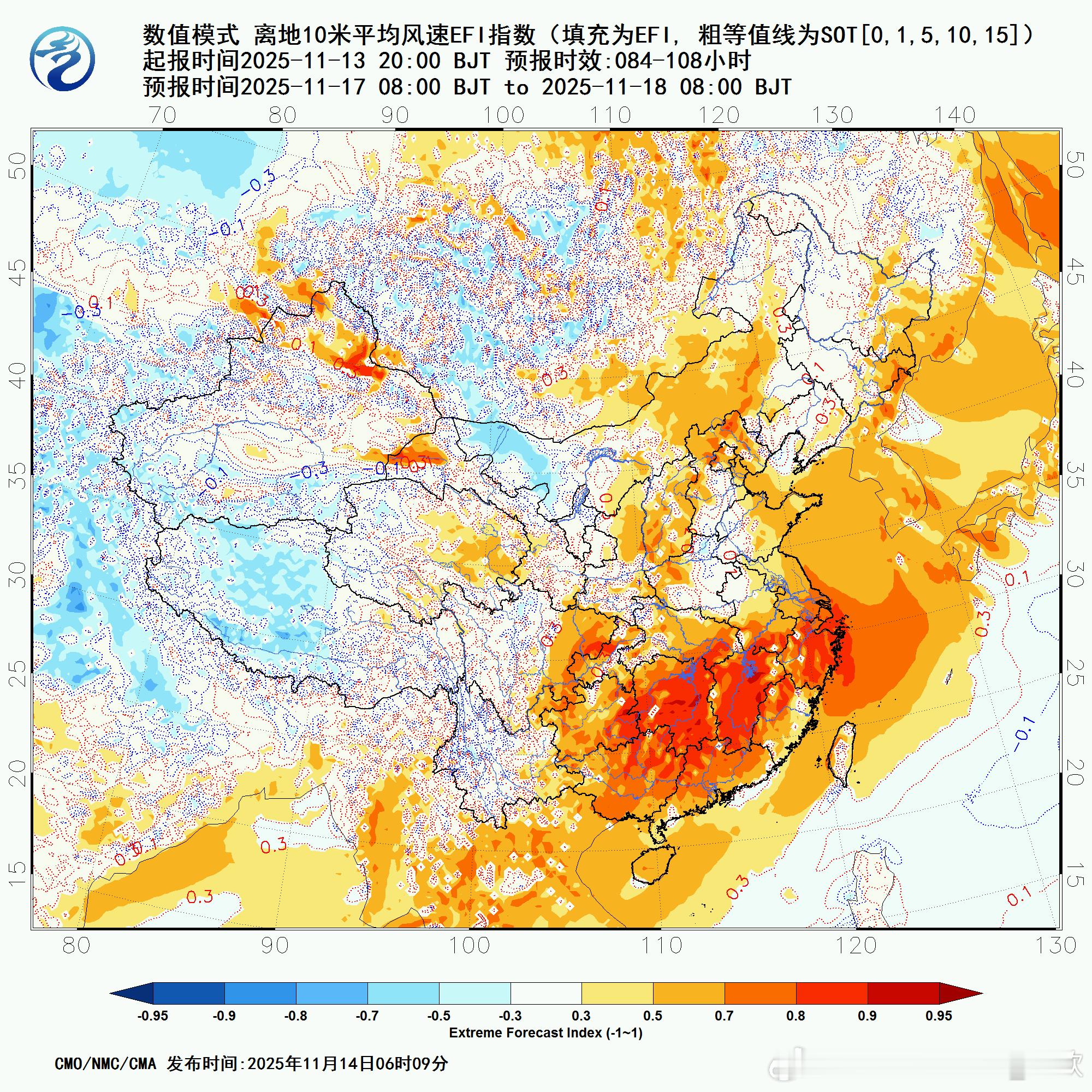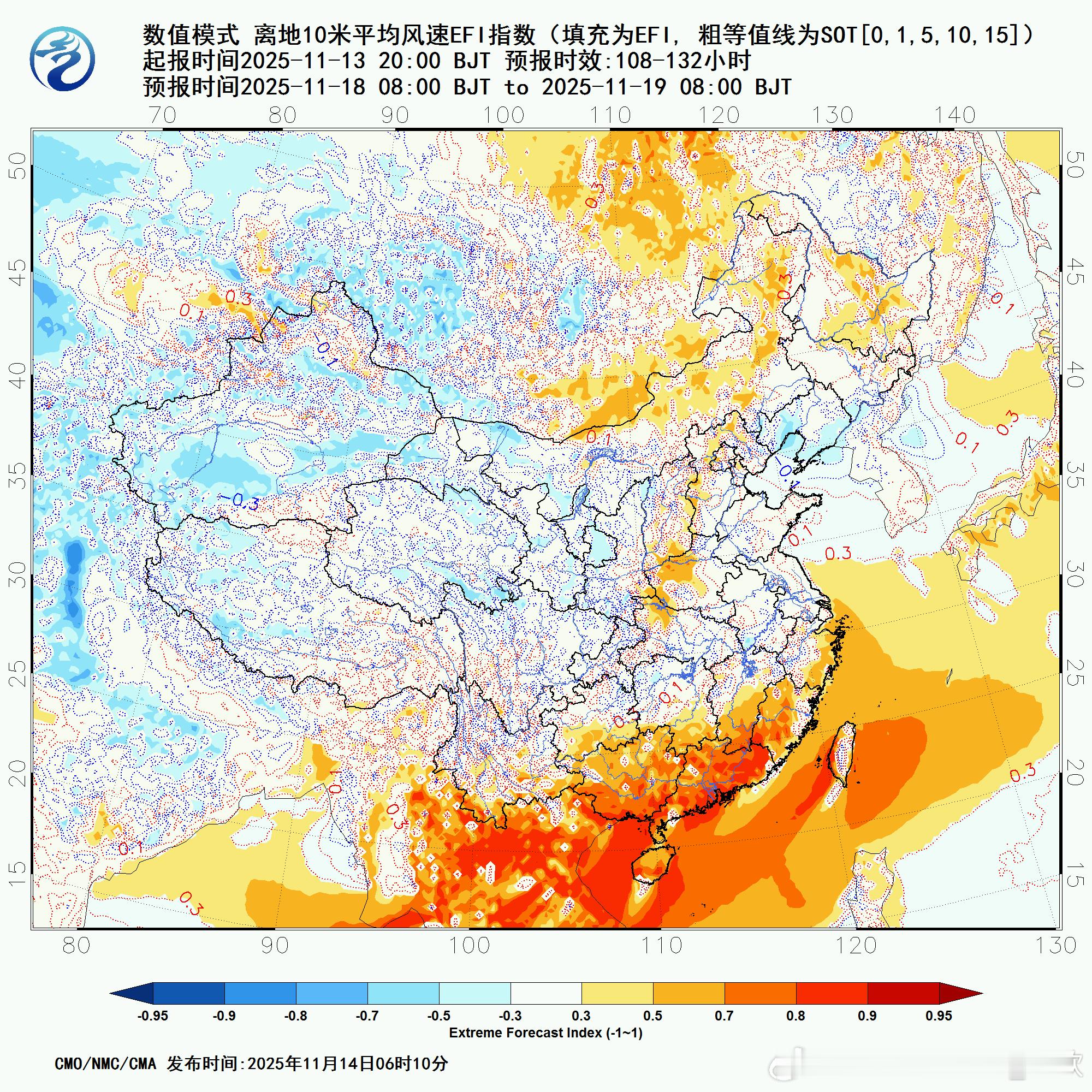本周末到下周初,寒潮将席卷我国。这次寒潮过程,大风降温为主,雨雪并不多。从天气形势看,由于环流经向度大,向南引导气流很强,冷空气南下速度快,即便到了南方,依然保留了相对强的实力,使得南方的等压线也很密集,因此不仅北方有大风,南方也会出现大风。从阵风极端指数看,17日浙江、江西、湖南,18日广东、广西部分地区的风速,同期少见。