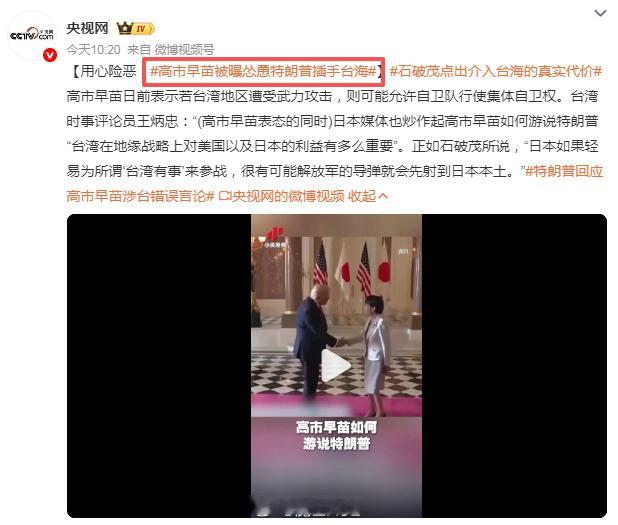 高市早苗——搞事遭秒——车力巨人!近期,搞事遭秒口嗨了一下,说蛙岛有事鬼子将出动自卫队军事介入。这到底是咋回事。这确实是这么久以来,第一个敢明确表态要军事介入蛙岛局势的鬼子首相。这一步比安倍晋三的“蛙岛有事就是日本有事”来的更直接。而后续爆料,就在搞事遭秒放这个嘴炮之前,特朗普11月10日说过一段话“我们的许多盟友也算不上是朋友,我们的盟友在贸易上占我们的便宜,比东方还要更多。”当时不知为何意,再看还真得给老川子竖个大拇指——原来搞事遭秒曾经游说特朗普公然介入蛙岛局势。然而,搞事遭秒的计谋被老川子看穿了,所以老川子才说,日本占的便宜比东方更多,回呛了日本,同时表态与东方关系很好。老川子拒绝自己顶在前面。而搞事遭秒游说老川子这么个事,是被日本《周刊邮报》给曝出来的,这个报刊,没有党派背景,但整体报道都偏保守派,与激进的麻生和搞事不是一路人。让这个报刊报这个事,就是要让舆论给搞事遭秒压力。而搞事遭秒对老川子劝进这事,非自民党内部人压根不可能知道的。所以,这是自民党内部反对激进的人,在点搞事。这不还没过几天,石破茂已经出来反对搞事遭秒了。岸田文雄作为不粘锅,派亲信表达了担忧。咱们这边还没开始发力,日本那边已经开始自己搞事了。