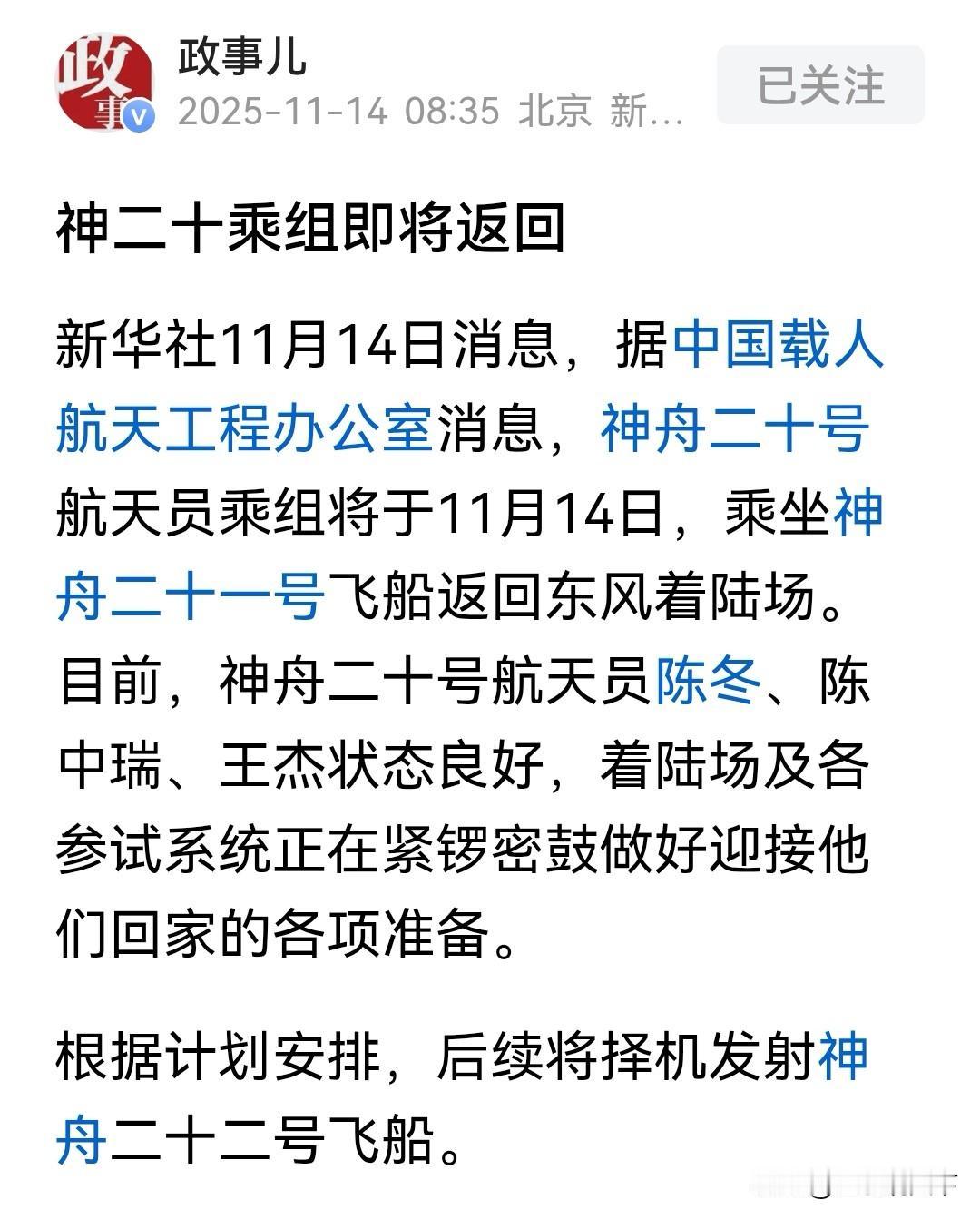 今天(11月14日), 神二十乘组要回家啦! 陈冬、陈中瑞、王杰三位航天员将搭乘神舟二十一号飞船返回东风着陆场, 目前他们状态良好,着陆场也在紧锣密鼓做准备。 等他们平安落地后, 后续还会择机发射神舟二十二号飞船, 咱们的航天征程又要开启新的篇章啦! 神舟二十一号