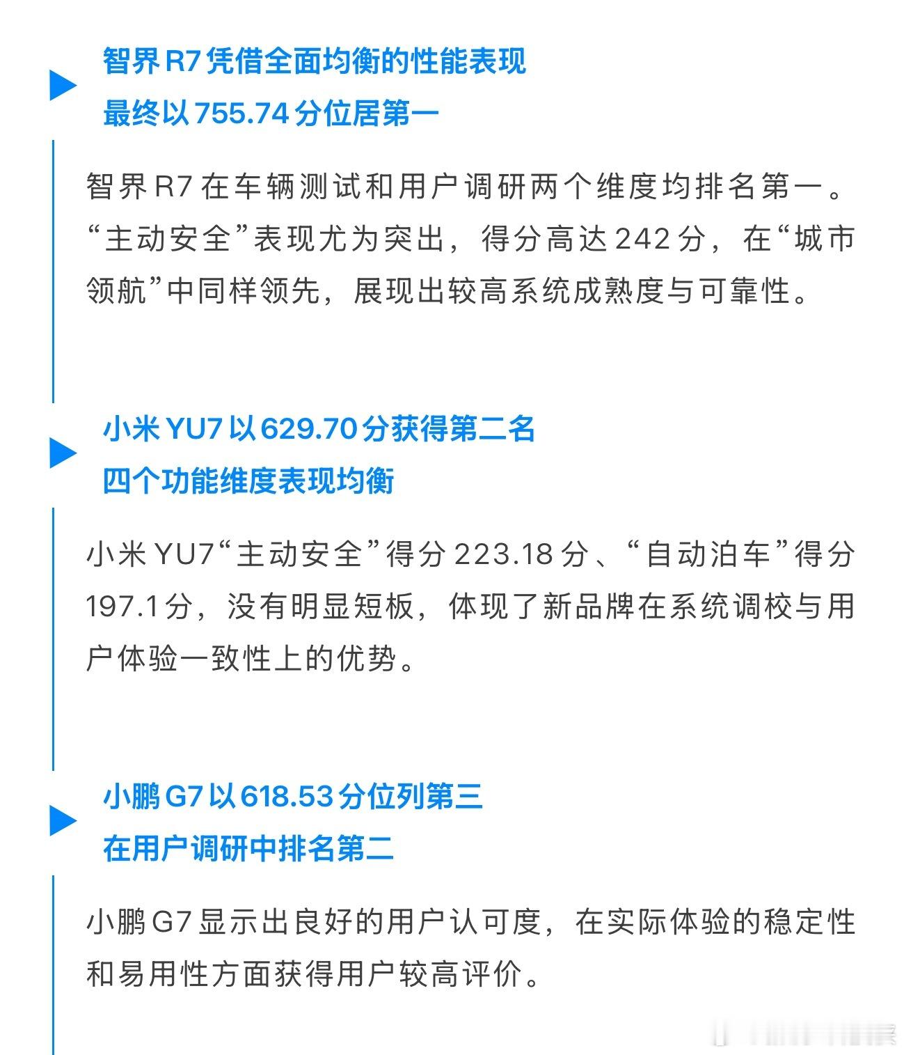 大家看没看刚出的白泽奖主流车评测?全球权威的J.D. Power和AutoLab一起评的,小米YU7直接干到总分第二!要知道这次测的都是主流市场的头部啊,不得不说小米这进步速度也太猛了。这次YU7的主动安全得分223.18分,不光技术追得快,安全这块也没含糊。而且这次评测的都是主流市场的尖子生,小米这位新生的辅助驾驶从第一辆交付到现在也就不到2年,能杀出重围拿第二,足以看出小米做智驾的决心。现在看小米辅助驾驶已经彻底挤进行业前列了,比国内特斯拉FSD表现还好。照这投入力度和升级速度,那小米后续的新版本肯定更能打,未来可期。
