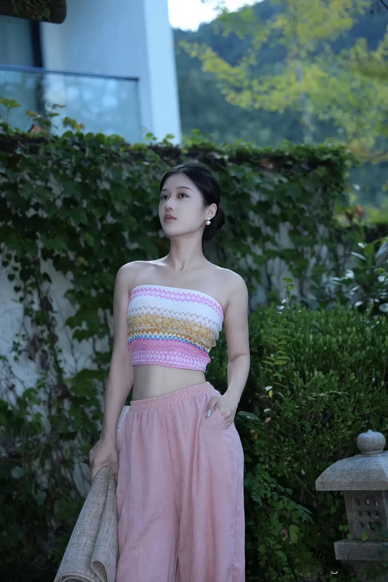 小姐姐的穿搭好清爽!白色开叉上衣+浅蓝喇叭裤,搭粉包包温柔又随性,日常这么穿舒服
