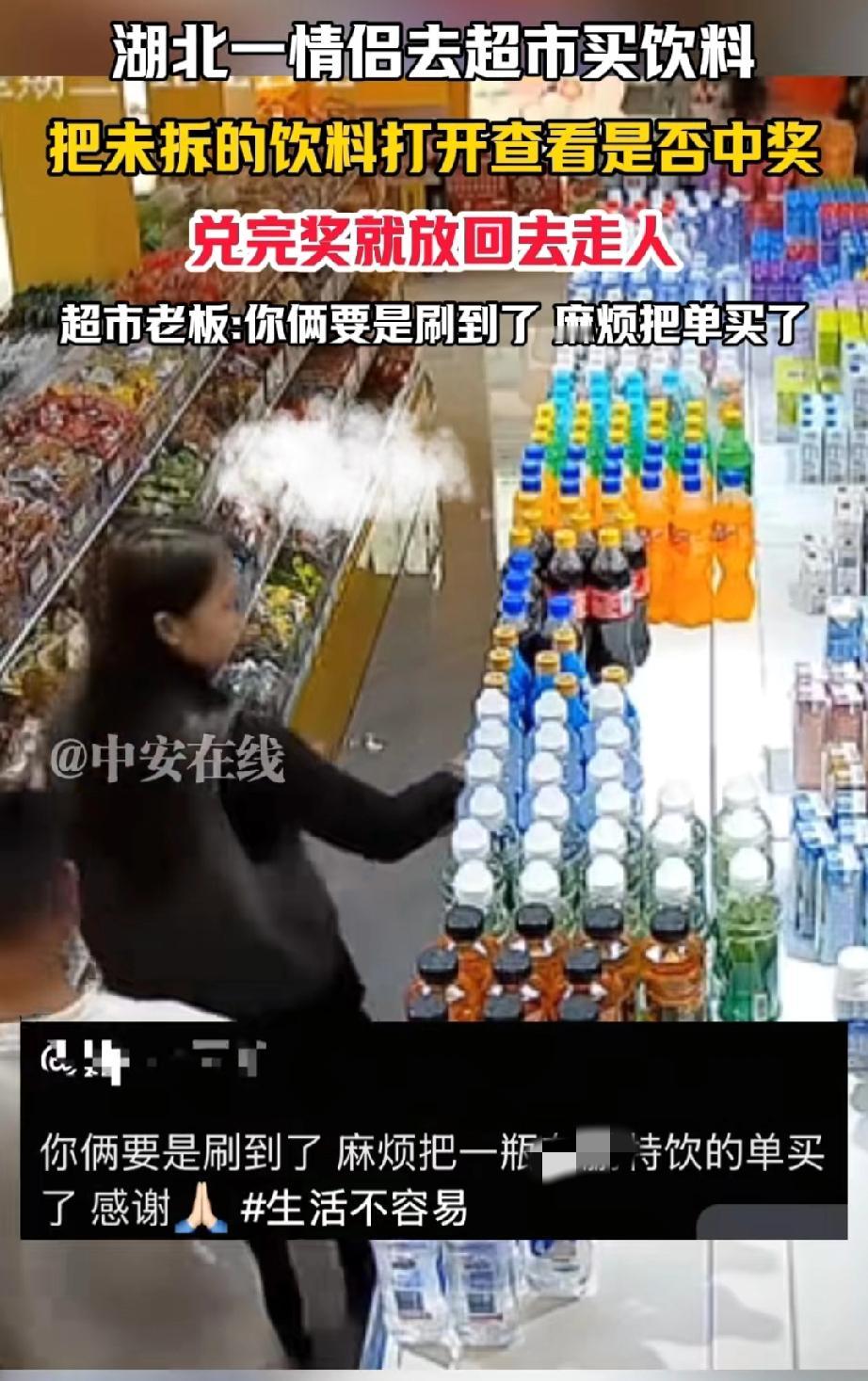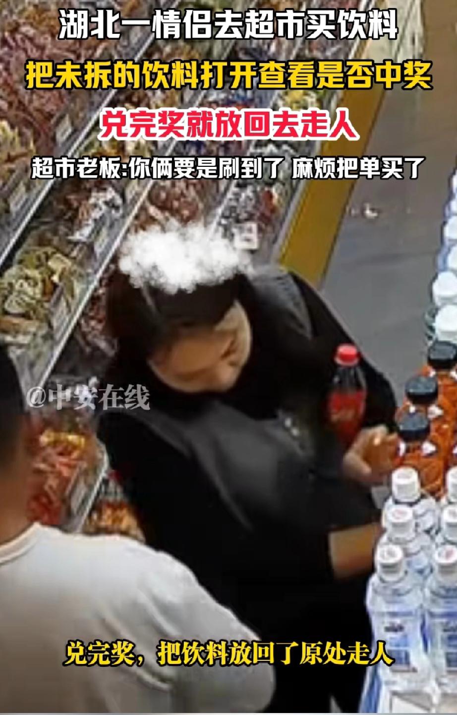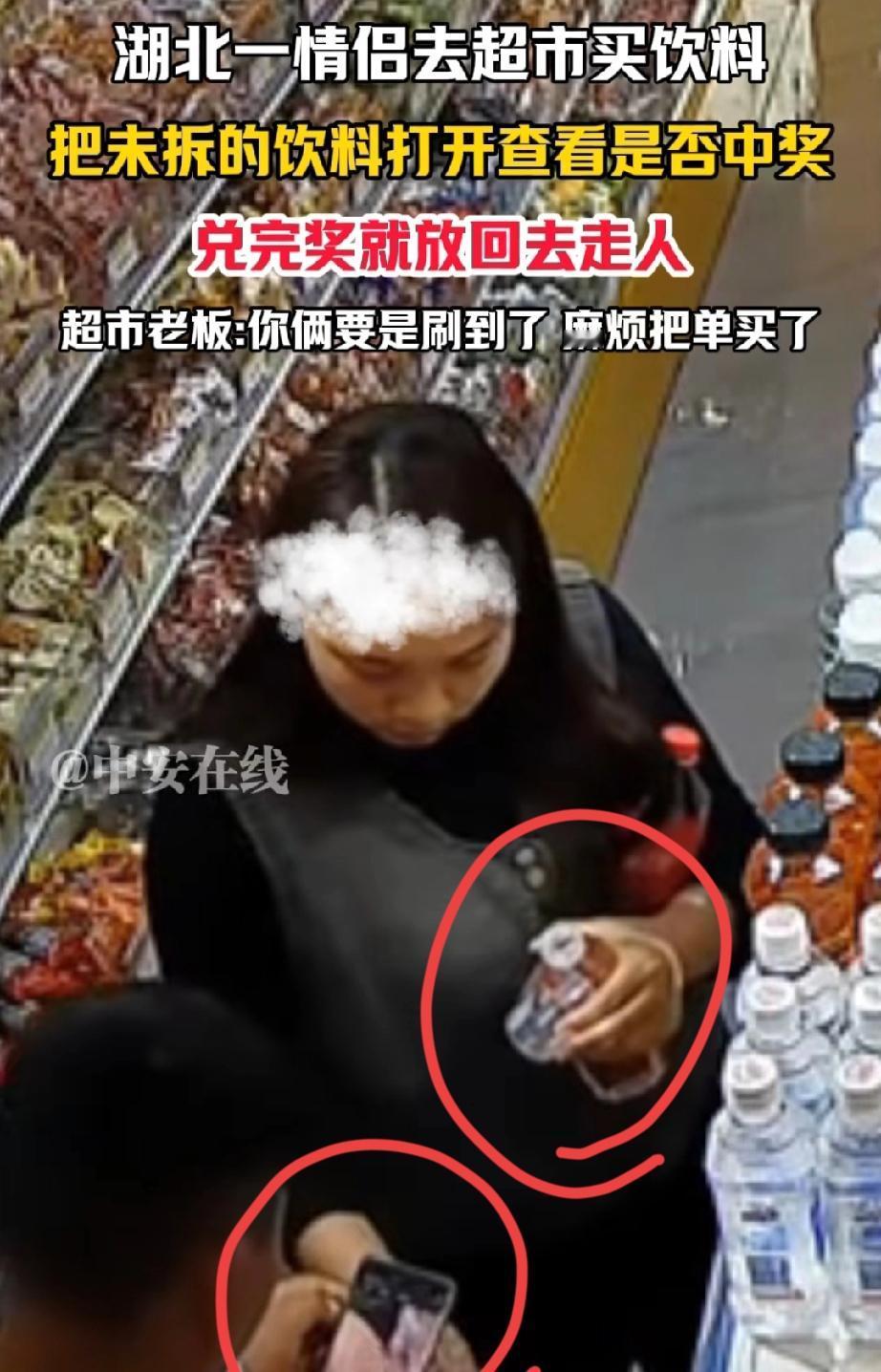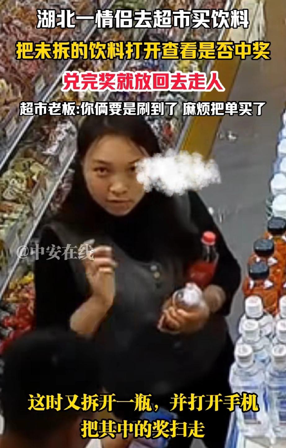 湖北,有一对情侣走进超市。男子拿起一瓶饮料,拧开后看了看,又把饮料放了回去。女子抬眼瞥了一下监控,随后也拿起一瓶饮料拧开。 女子拿着饮料盖,男子则用手机扫码。 之后,女子把饮料盖子重新盖好,放回原处,然后和男子一同离开了超市。 女子抬头看见有监控,还能若无其事的继续手中的事情,是心里根本就不怕被抓到,还是觉得超市不会因为两瓶饮料,而去追究他们的责任吗? 这对情侣,会不会一边遛弯,一边去不同的超市做同样的事情呢? 据超市老板表示,他们这么做是为了扫码中奖。若这对情侣看到此视频,请回到超市结清饮料的钱,小本生意,大家都过得不容易。 这对情侣长相端正,穿着得体,看样子并不缺钱。他们这般行为,难道仅仅是为了找点乐子? 毕竟饮料扫码中奖,奖金也不会太多。 请不要为了占这点小便宜,让自己既丢了面子,又失了里子。 来源:中安在线