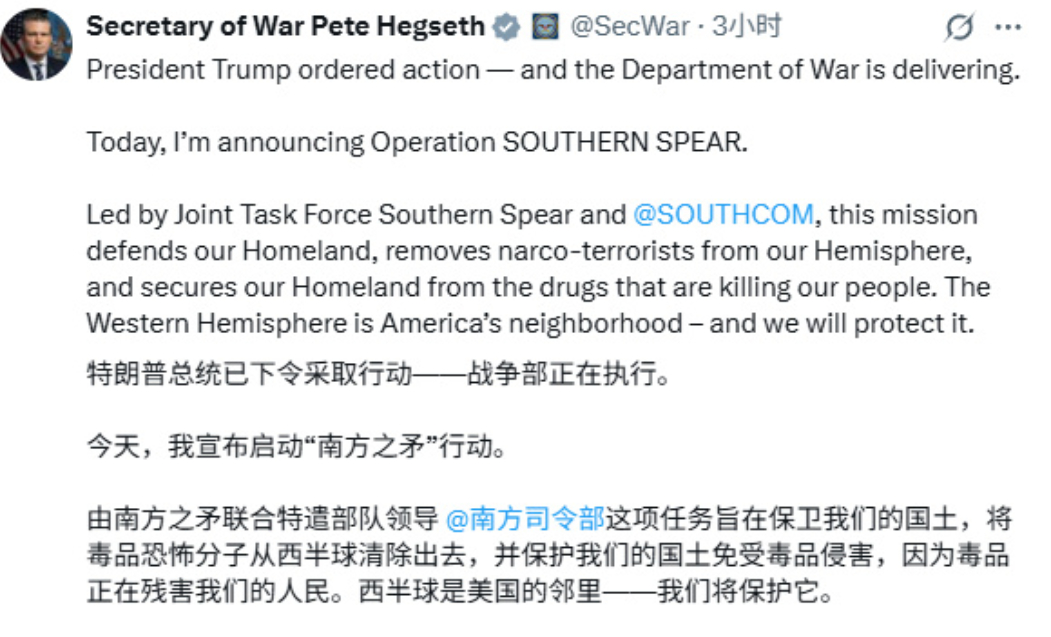 开战! 行动代号:“南方之矛”!【特朗普发出在委内瑞拉的实施军事 行动命令】特朗普批准恢复在委内瑞拉的军事行动方案,下令对委内瑞拉发起“南方之矛”行动!