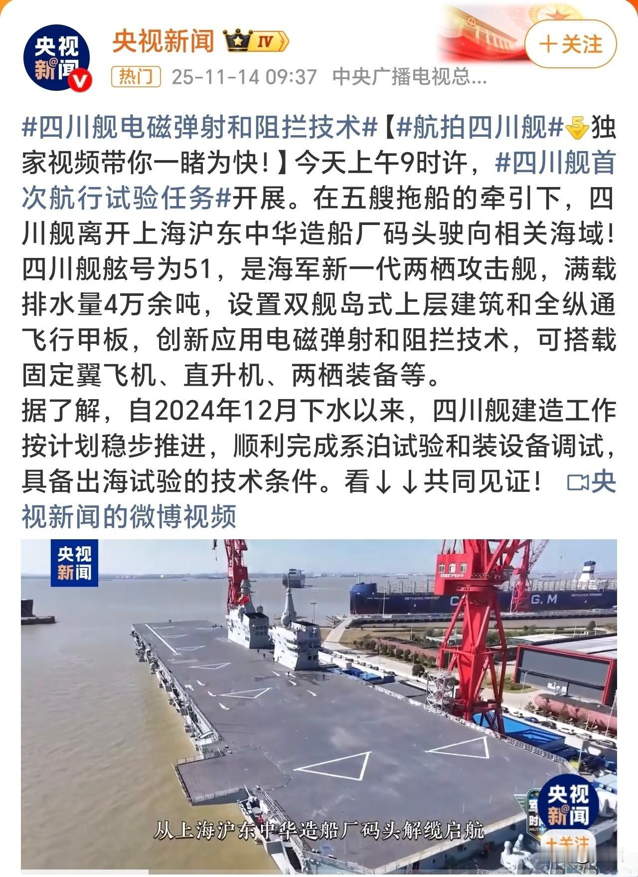 四川舰开启航行实验! 四川舰4万余吨(至少余1万多),电磁弹射,拦阻索回收,可搭载固定翼飞机,独立航空指挥舰岛。 但是请注意,这是两栖攻击舰,可不是中型航母啊,更不是航母