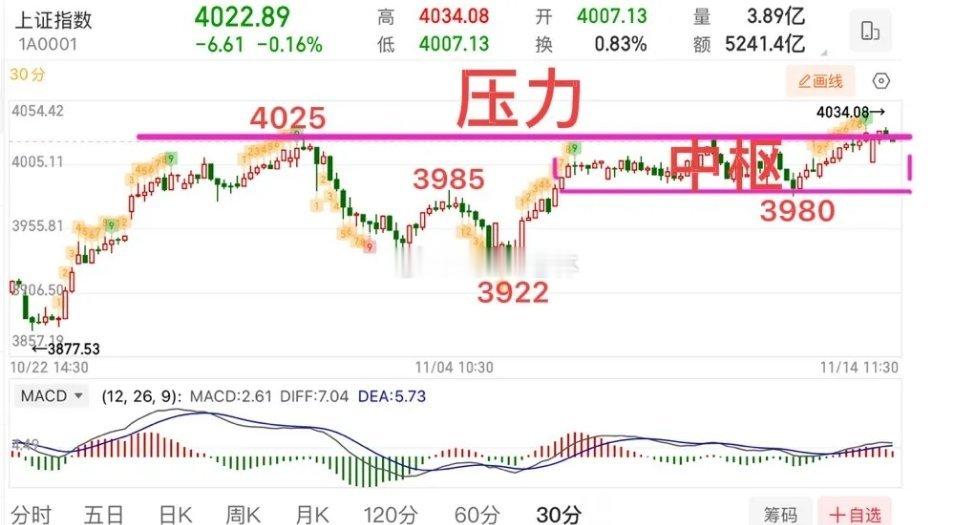2025.11.14周五午评: 4000点上方无量很难持续,注意节奏! 大盘指数开盘受外盘影响低开下探,随后有一波快速反抽,但力度有限,成交量方面未明显放大,故而降低指数预期,4000点之上不激进操作。 技术面看,上证指数虽创新高,但并不能有效突破站稳4025,仅仅只是创新高几个点是不够的,很容易掉回中枢继续震荡,所以在没有有效突破站稳前高做出3买(突破前高回踩不进)之前,还是要保留一份谨慎。当前仍当作中枢震荡看待,以中枢为核心,关注上下轨,观察后续如何变盘! 策略上,震荡行情,做“短”为主,有大拉的注意要做T,有盈利要知道落袋为安!切不可坐电梯回来。 个股,继续跟踪有资金介入的个股方向去挖掘 只关注“涨”的,不跟“跌”的玩。 只做这三种战法模式:试盘线/缺口突破/形态突破。 个人观点,仅供参考!