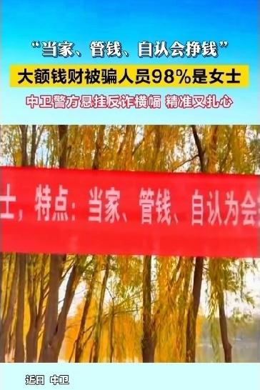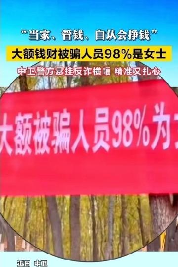 当家主母们速来围观! 宁夏中卫警方悬挂反诈横幅: 大额被骗人员98%为女士,特点:当家、管钱、自认为会挣钱!谨慎网络交友、网上投资、刷单退费! 问一下有没有和我一样怂的,不喜欢管钱,手里现金多了就焦虑,钱都是这存一点那存一点,就因为支付宝放了些钱,很多链接根本不敢点,陌生电话也不敢接,原本是想存定期的,但这几年银行定期起点高而且收益也不算高,只能放手机里了,啥时候我先生若说要存,我一定高高兴兴的给他…… 我说的都是真的,比起当家主母我确实不要太怂……[马思纯的微笑][马思纯的微笑][马思纯的微笑]