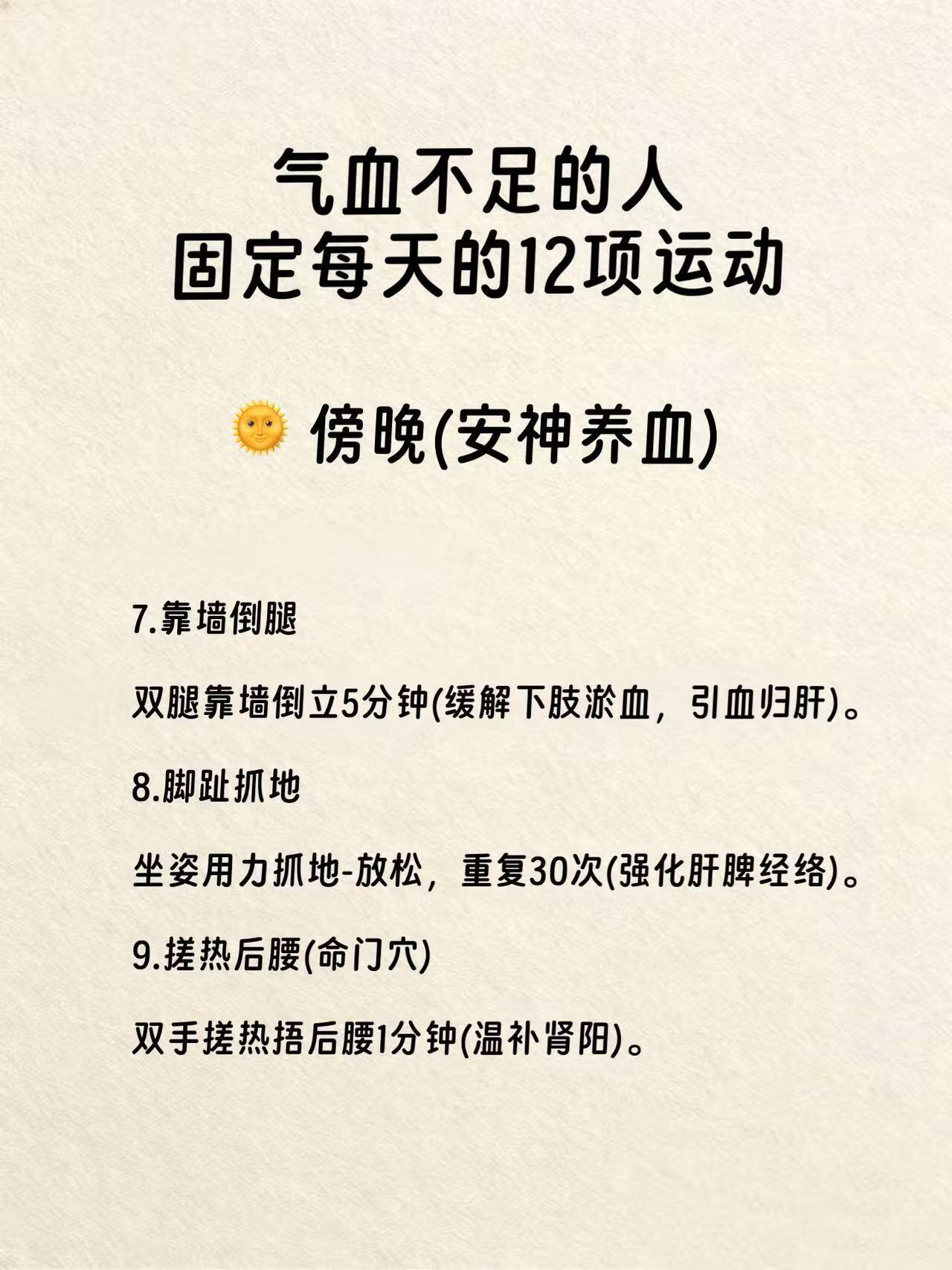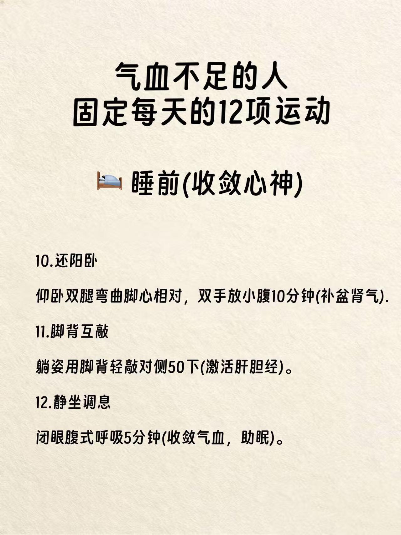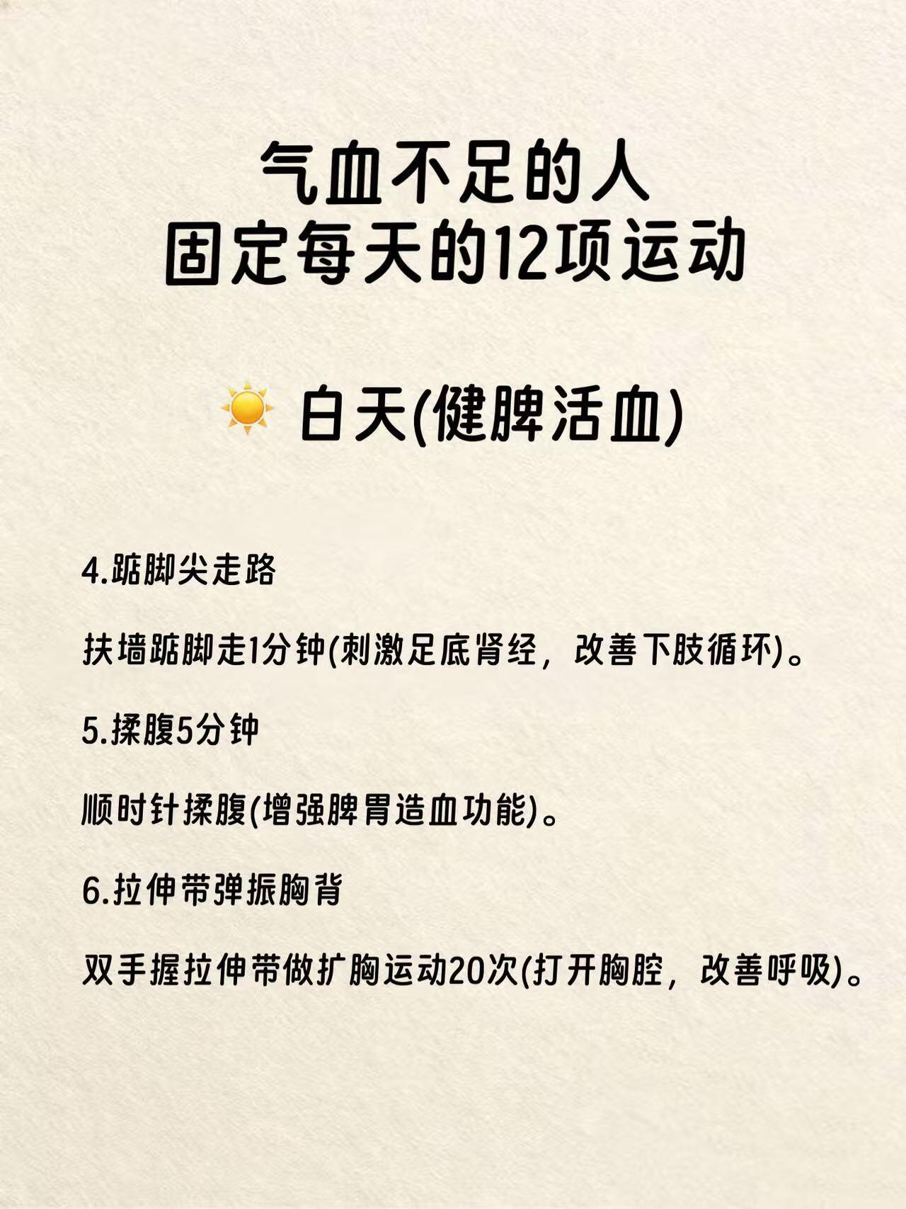 气血不足的人,每天固定的12个运动对于气血不足的人群,每天适当的运动要以“补气养血、疏通经络、不耗能量”为主,避免剧烈或长时间运动导致气血进一步损耗。我自己试了几个月,给姐妹们总结出了这12个每日固定做的简单运动,分为早晨、白天、晚上三个阶段,温和调理气血:🌅 早晨(升发阳气) 🌞 白天(健脾活血) 🌙 傍晚(安神养血) 🛌 睡前(收敛心神)⚠️ 关键提醒运动顺序:按从“升发→疏通→收敛”的节奏进行,符合气血运行规律。禁忌:避免出汗过多、过度拉伸、早晨空腹运动。搭配建议:运动后可以喝一点桂圆红枣茶,或吃3颗蒸红枣补血。坚持这套动作1个月,会明显感觉手脚回暖、精神集中、睡眠变深。气血不足的人运动就像“给蜡烛挑亮灯芯”,动作越柔和,效果越持久。